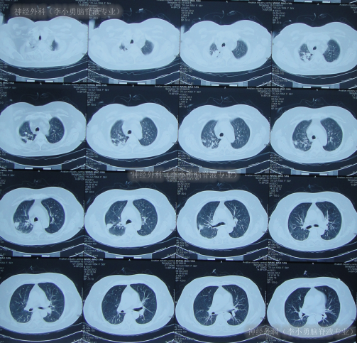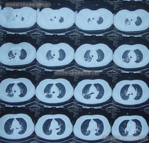 第2家医院出院1月余即2012年2月7日,夜里起夜突然又重复发作以前的症状(恶心呕吐、头昏),且比前2次发作严重,2012年2月8日住入第3家医院:呼和浩特市某三甲医院的神经外科治疗,入院查头颅CT(图-2)和MRI(图-3);脊髓核磁(图-4);肺部CT(图-5)及多次腰椎穿刺脑脊液化验检查(糖低、蛋白高),诊断为:结核性脑膜炎,脑积水。