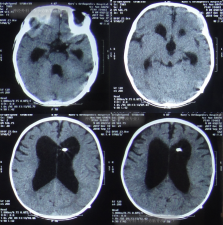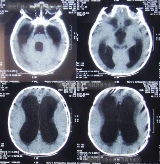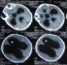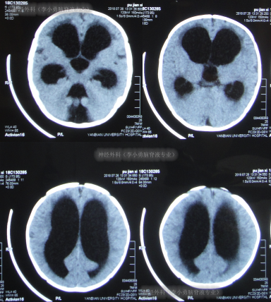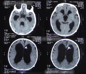 但出院后2天即2018年7月26日,晨起患儿双眼出现对眼,喂奶后再次喷射性呕吐,就诊于第2家医院:吉林省珲春市某医院,检查后认为患儿较重建议转院,于是当天就诊于上级的第3家医院:吉林省延边市某三甲医院,查头颅CT示脑积水(图-1)。