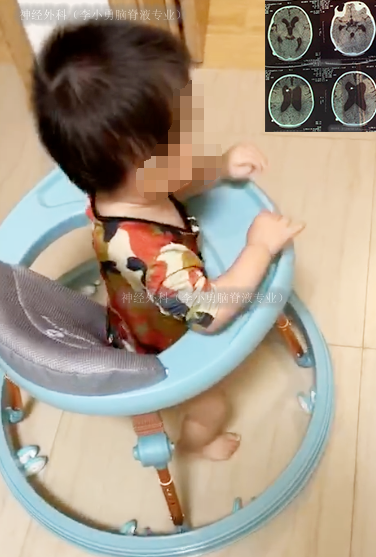 出院后3个月即2019年1月10日,宝宝1岁1个月,家属通过微信发来视频和检查的头颅CT示无异常,视频中宝宝坐在学步车里,快速的来回走动(图-10)。