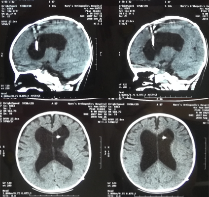 入院当天进行了脑室外引流术,术后第1天即2018年7月29日,查头颅CT示脑室引流术状态(图-4)。
