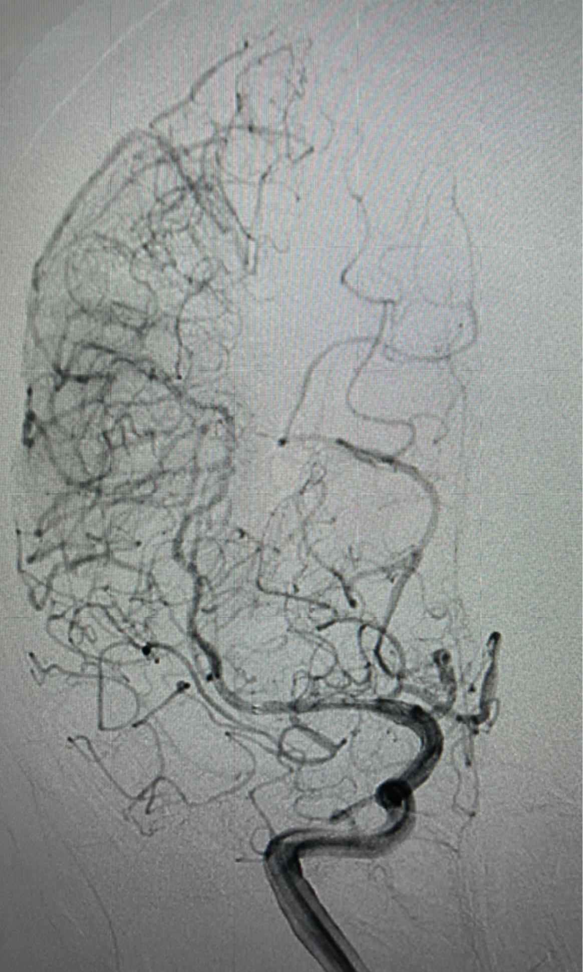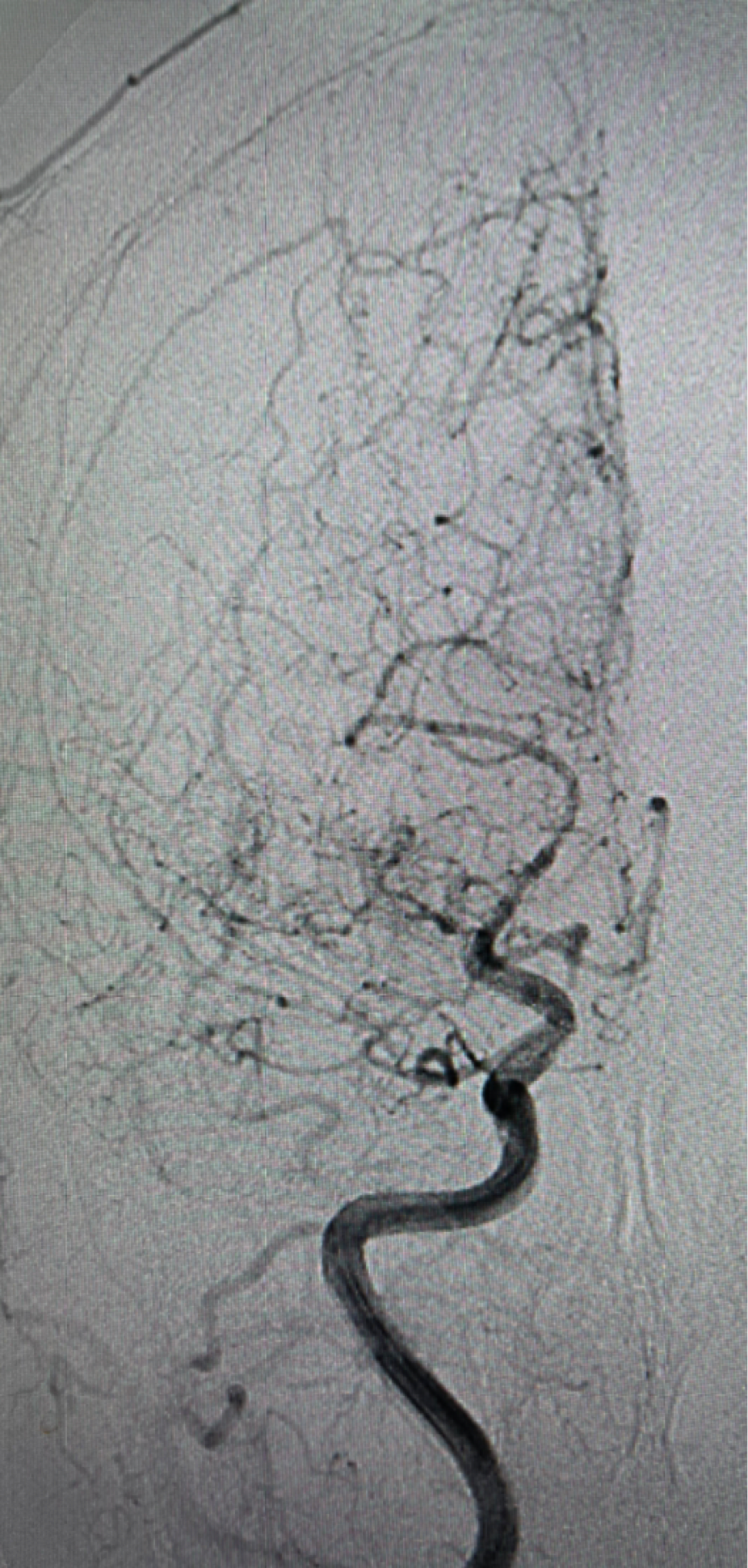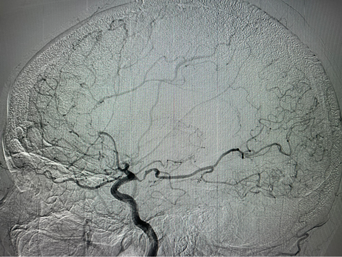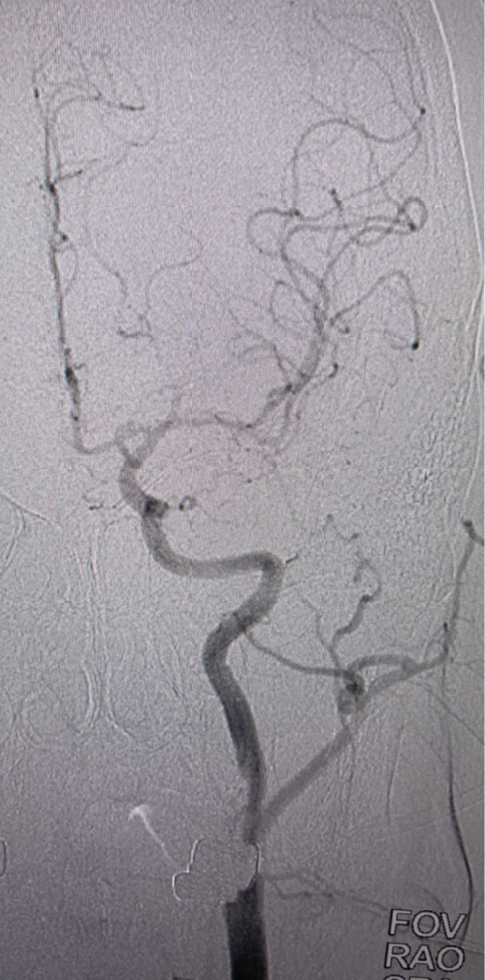 右侧颈内动脉造影提示大脑中动脉起始以远闭塞