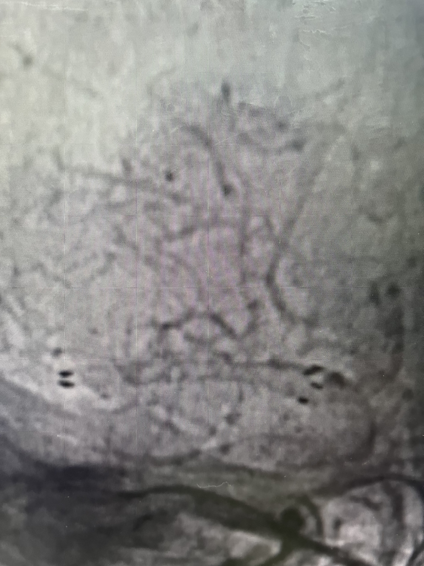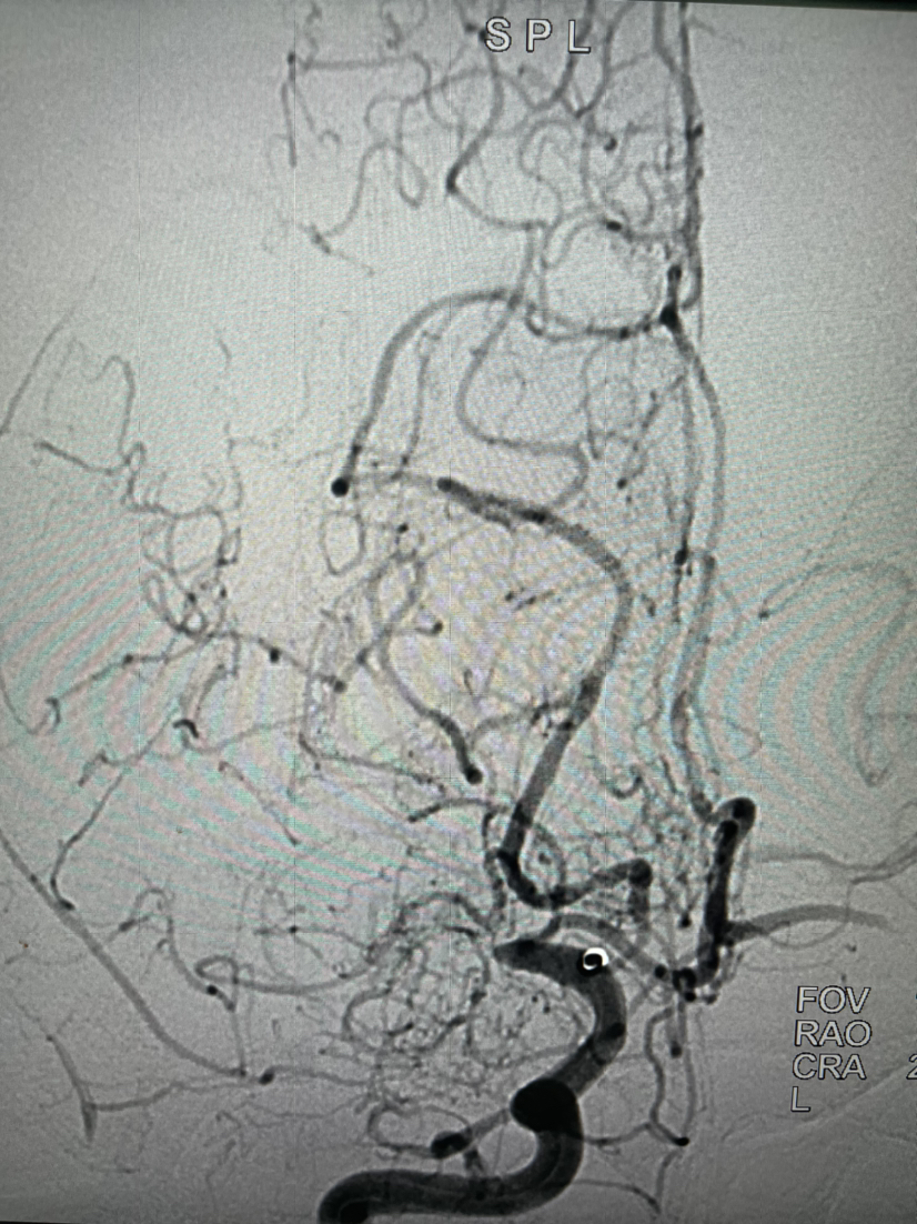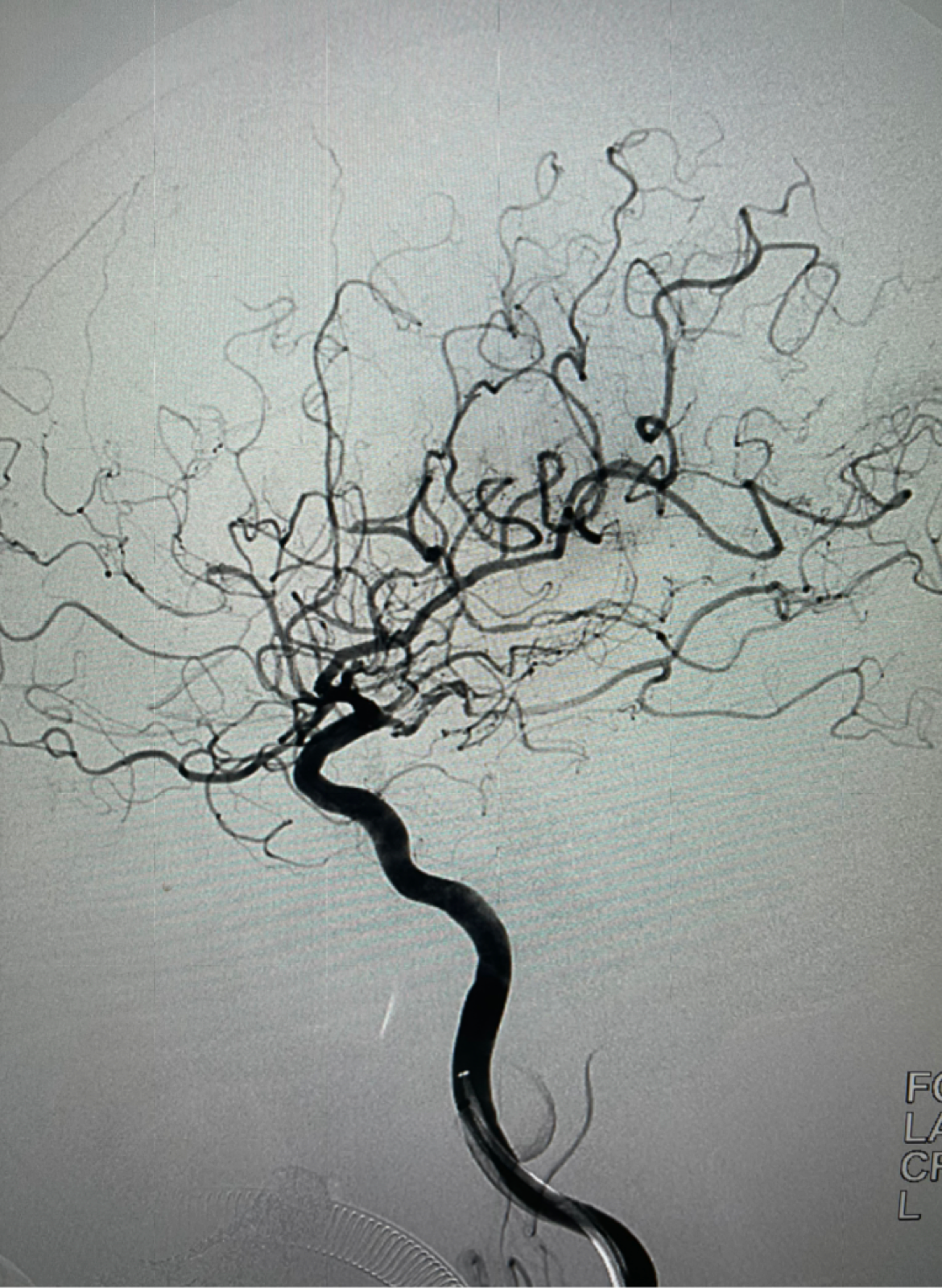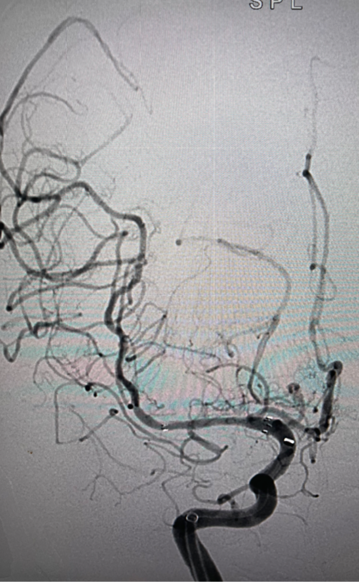 右侧颈内动脉造影提示大脑中动脉起始以远闭塞