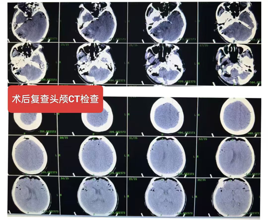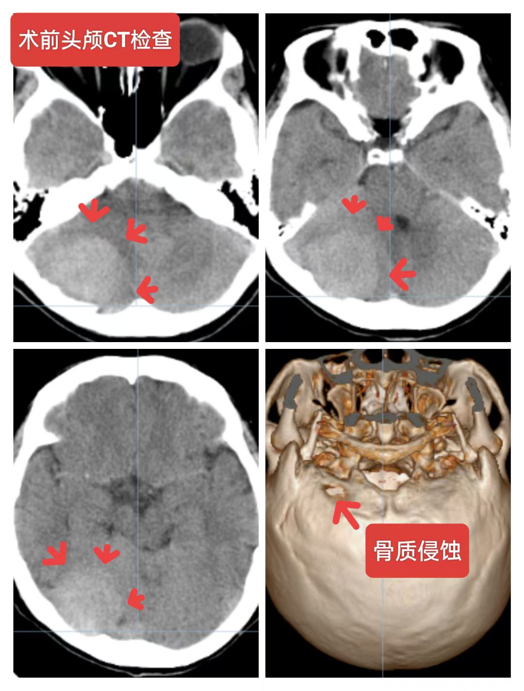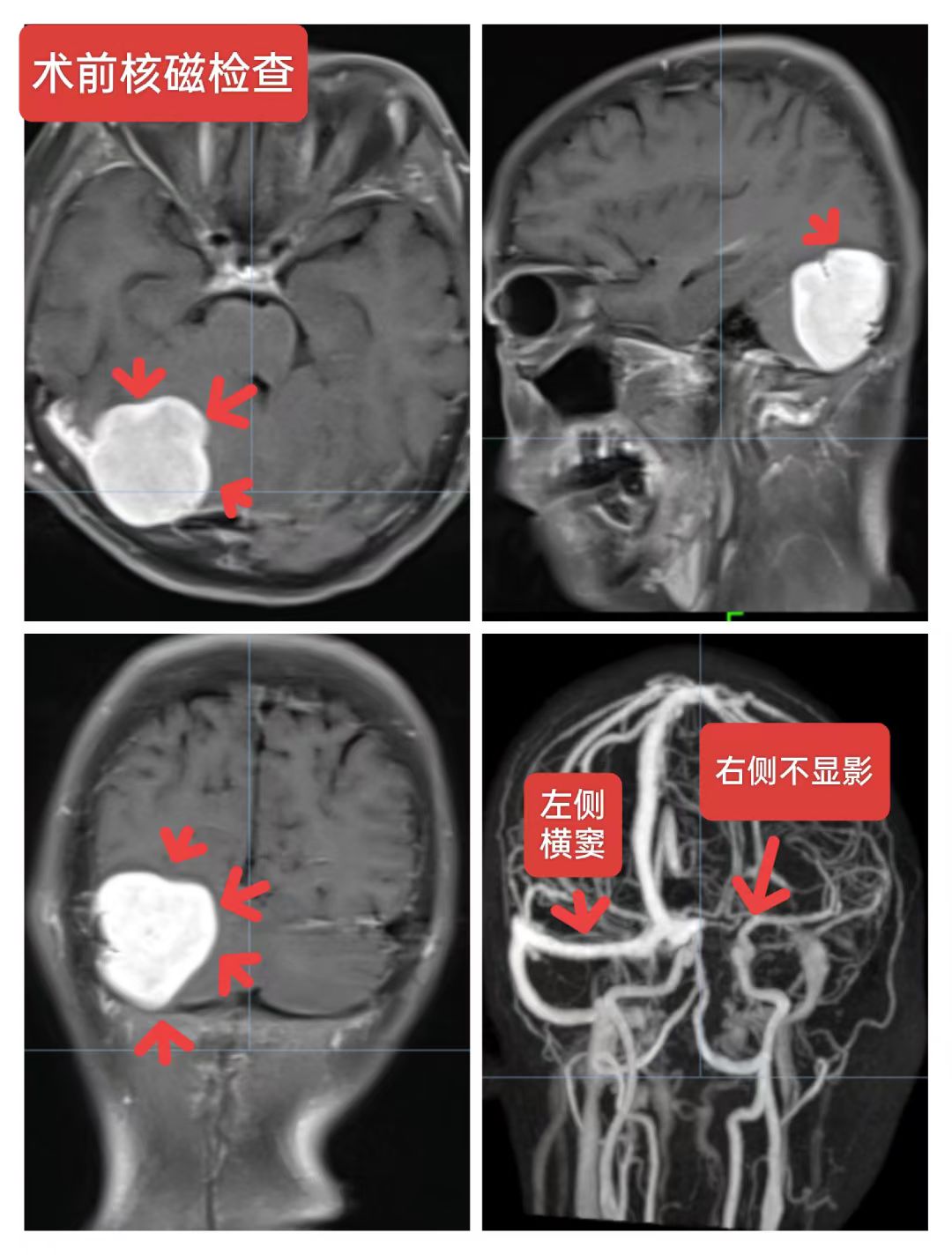 右侧小脑半球脑膜瘤:患者56岁女性,间断性头痛一年,加重一周入院,头颅核磁提示:右侧小脑半球脑膜瘤,压迫横窦,侵蚀天幕向幕上生长,术中见肿瘤质地韧,肿瘤突破硬脑膜,局部骨质破坏,横窦壁有侵蚀,窦壁少量残留,侵蚀硬脑膜及肿瘤全切除,取人工硬脑膜修补缝合,目前患者恢复良好。