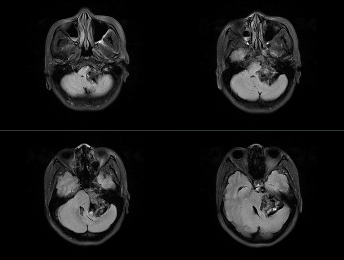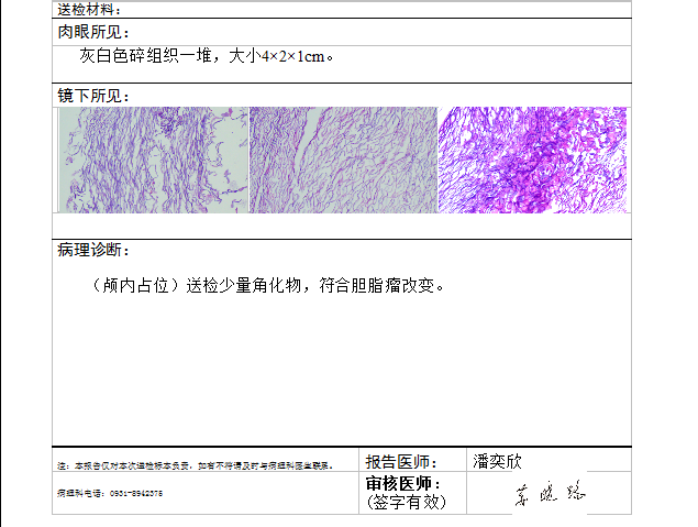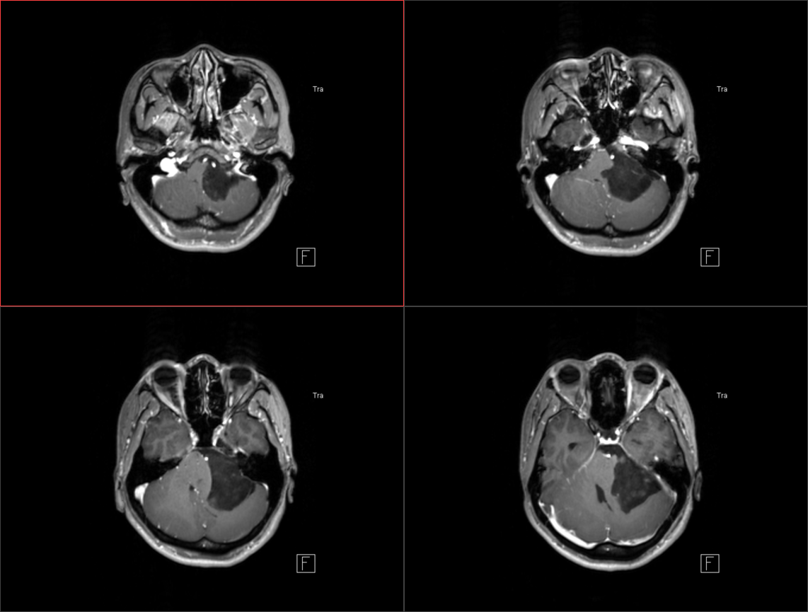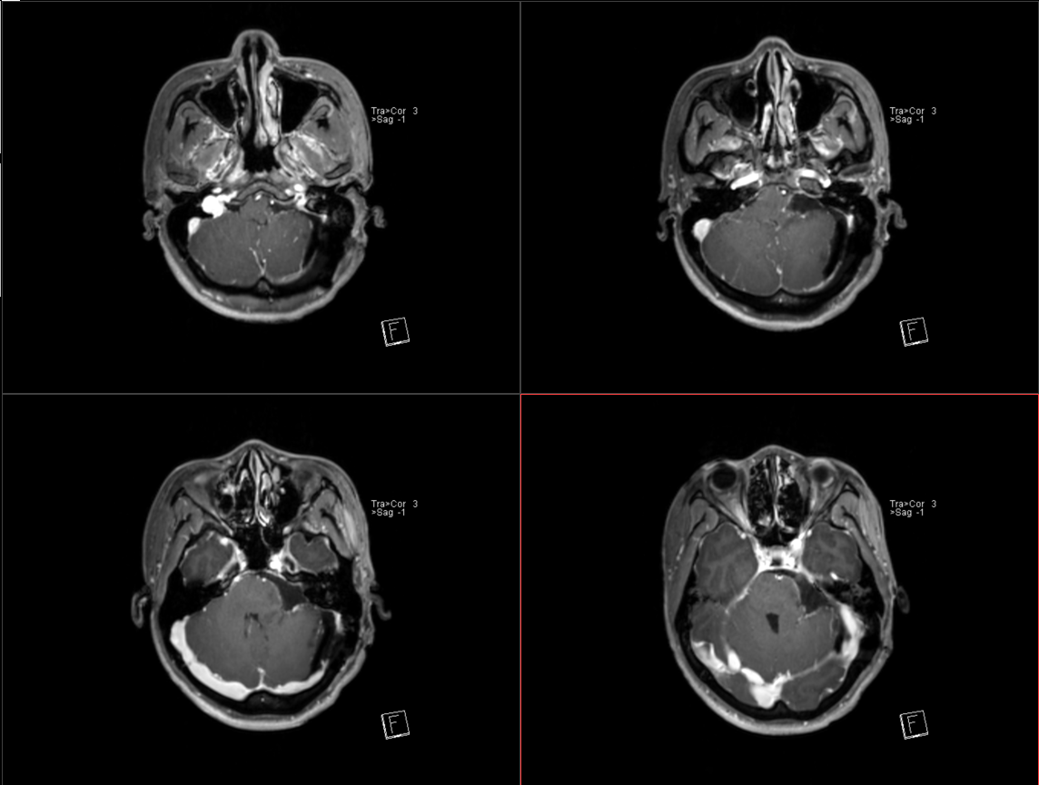 患者于入院前半年无明显诱因出现头痛、头晕,较剧烈,可耐受,无恶心、呕吐,无意识丧失,口服“止痛药(具体药名、剂量不详)”后症状稍缓解,入院前1周上述症状较前加重,患者前往当地医院就诊,行头颅MR示:1.左侧桥小脑角区占位,结合平扫及增强,现多考虑:皮样或表皮样囊肿。2。幕上梗阻性脑积水、脑室轻度积水。3.右侧上颌炎。现转至我院就诊。