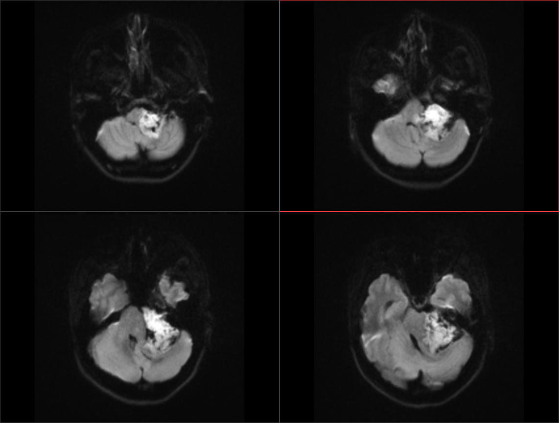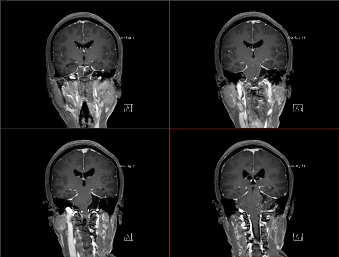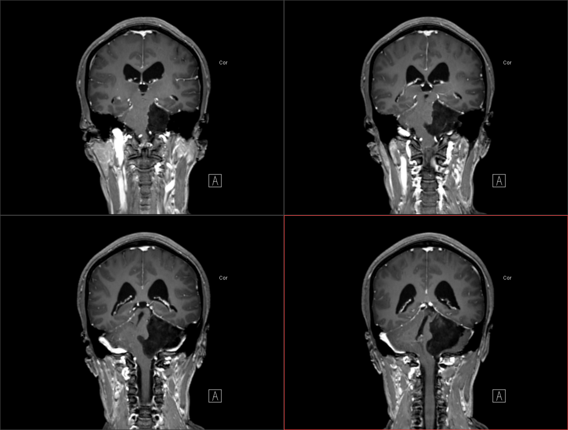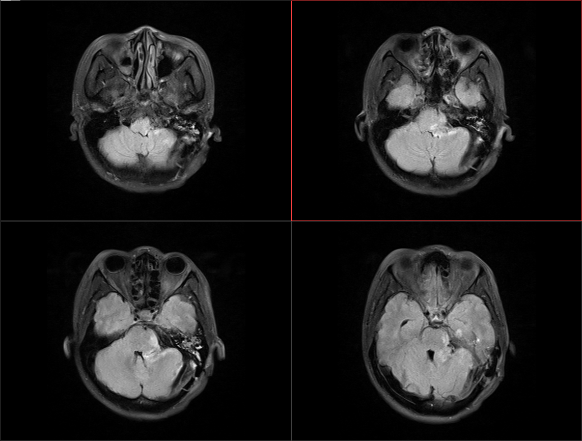 患者于入院前半年无明显诱因出现头痛、头晕,较剧烈,可耐受,无恶心、呕吐,无意识丧失,口服“止痛药(具体药名、剂量不详)”后症状稍缓解,入院前1周上述症状较前加重,患者前往当地医院就诊,行头颅MR示:1.左侧桥小脑角区占位,结合平扫及增强,现多考虑:皮样或表皮样囊肿。2。幕上梗阻性脑积水、脑室轻度积水。3.右侧上颌炎。现转至我院就诊。
