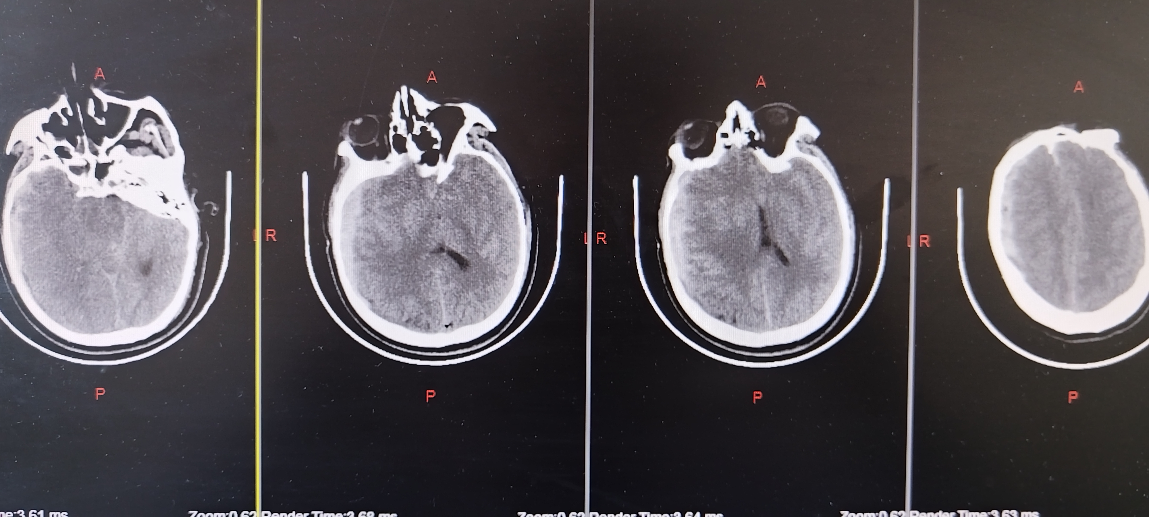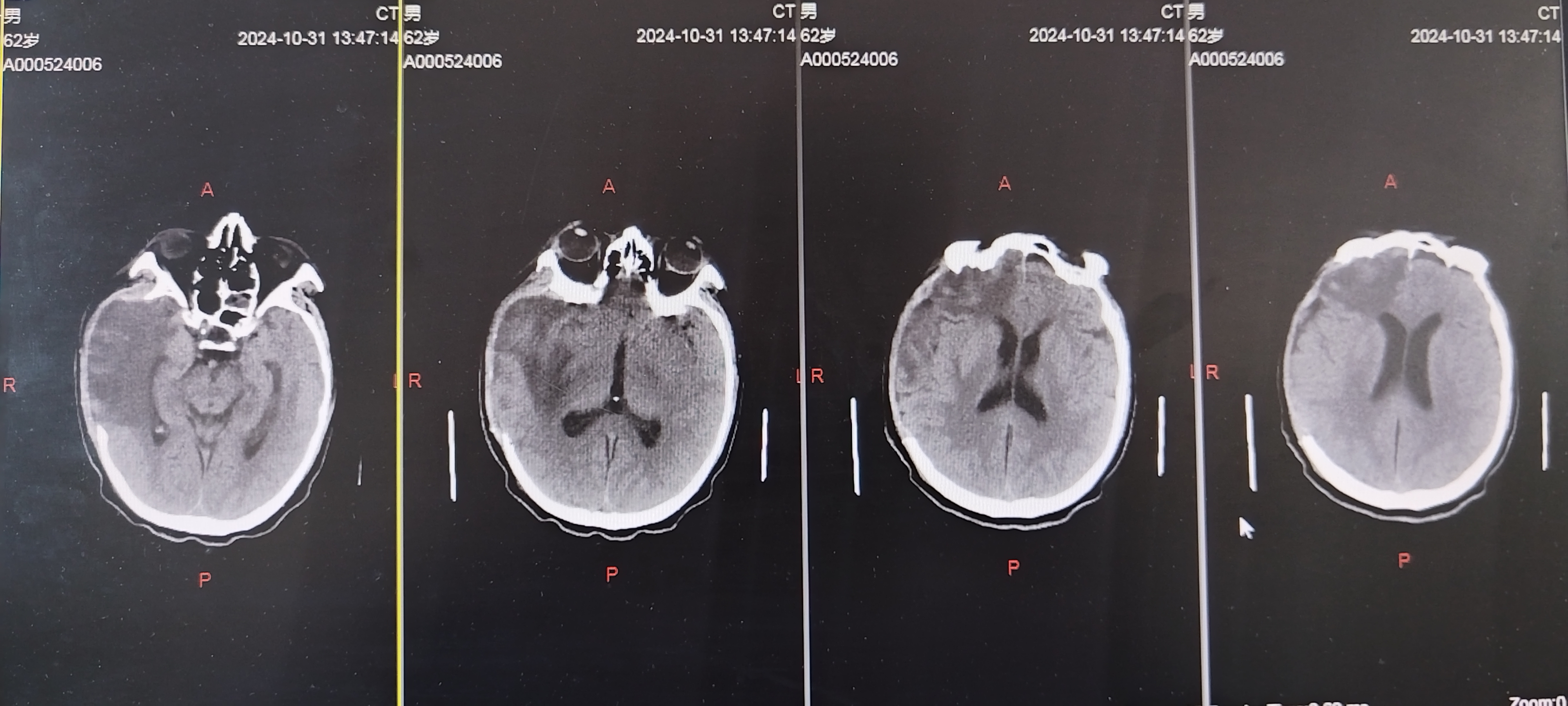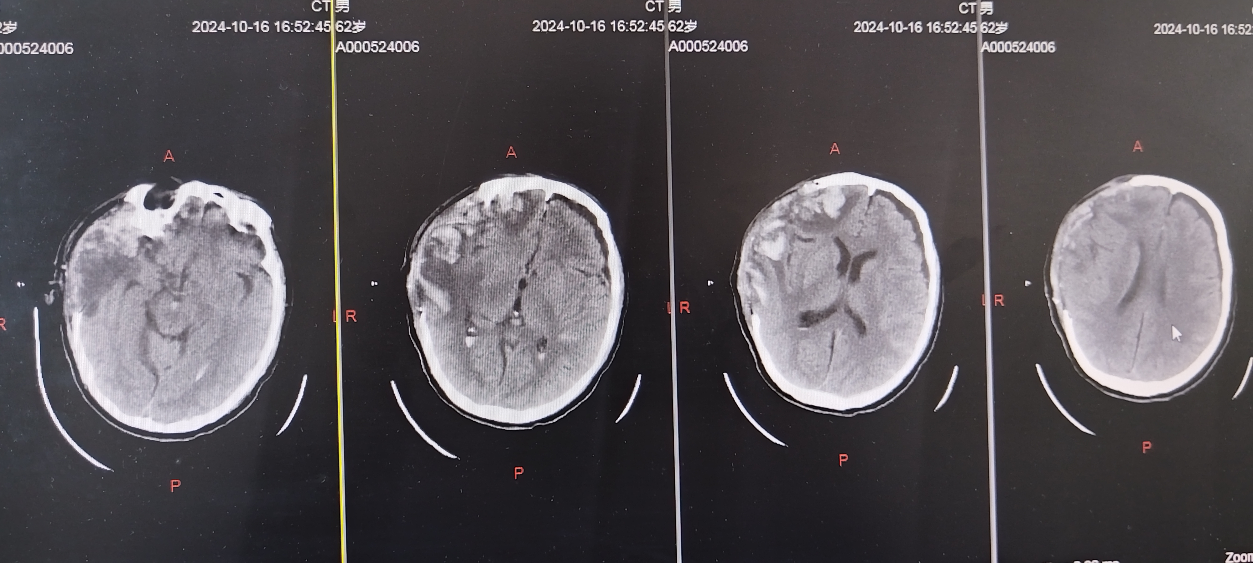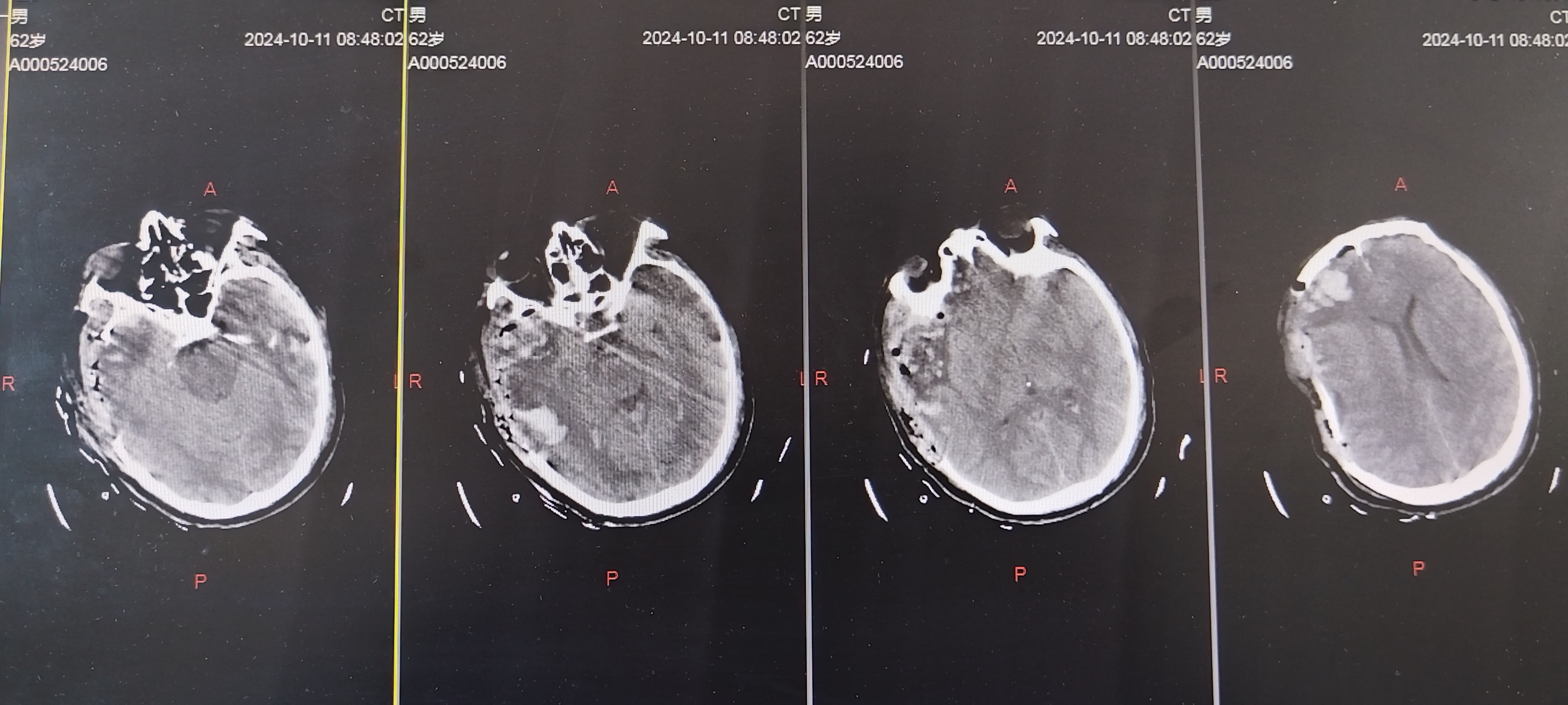 头部外伤后意识不清约1.5小时入院。既往体健。患者1.5小时前不慎摔倒致头部受伤,当即意识不清,急诊查头颅CT显示右侧额颞顶硬膜下血肿,蛛网膜下腔出血,左侧后颅凹骨折,中线移位,脑疝可能。查体:深昏迷,E1V1M1,双侧瞳孔不等大左:右约4.0mm:1.5mm,对光反射消失,口含口咽通气道,四肢肌张力不高,生理反射减退,双侧病理征(+)。 术后1天复查CT 术后1周复查CT 术后3周复查CT