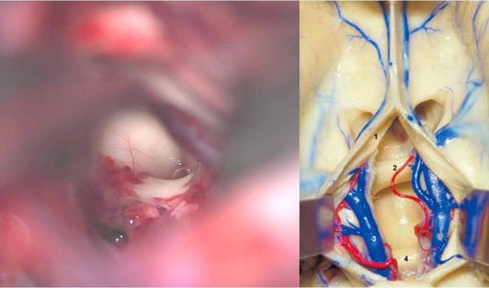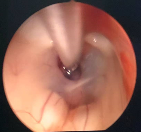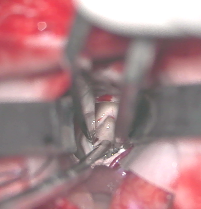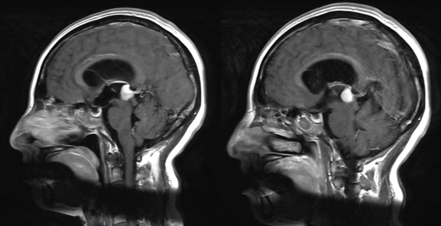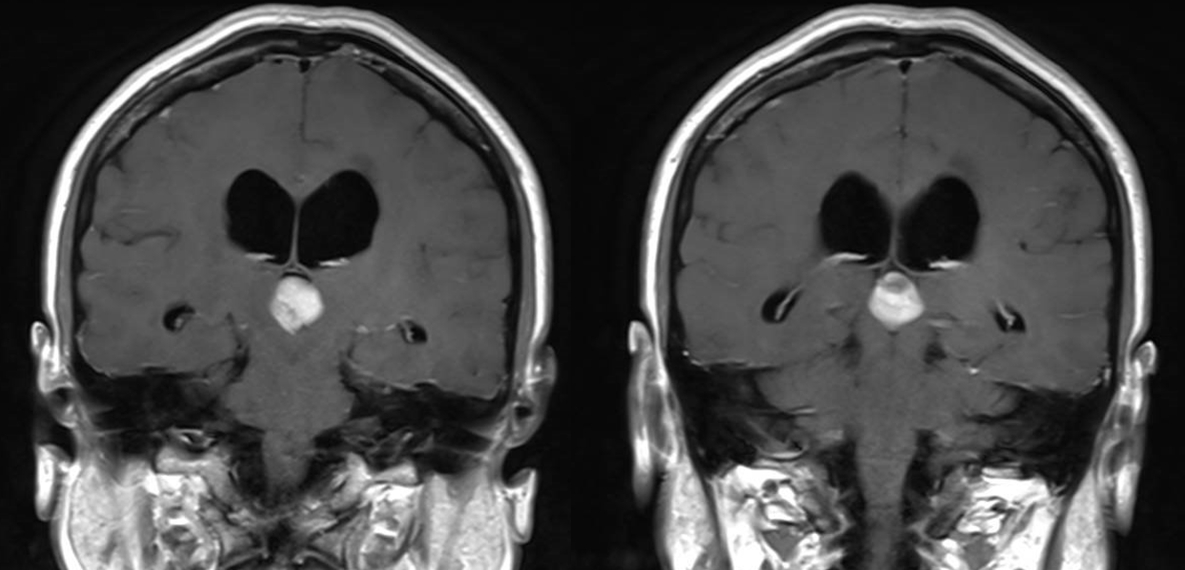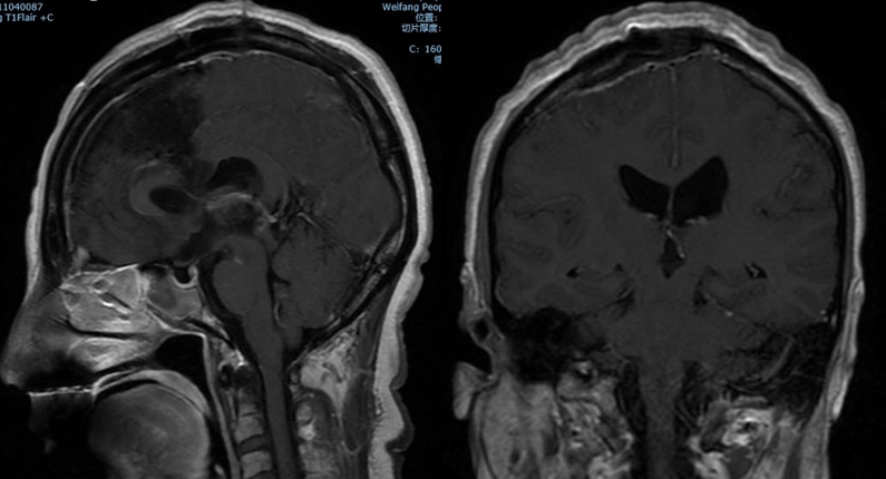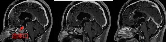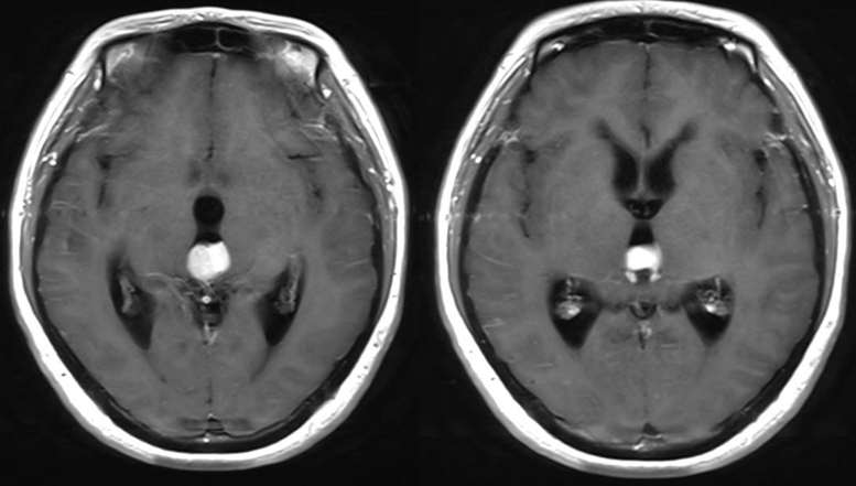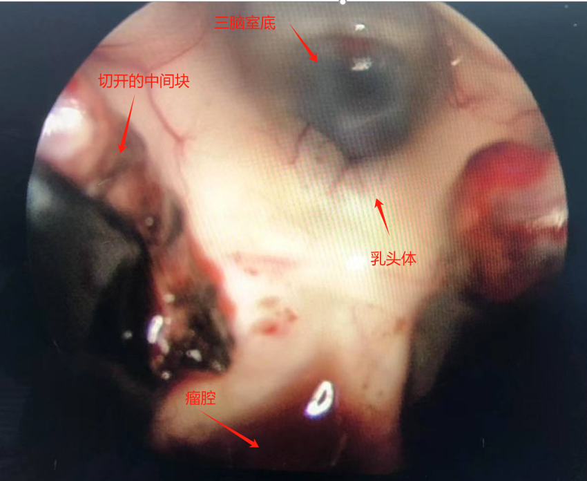 诊治过程:结合患者临床表现及影像学表现,初步诊断考虑为三脑室后部胶质瘤合并梗阻性脑积水可能性大,术前制定的手术方案为经胼胝体穹隆间入路三脑室后部肿瘤切除术+脑室镜辅助下三脑室底造瘘术,该手术方式既可切除肿瘤获取病理,同时可行三脑室底造瘘解决脑积水症状。术中采用冠状缝前额部弧形切口,术中沿纵裂牵开双侧大脑半球,探及胼胝体,沿中线切开胼胝体,分离双侧透明隔,暴露双侧穹隆,严格沿中线分离双侧穹隆,保护两侧穹隆的完整,避免引起术后的记忆力障碍,牵拉开双侧穹隆,进入中间帆,显露并分离双侧大脑内静脉继续向下,经脉络膜隔进入三脑室,完全显露肿瘤组织,肿瘤组织呈灰红色,血供极其丰富,与中脑黏连紧密,仔细分离,分块全切肿瘤,双侧大脑内静脉及中脑保护良好,中脑导水管通畅。肿瘤完全切除后,考虑到术后局部粘连、肿瘤复发等因素可能导致脑积水不缓解,置入脑室镜向前方探查,小心切开中间块,在双侧乳头体与漏斗隐窝之间,行三脑室底部造瘘并打开Liliequist膜及基底动脉旁蛛网膜,确认漏口通畅且与脚间池相通。患者术后恢复过程平稳,颅脑MRI提示肿瘤切除满意,脑积水缓解。术后病理结果示:中枢神经细胞瘤(2级)。术后予以放疗GTV 5400cGy、PTV 5040cGy,28f。现术后已3年,复查未见肿瘤复发,脑积水已完全缓解。