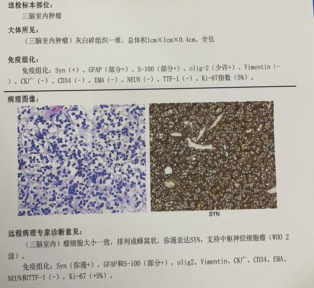 中枢神经细胞瘤 (central neurocytoma,CNC)是一种少见的神经来源的脑室内肿瘤,属 WHO 分级2级。 CNC多生长于脑室,以侧脑室最好发,多数肿瘤位于室间孔附近、侧脑室透明隔或侧脑室壁。少数可发生于胼胝体、穹窿、尾状核头部、丘脑和小脑,脑室外也有发生,但极为罕见。本例肿瘤位于三脑室后部,也比较少见。中枢神经细胞瘤的治疗以手术为主,若能手术全切除,可获得良好的治疗效果,若手术不能全切,术后辅以局部放疗能明显增加局部控制率,亦有研究报道伽玛刀治疗能明显增加残留肿瘤的控制率。