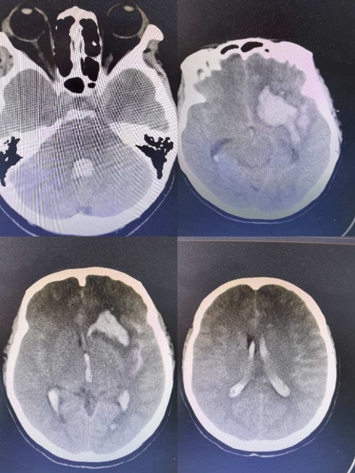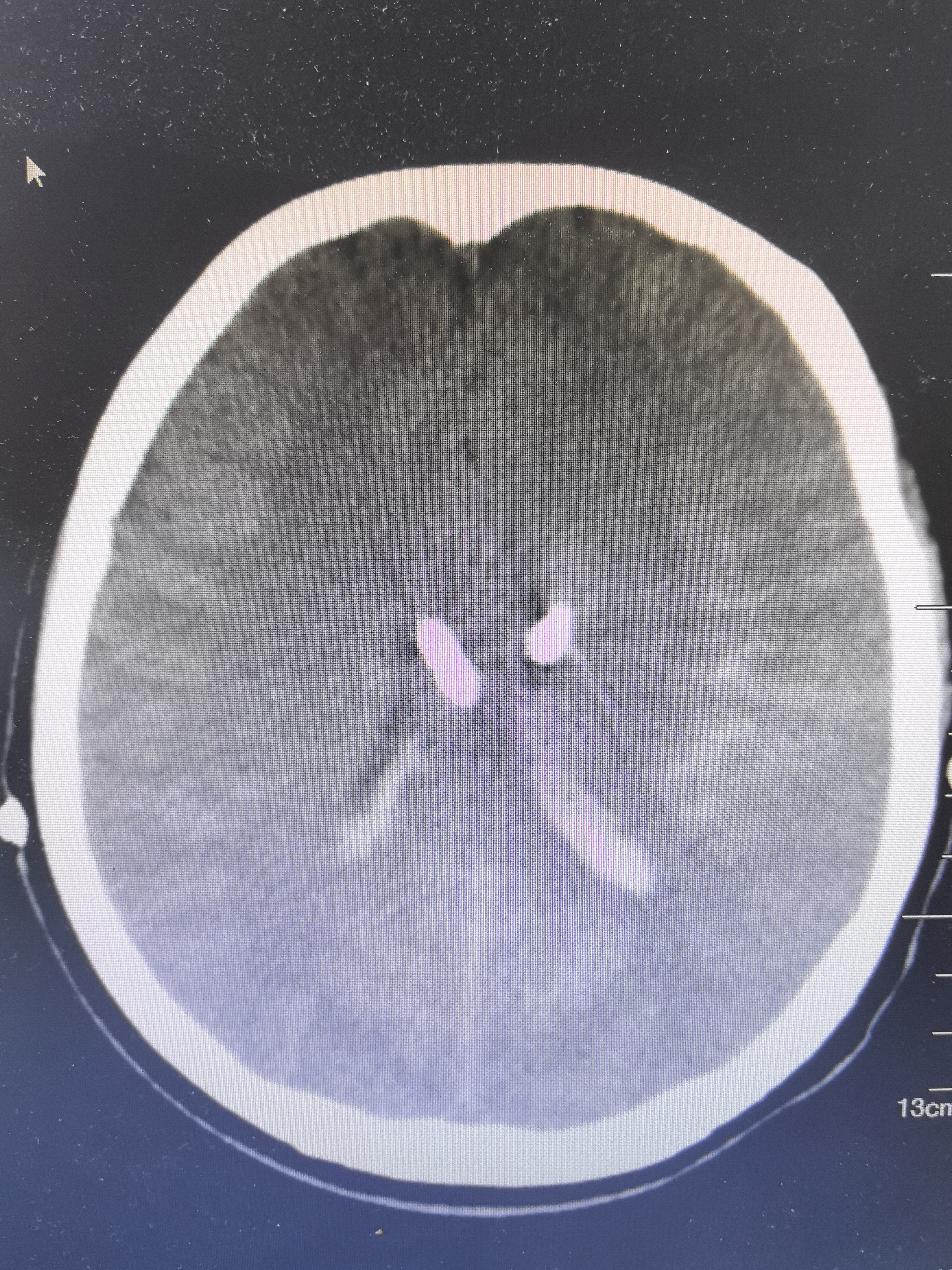头CT显示蛛网膜下腔出血破入脑室及脑内,三四脑室铸型