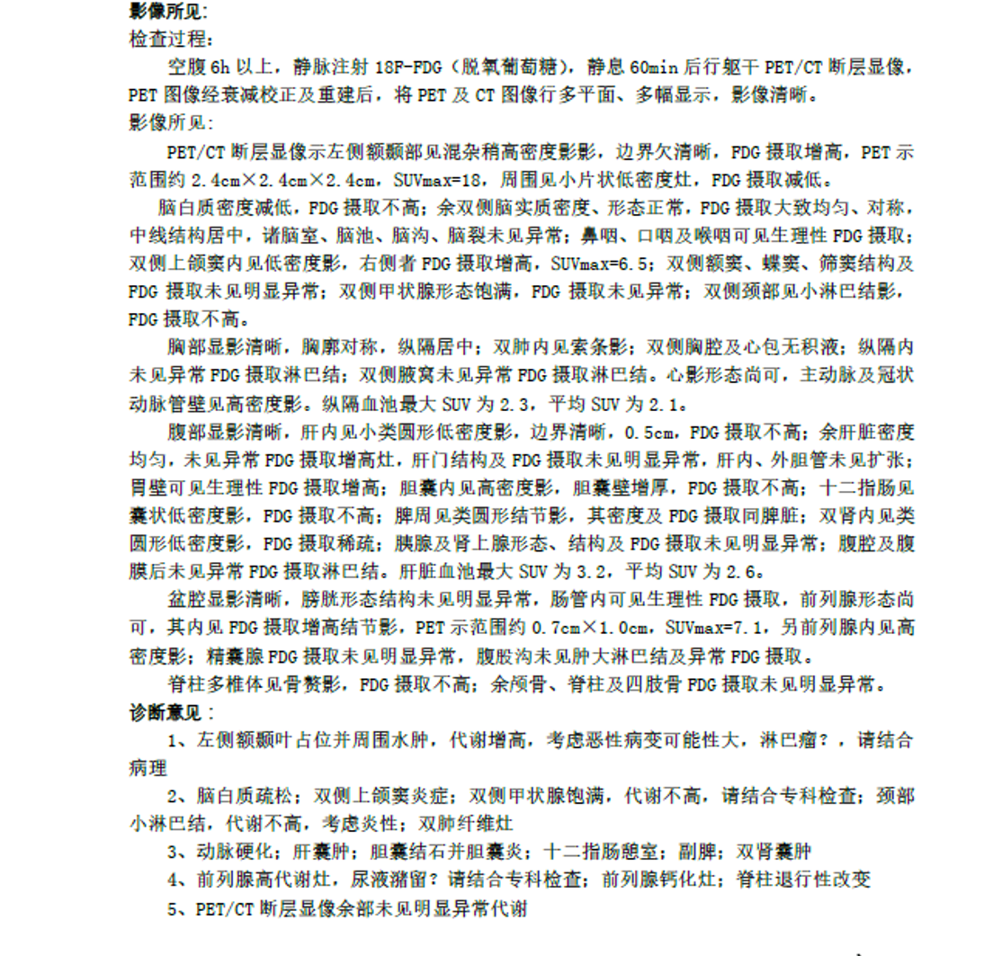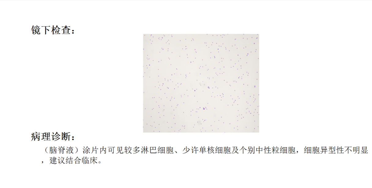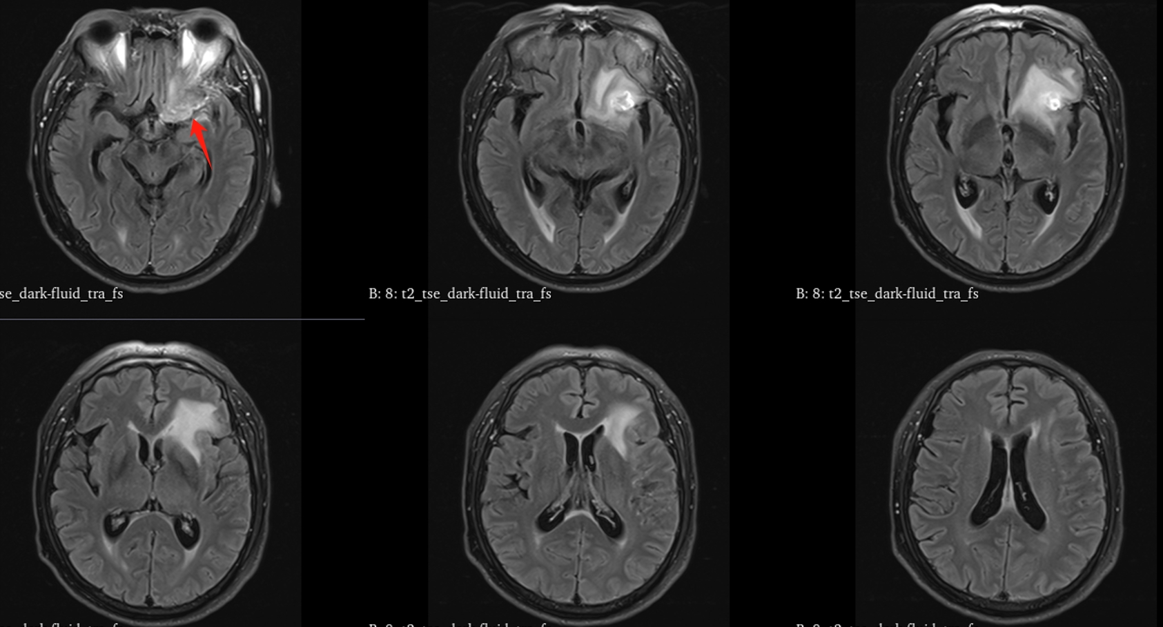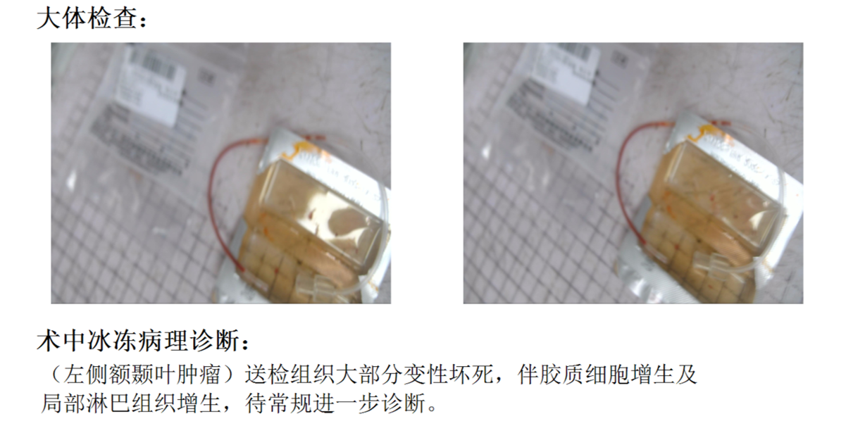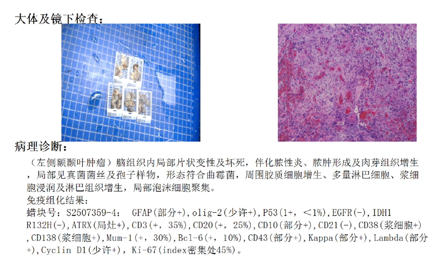 该患者入院后完善常规颅脑影像学检查,左侧颞叶病变,疾病性质不详,转移瘤、胶质瘤、炎症类疾病均不能排除,遂行PET-CT检查,提示左侧颞叶高代谢,淋巴瘤不能排除。组织MDT会诊建议可先行腰椎穿刺查脑脊液脱落细胞学、感染指标,若仍不能确诊,可进一步行开颅病灶切除,术中快速冰冻,根据冰冻结果决定手术手术策略。患者脑脊液脱落细胞学结果:较多淋巴细胞,少许单核细胞及个别中性粒细胞,未见异形细胞,脑脊液常规、生化、脑脊液培养未见细菌生长,诊断仍不能明确,且患者病情进展迅速,患者神志呈昏睡状态,颅脑MRI提示病变较前明显增大(影像学检查间隔两周),且水肿明显加重,遂行开颅病变切除术。术中见部分病变累及蝶骨嵴硬膜,病变质地硬韧,内有多个囊腔,囊内容物为黄色粘稠样脓性物质,留取囊液及实性部分送快速冰冻,在等待冰冻过程中,进一步探查见肿瘤侵犯左侧颞叶,该部位肿瘤质地相对软,无包膜,与周围脑组织无边界,血运不丰富,内有多个囊腔,且肿瘤侵犯侧裂池、颈动脉池,左侧视神经、颈内动脉、大脑中动脉均被病变包绕,且该处肿瘤质地偏硬韧。术中快速冰冻提示组织大片变性坏死,伴胶质增生及淋巴增生。结合病变质地及冰冻结果,考虑为非肿瘤性疾病,可能为炎性病变伴肉芽肿形成可能性大,且肿瘤质地硬韧,累及范围广泛,难以全切,遂行肿瘤大部分切除后结束手术。术后病理结果明确后予以伏立康唑、醋酸卡泊芬净抗真菌治疗。在治疗过程中患者先后出现脑出血、脑梗塞,最终因治疗周期长,花费高、效果不确定等因素,家属放弃治疗,于术后1月去世。