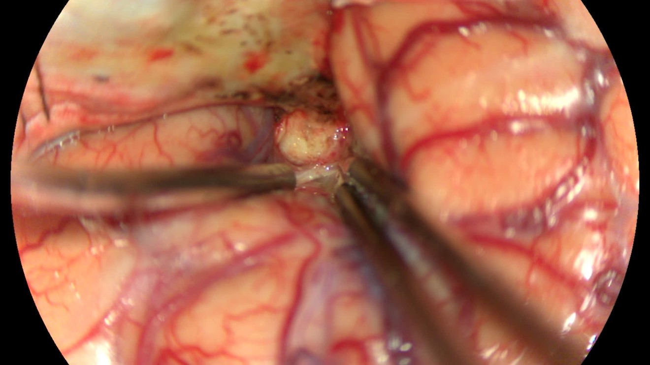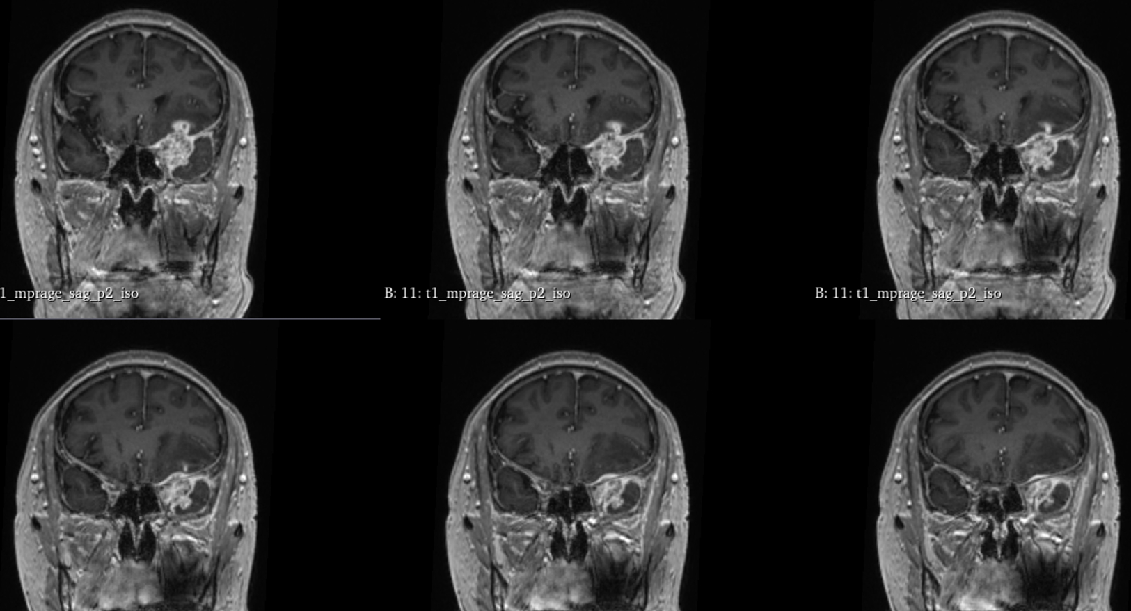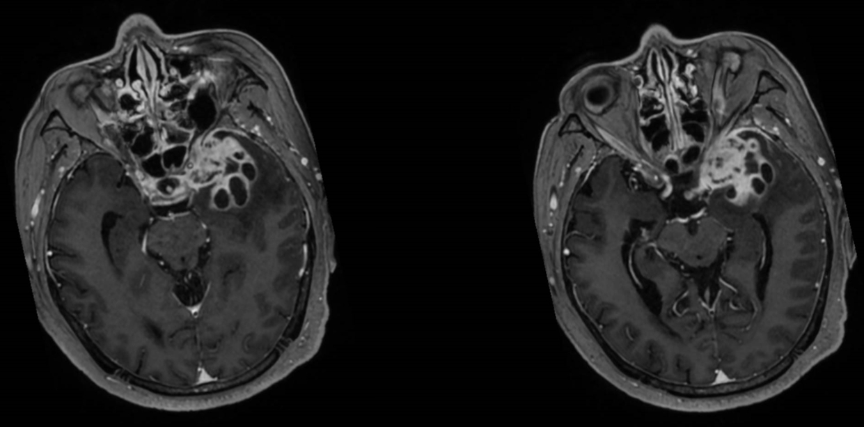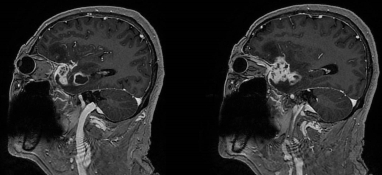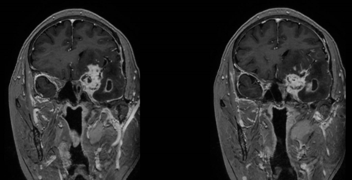 该患者入院后完善常规颅脑影像学检查,左侧颞叶病变,疾病性质不详,转移瘤、胶质瘤、炎症类疾病均不能排除,遂行PET-CT检查,提示左侧颞叶高代谢,淋巴瘤不能排除。组织MDT会诊建议可先行腰椎穿刺查脑脊液脱落细胞学、感染指标,若仍不能确诊,可进一步行开颅病灶切除,术中快速冰冻,根据冰冻结果决定手术手术策略。患者脑脊液脱落细胞学结果:较多淋巴细胞,少许单核细胞及个别中性粒细胞,未见异形细胞,脑脊液常规、生化、脑脊液培养未见细菌生长,诊断仍不能明确,且患者病情进展迅速,患者神志呈昏睡状态,颅脑MRI提示病变较前明显增大(影像学检查间隔两周),且水肿明显加重,遂行开颅病变切除术。术中见部分病变累及蝶骨嵴硬膜,病变质地硬韧,内有多个囊腔,囊内容物为黄色粘稠样脓性物质,留取囊液及实性部分送快速冰冻,在等待冰冻过程中,进一步探查见肿瘤侵犯左侧颞叶,该部位肿瘤质地相对软,无包膜,与周围脑组织无边界,血运不丰富,内有多个囊腔,且肿瘤侵犯侧裂池、颈动脉池,左侧视神经、颈内动脉、大脑中动脉均被病变包绕,且该处肿瘤质地偏硬韧。术中快速冰冻提示组织大片变性坏死,伴胶质增生及淋巴增生。结合病变质地及冰冻结果,考虑为非肿瘤性疾病,可能为炎性病变伴肉芽肿形成可能性大,且肿瘤质地硬韧,累及范围广泛,难以全切,遂行肿瘤大部分切除后结束手术。术后病理结果明确后予以伏立康唑、醋酸卡泊芬净抗真菌治疗。在治疗过程中患者先后出现脑出血、脑梗塞,最终因治疗周期长,花费高、效果不确定等因素,家属放弃治疗,于术后1月去世。