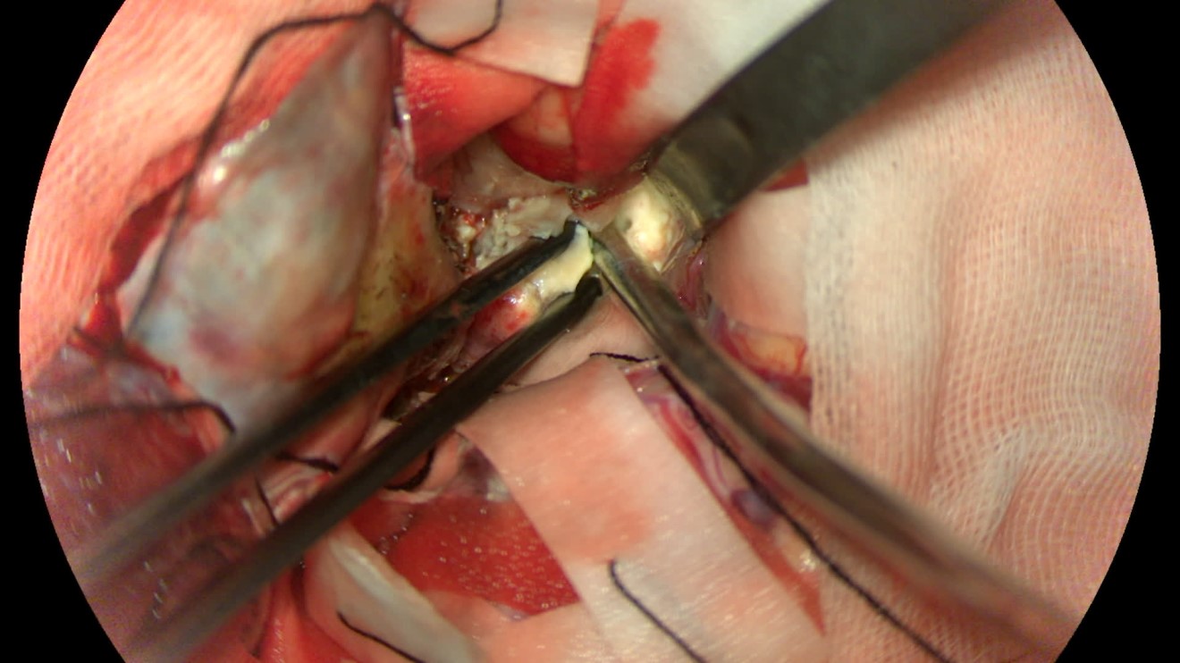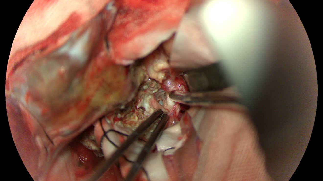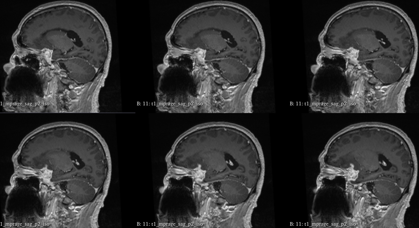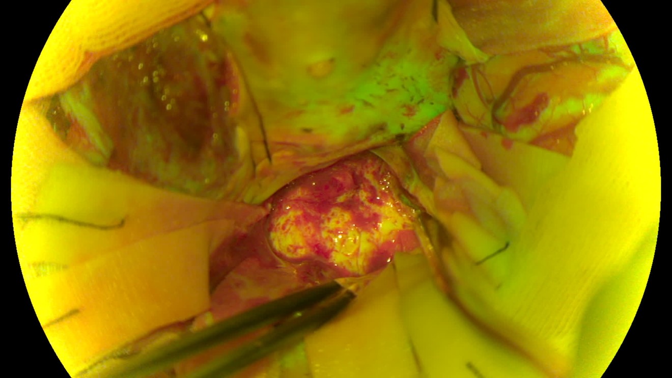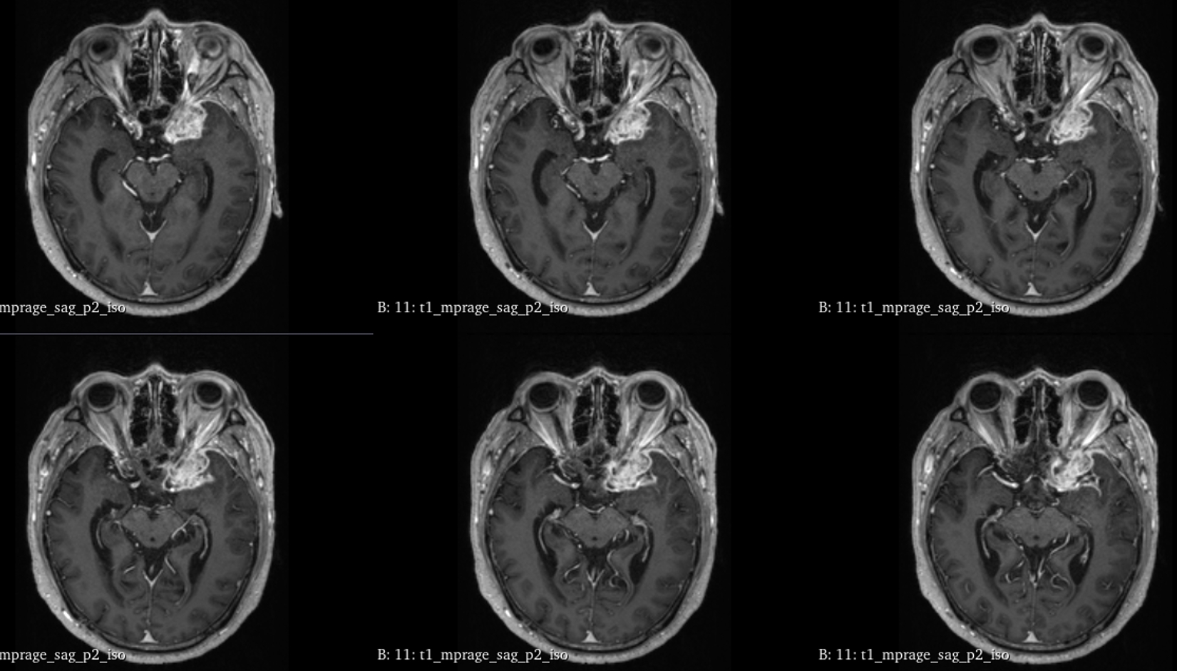 该患者入院后完善常规颅脑影像学检查,左侧颞叶病变,疾病性质不详,转移瘤、胶质瘤、炎症类疾病均不能排除,遂行PET-CT检查,提示左侧颞叶高代谢,淋巴瘤不能排除。组织MDT会诊建议可先行腰椎穿刺查脑脊液脱落细胞学、感染指标,若仍不能确诊,可进一步行开颅病灶切除,术中快速冰冻,根据冰冻结果决定手术手术策略。患者脑脊液脱落细胞学结果:较多淋巴细胞,少许单核细胞及个别中性粒细胞,未见异形细胞,脑脊液常规、生化、脑脊液培养未见细菌生长,诊断仍不能明确,且患者病情进展迅速,患者神志呈昏睡状态,颅脑MRI提示病变较前明显增大(影像学检查间隔两周),且水肿明显加重,遂行开颅病变切除术。术中见部分病变累及蝶骨嵴硬膜,病变质地硬韧,内有多个囊腔,囊内容物为黄色粘稠样脓性物质,留取囊液及实性部分送快速冰冻,在等待冰冻过程中,进一步探查见肿瘤侵犯左侧颞叶,该部位肿瘤质地相对软,无包膜,与周围脑组织无边界,血运不丰富,内有多个囊腔,且肿瘤侵犯侧裂池、颈动脉池,左侧视神经、颈内动脉、大脑中动脉均被病变包绕,且该处肿瘤质地偏硬韧。术中快速冰冻提示组织大片变性坏死,伴胶质增生及淋巴增生。结合病变质地及冰冻结果,考虑为非肿瘤性疾病,可能为炎性病变伴肉芽肿形成可能性大,且肿瘤质地硬韧,累及范围广泛,难以全切,遂行肿瘤大部分切除后结束手术。术后病理结果明确后予以伏立康唑、醋酸卡泊芬净抗真菌治疗。在治疗过程中患者先后出现脑出血、脑梗塞,最终因治疗周期长,花费高、效果不确定等因素,家属放弃治疗,于术后1月去世。