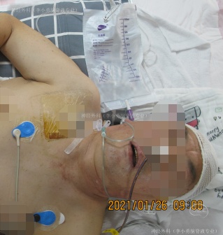 入院治疗18天即2021年1月26日(脑室外引流术后15天),进行了脑室腹壁外引流术,术后病情稳定(图-16)。