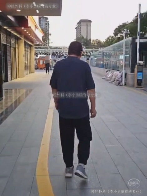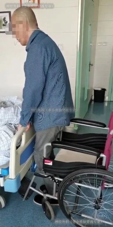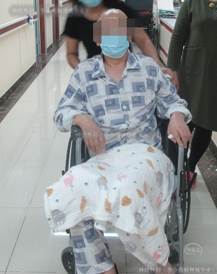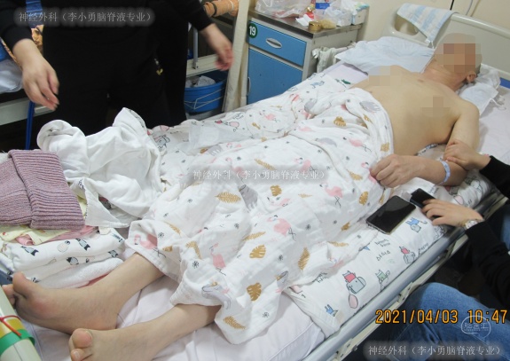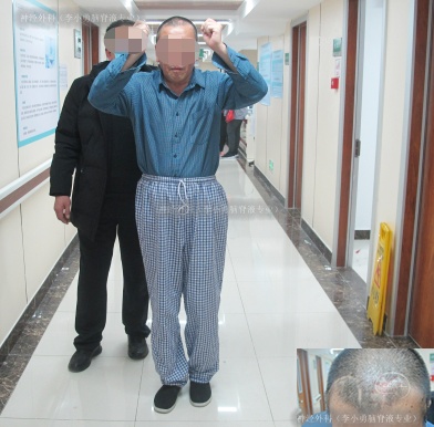 2021年1月8日(右侧脑室腹腔分流术后3年零4个月即左侧脑室腹腔分流术后21天)转住入李小勇脑脊液专业,入院时:意识基本正常,但近远期记忆力差,反应慢,在家属搀扶下能行走(图-11),说话语速慢,声调低,小便失禁,大便干燥;头部见手术疤痕。