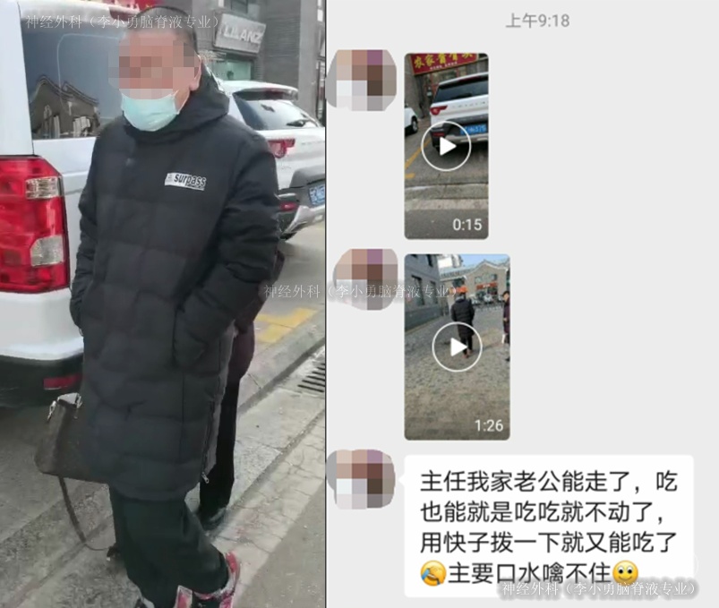 出院后9个月即2022年1月,家属发来视频:走路已变基本正常,记忆力也有变好(图-23),能自己吃东西,但吃一会就不动了用筷子拨一下又可以吃了,口水噙不住。