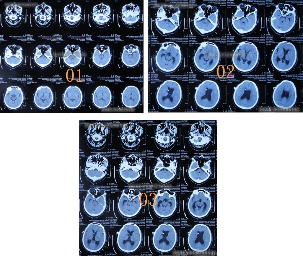住院1周左右时间,期间曾3次查头颅CT(图-2)示脑室稍有扩张,但头晕症状慢慢消失,行走不稳缓解,认为“病情变好”出院。