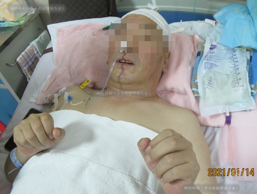 入院治疗6天即2021年1月14日(脑室外引流术后3天),引流出清亮脑脊液,病情进行性加重,肢体遵嘱活动反应很慢(图-14);脑脊液化验有感染。