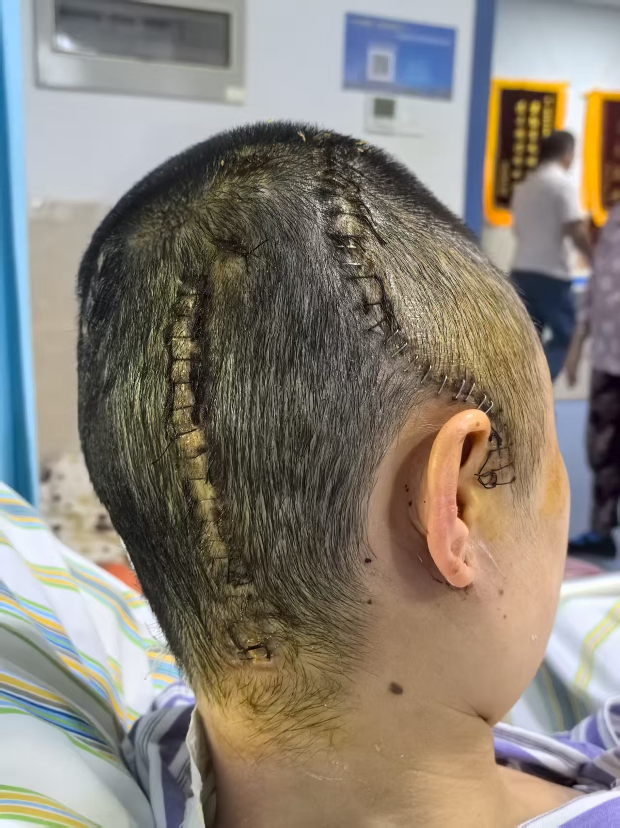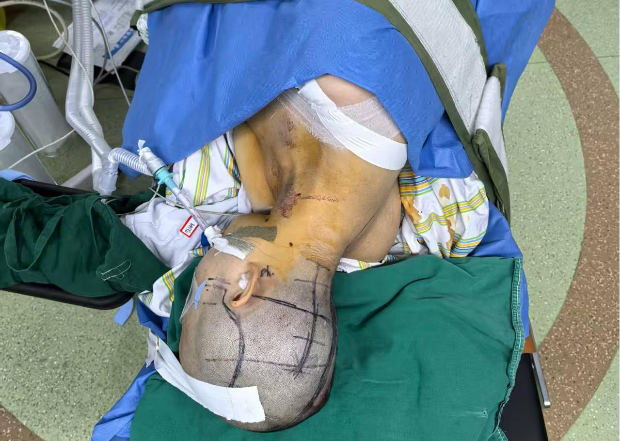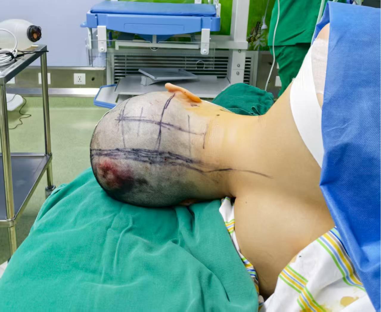 催促家属不能再犹豫,急诊开颅手术。设计左侧卧位,先做右枕部旁正中直切口清除硬膜外血肿,再做右侧额颞顶部去标准大骨瓣+右颞叶血肿清除术,体位和切口: