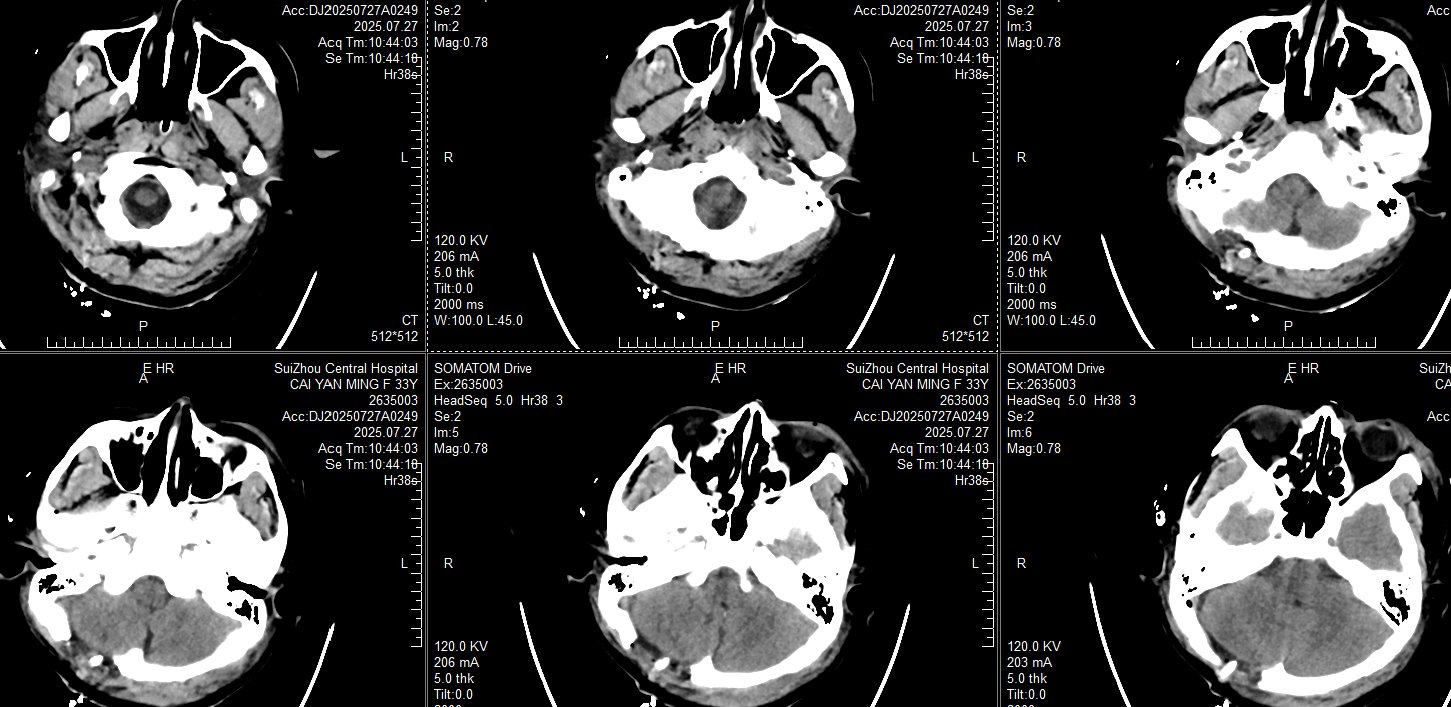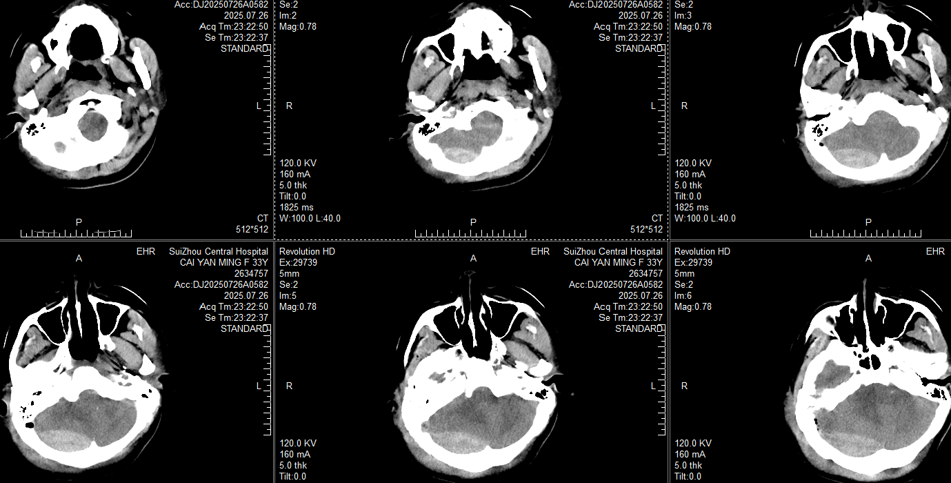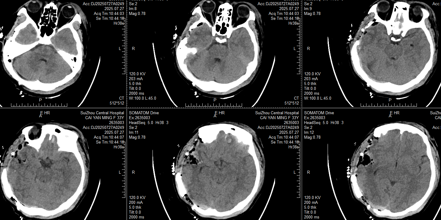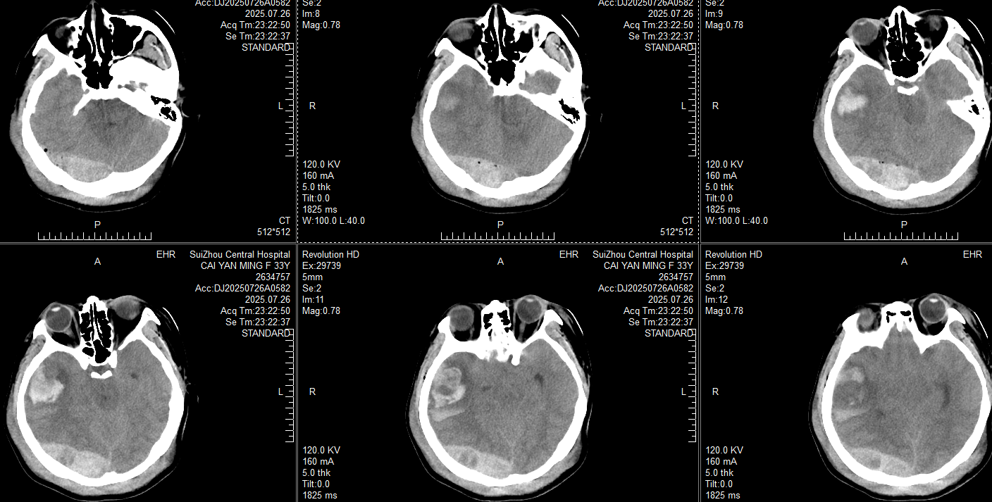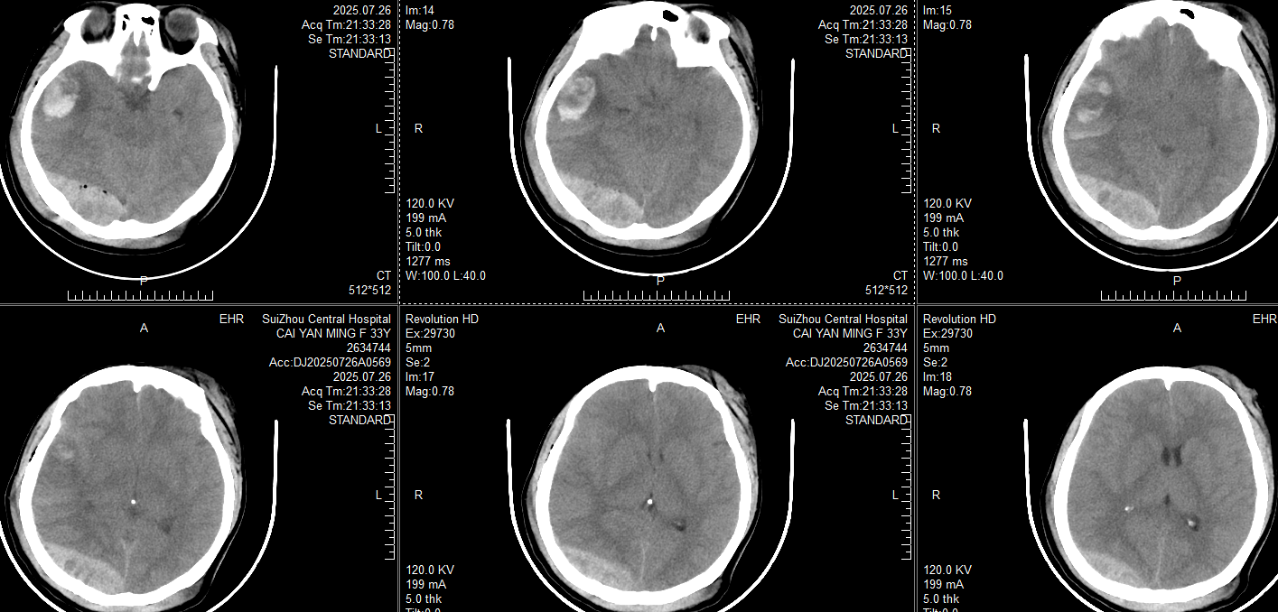 此时患者瞳孔等大同圆直径约2mm,对光反射均存在,颞叶血肿未完全形成,在和家属交代开颅手术方案:右侧枕部开颅清除硬膜外血肿去骨瓣减压,后再复查CT对比右侧颞叶出血进展情况。家属还在考虑手术方案时,23:20患者右侧瞳孔开始放大,立即复查CT: