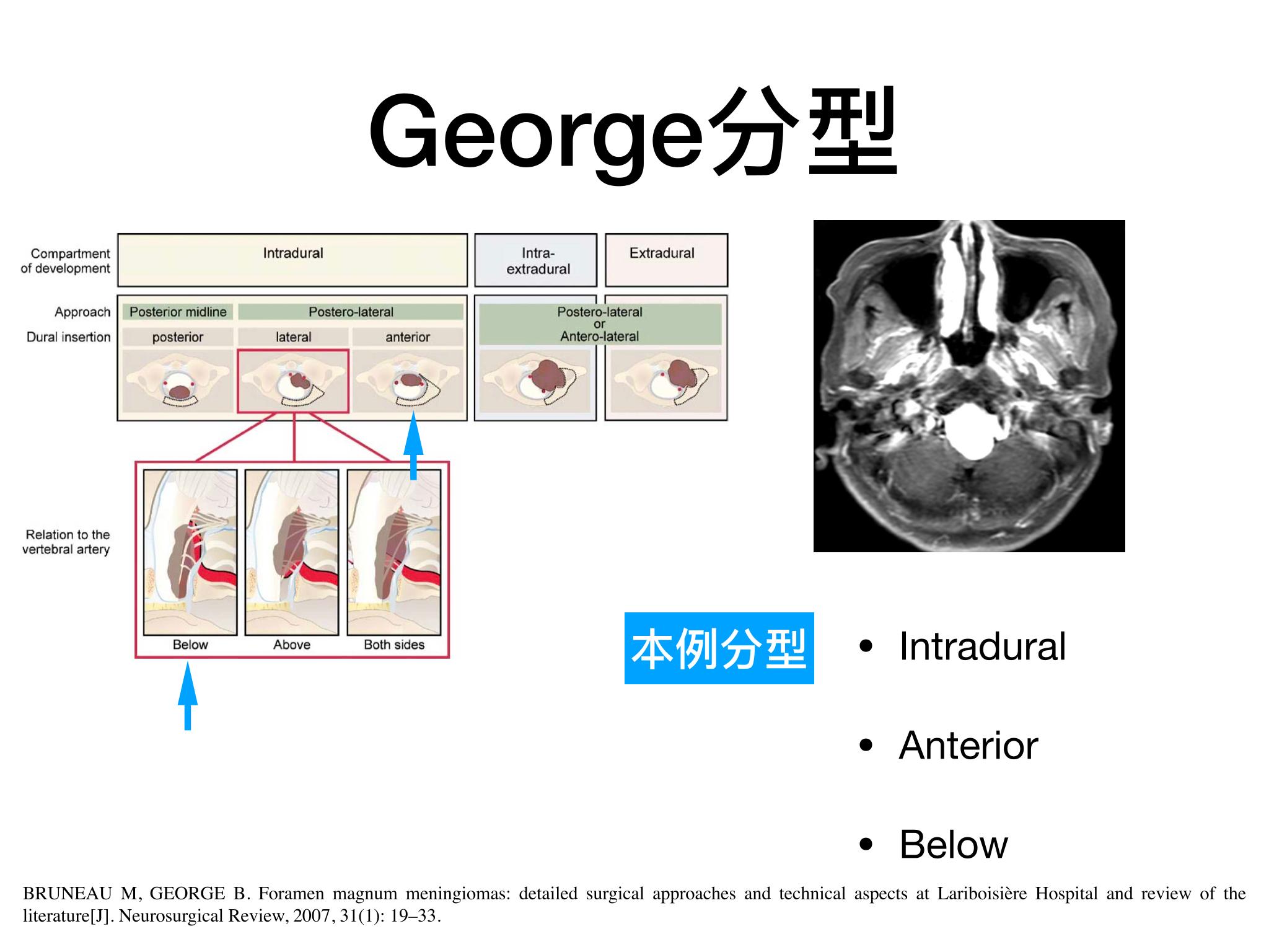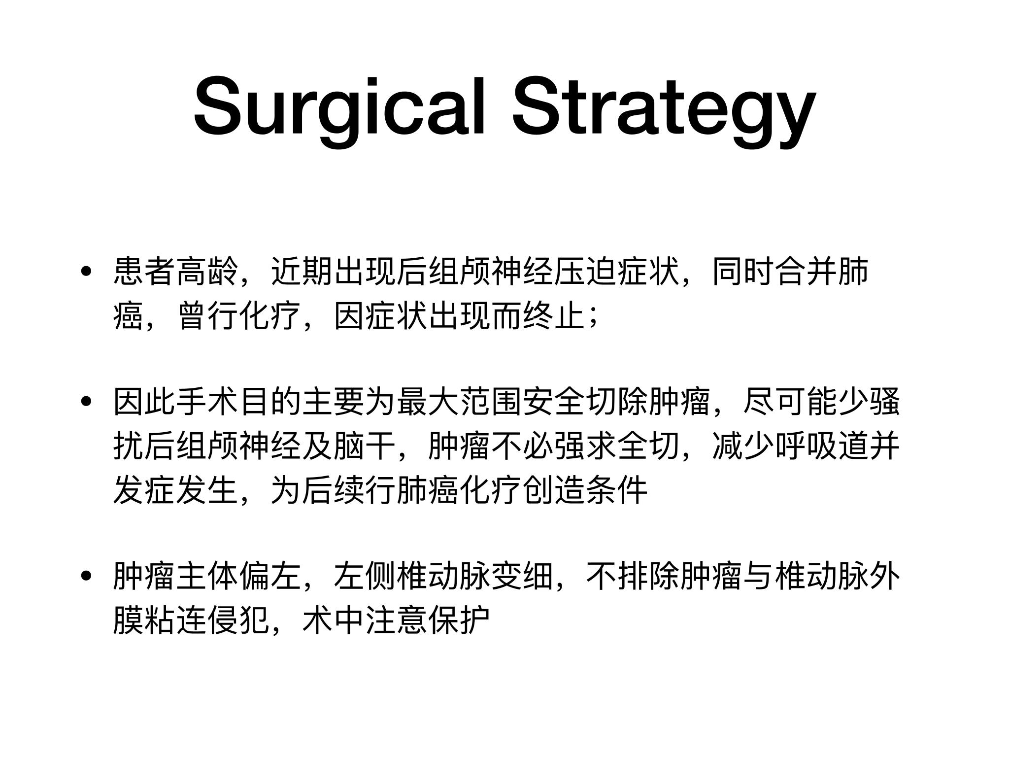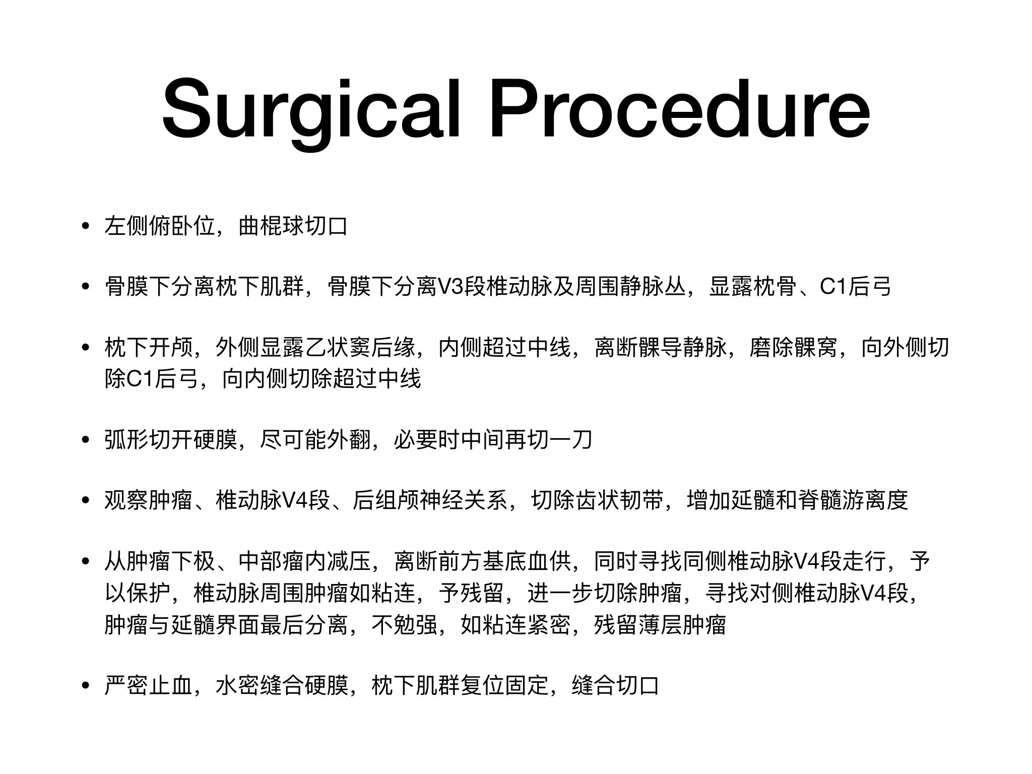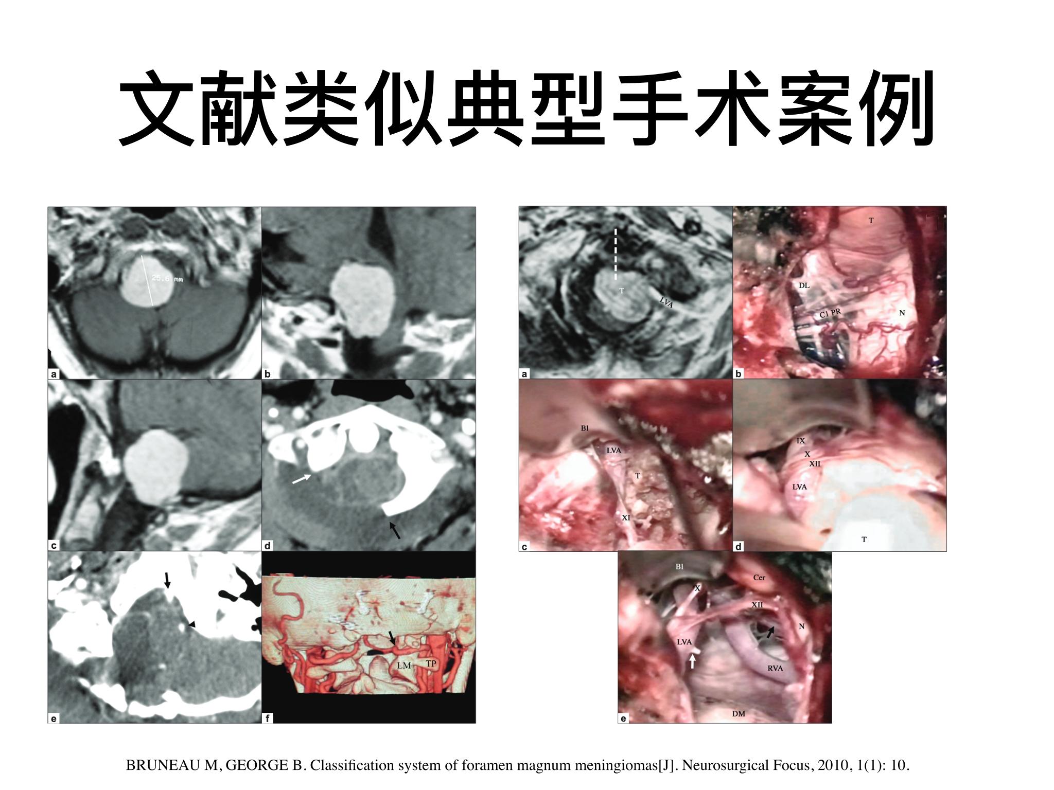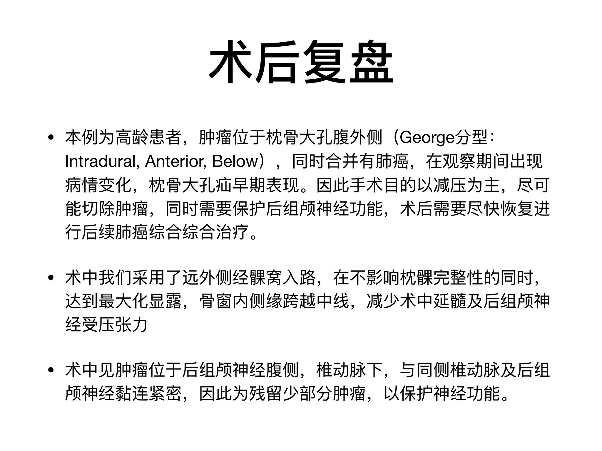 汇报一例后颅底肿瘤手术。为枕骨大孔巨大腹侧型脑膜瘤,该患者高龄,同时合并肺Ca,术前2周急性加重,枕骨大孔疝前期表现,术前已有延髓压迫及后组颅神经麻痹表现。经详细评估后采用远外侧经髁窝入路,最大化显露,重点保护延髓、后组颅神经,尽可能“零骚扰”。术中肿瘤质地韧,血供一般,与肿瘤上极与后组颅神经黏连紧密,最终99%切除,残留约1%,术后顺利康复出院,无新发症状,为后续进行肺部病变化疗创造有利条件。