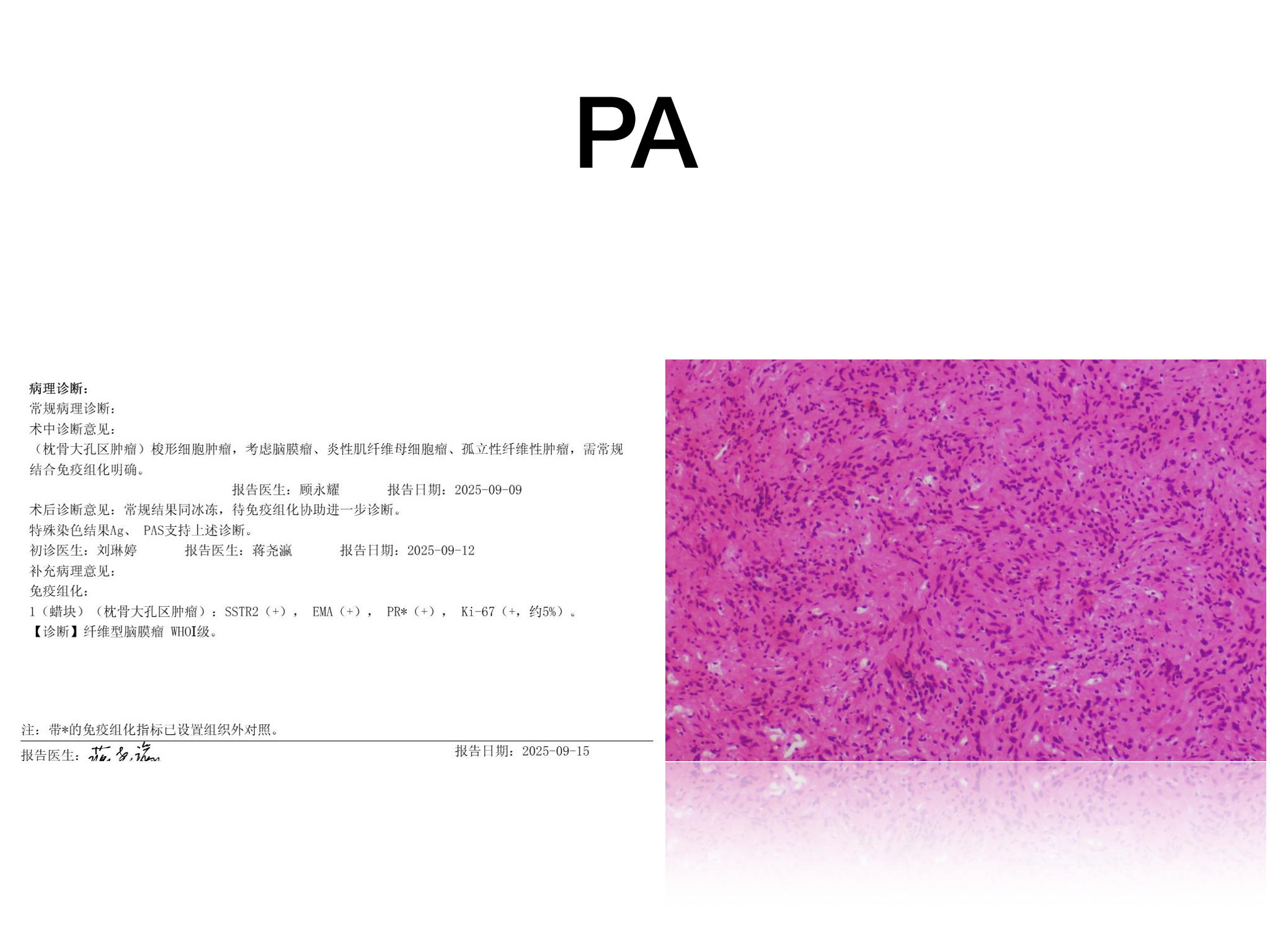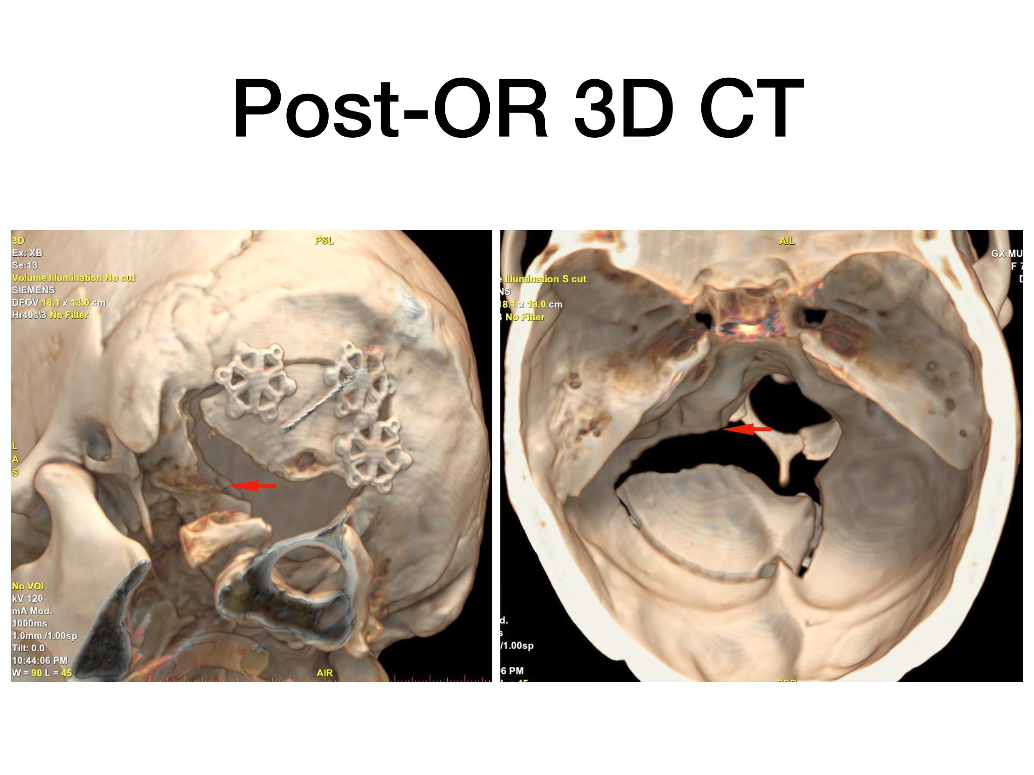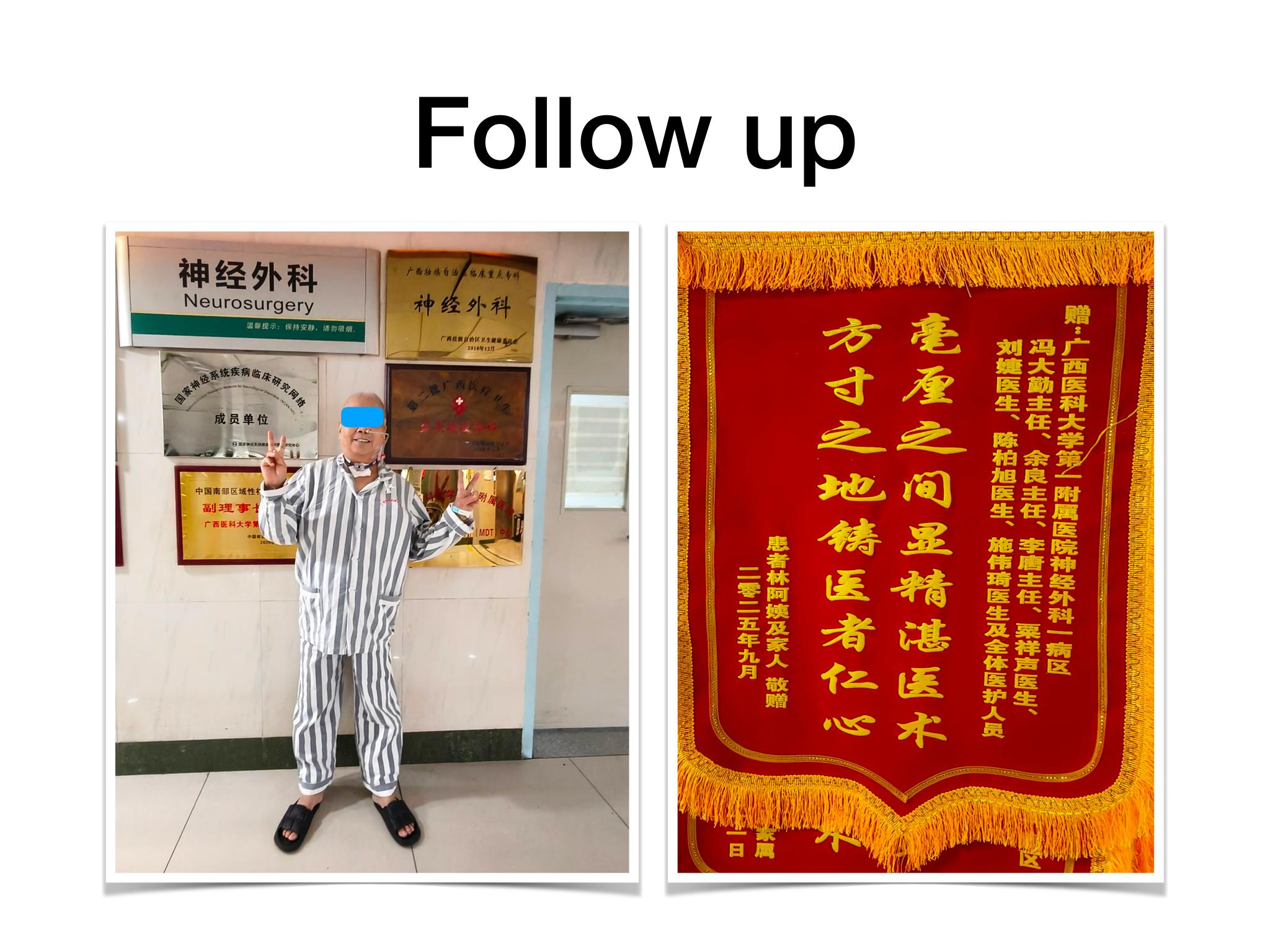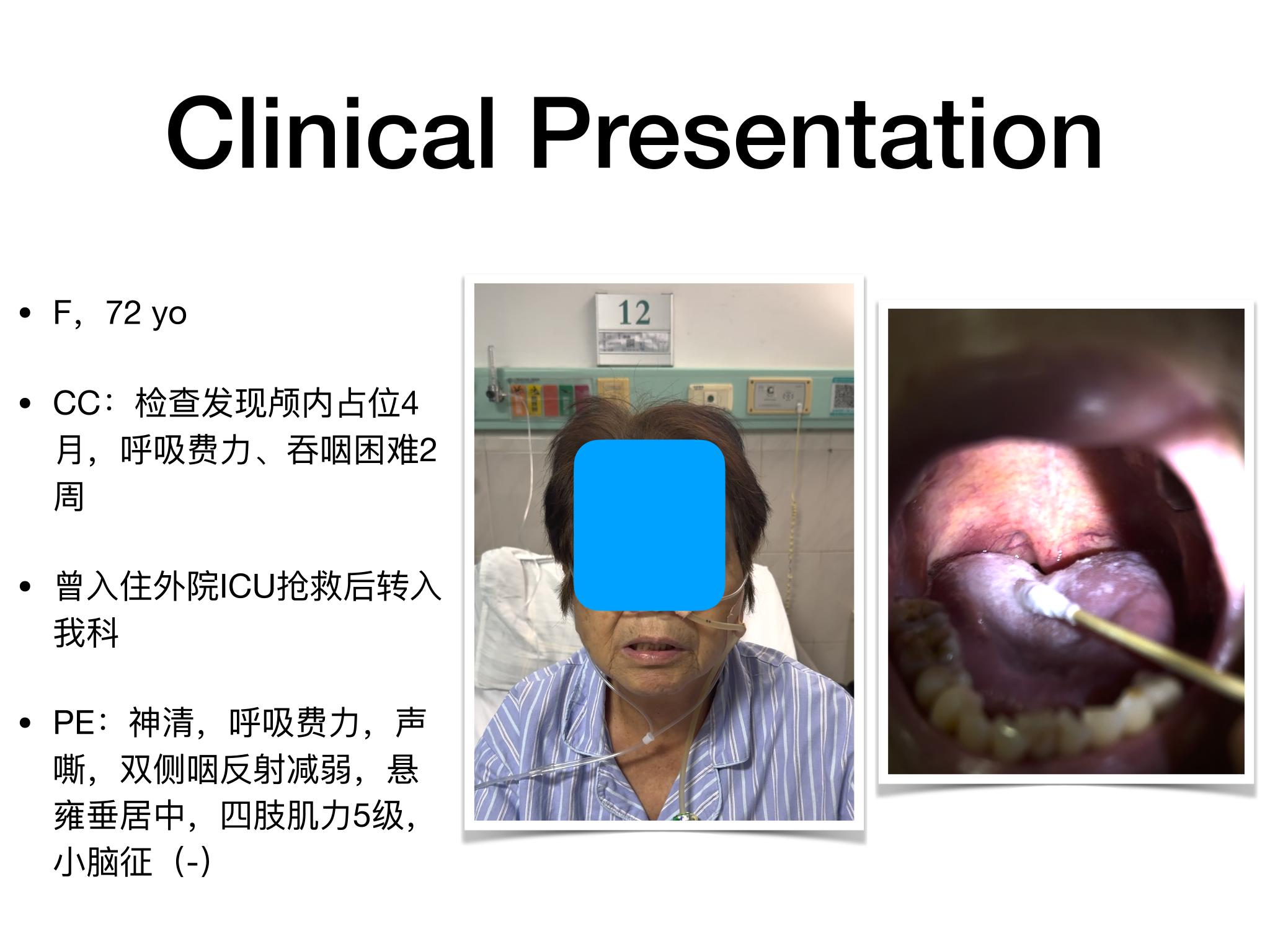 汇报一例后颅底肿瘤手术。为枕骨大孔巨大腹侧型脑膜瘤,该患者高龄,同时合并肺Ca,术前2周急性加重,枕骨大孔疝前期表现,术前已有延髓压迫及后组颅神经麻痹表现。经详细评估后采用远外侧经髁窝入路,最大化显露,重点保护延髓、后组颅神经,尽可能“零骚扰”。术中肿瘤质地韧,血供一般,与肿瘤上极与后组颅神经黏连紧密,最终99%切除,残留约1%,术后顺利康复出院,无新发症状,为后续进行肺部病变化疗创造有利条件。