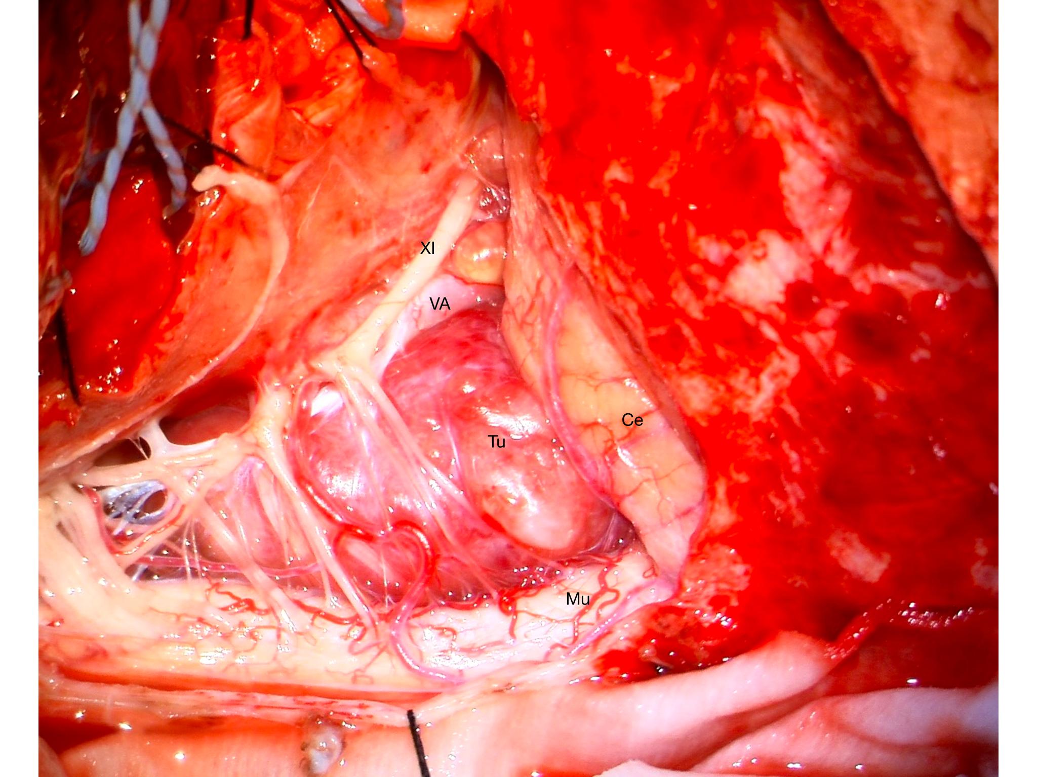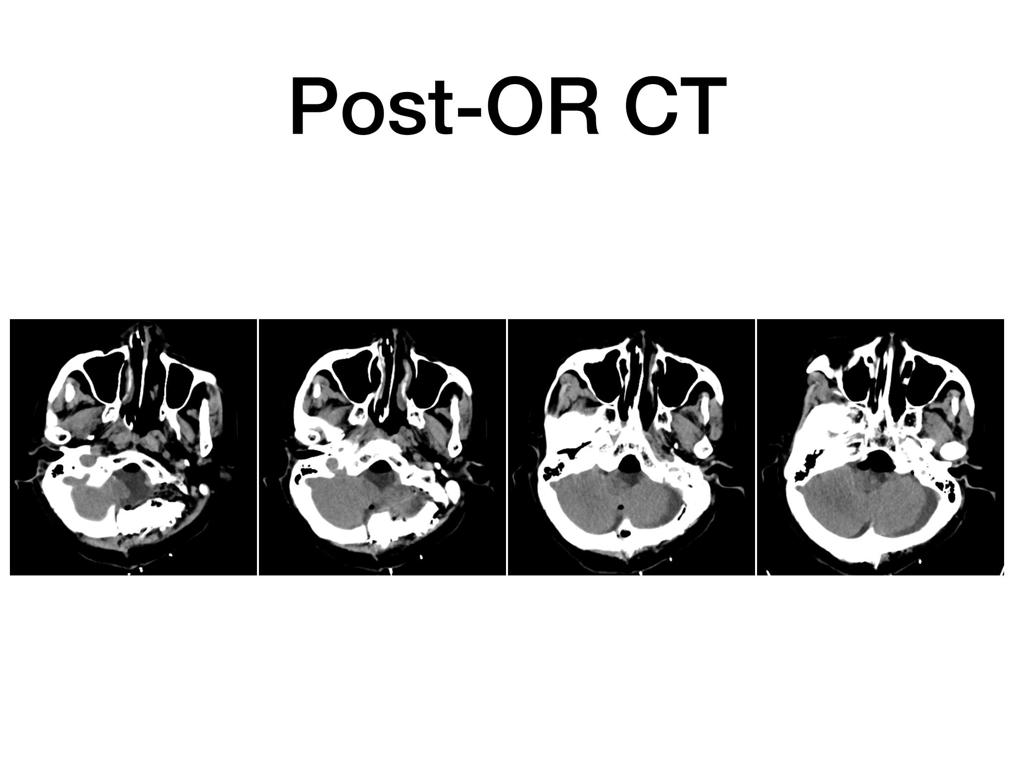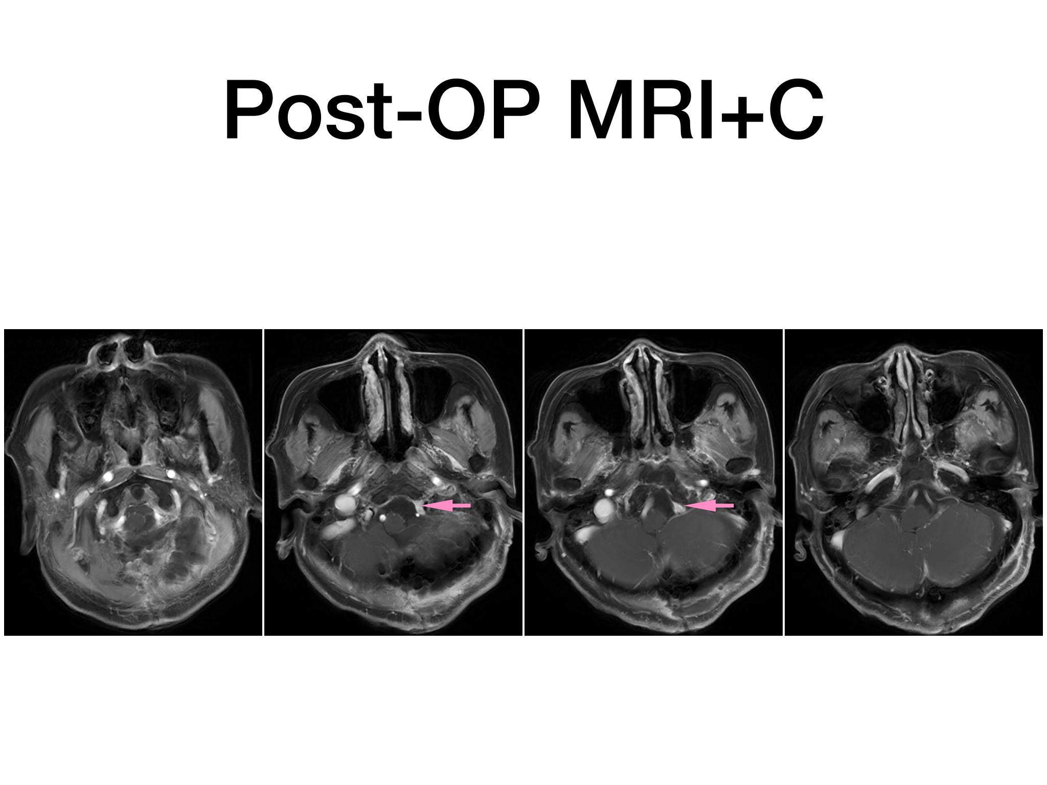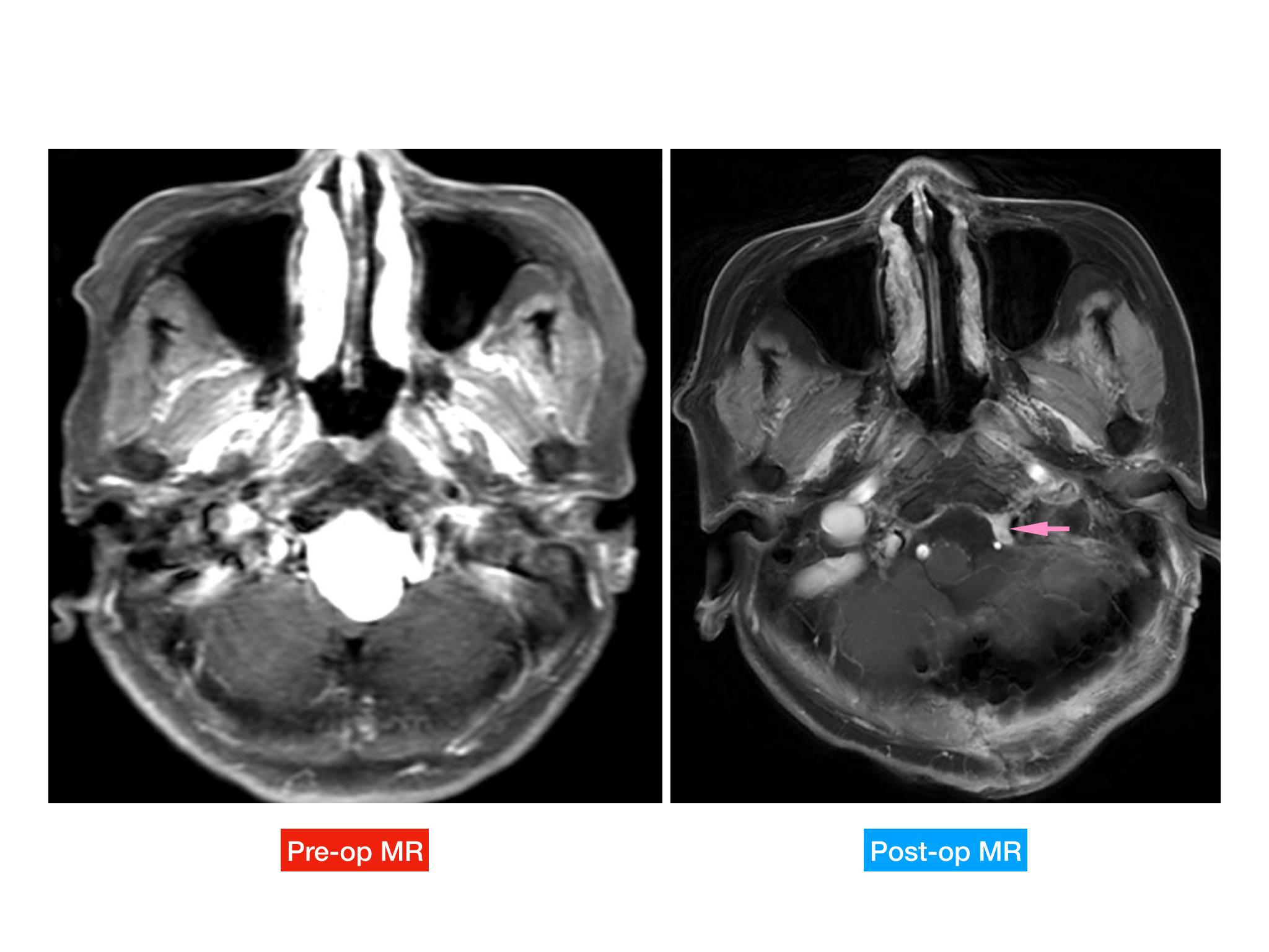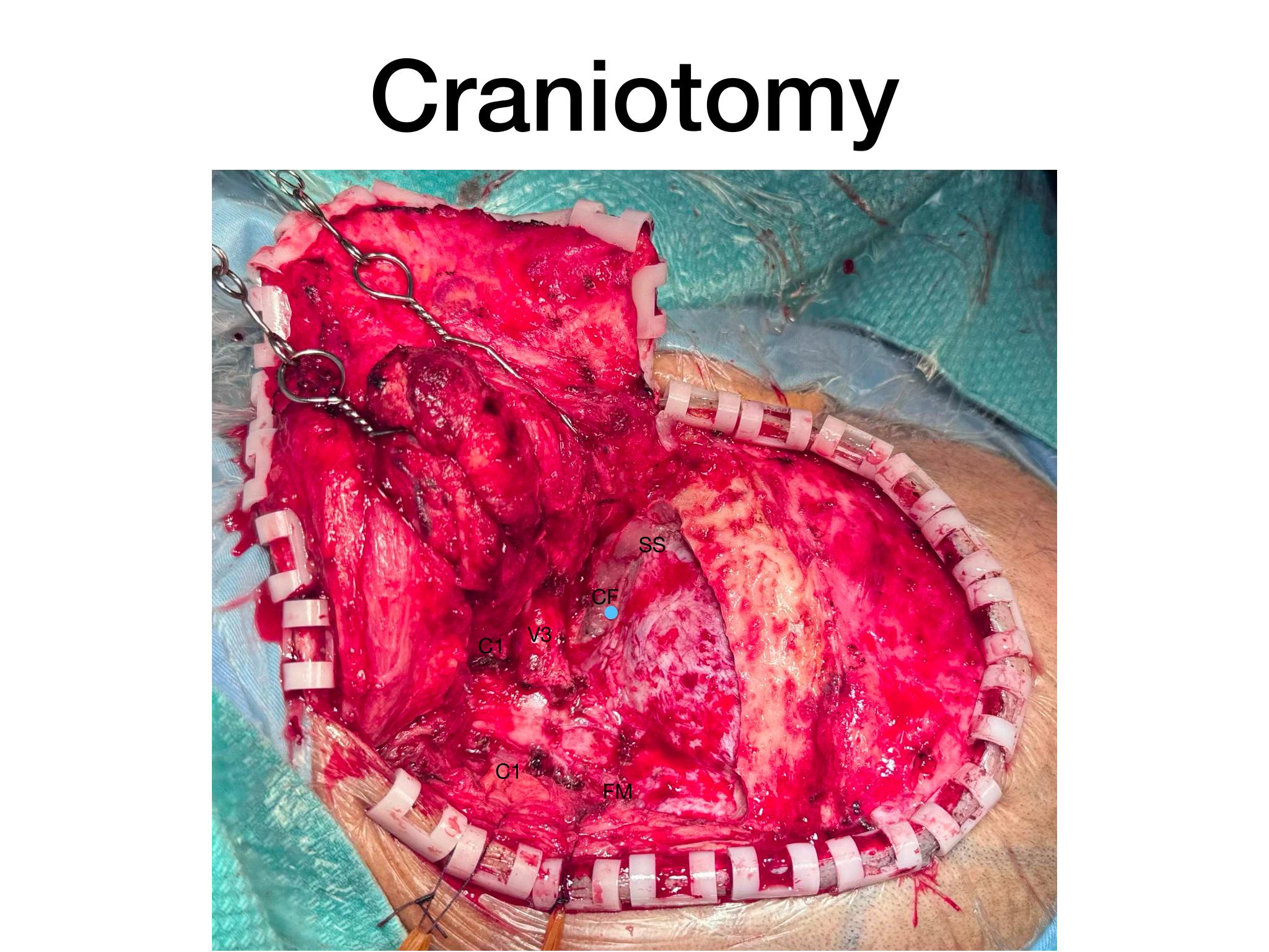 汇报一例后颅底肿瘤手术。为枕骨大孔巨大腹侧型脑膜瘤,该患者高龄,同时合并肺Ca,术前2周急性加重,枕骨大孔疝前期表现,术前已有延髓压迫及后组颅神经麻痹表现。经详细评估后采用远外侧经髁窝入路,最大化显露,重点保护延髓、后组颅神经,尽可能“零骚扰”。术中肿瘤质地韧,血供一般,与肿瘤上极与后组颅神经黏连紧密,最终99%切除,残留约1%,术后顺利康复出院,无新发症状,为后续进行肺部病变化疗创造有利条件。