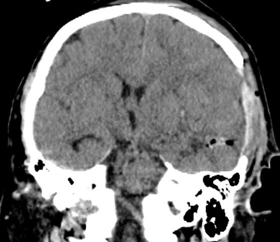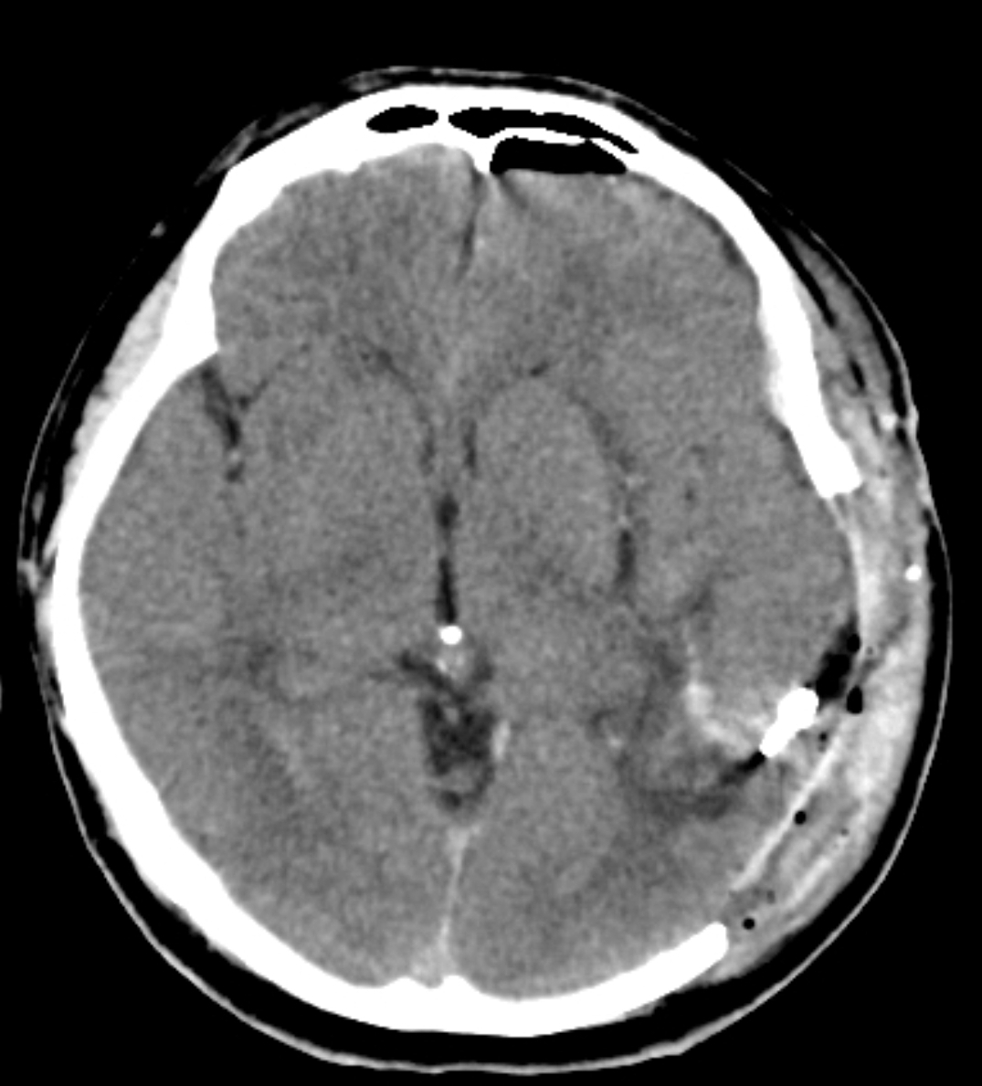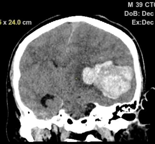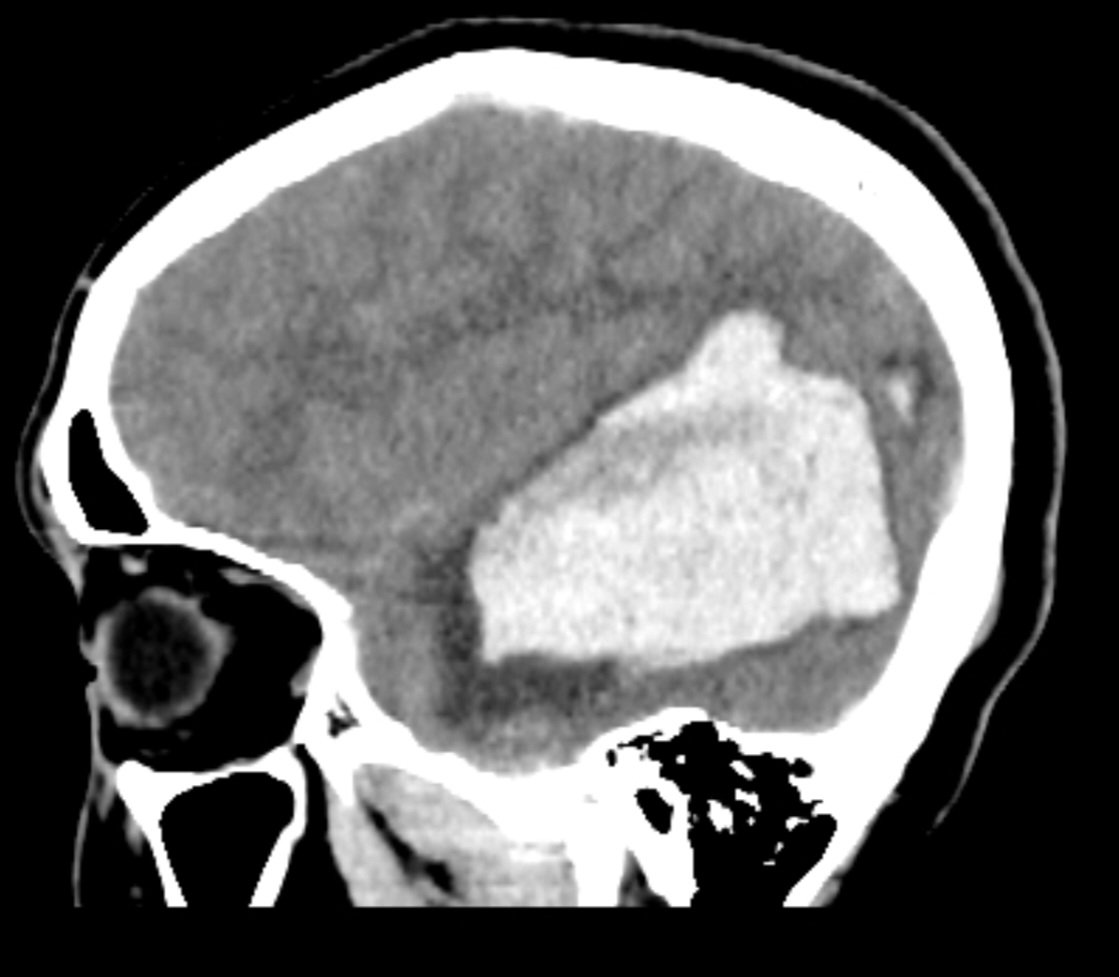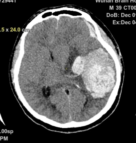 急诊头部CT显示左颞顶巨大脑内血肿,中线结构移位,脑疝