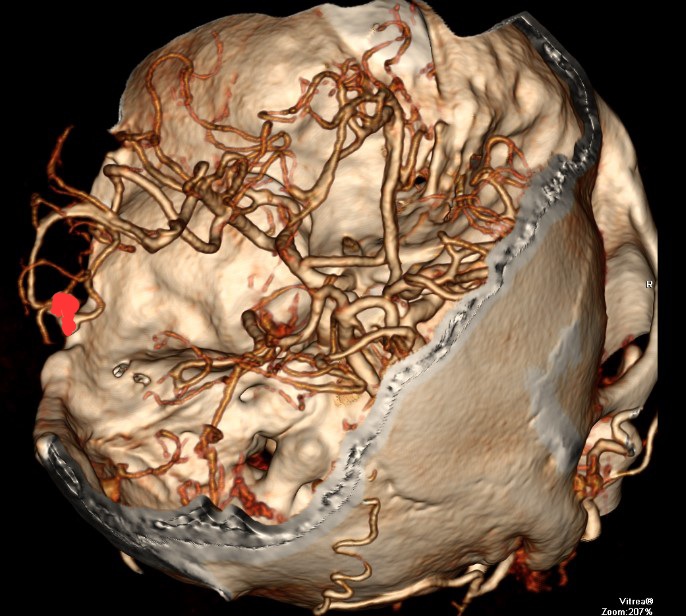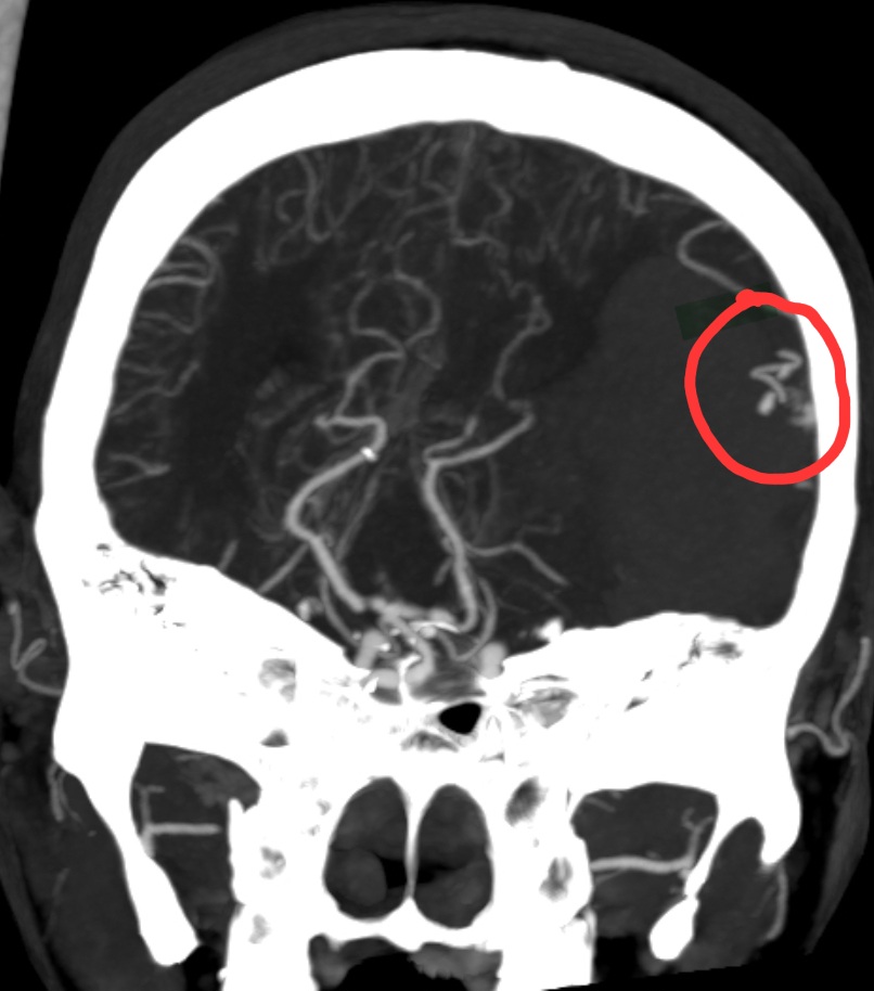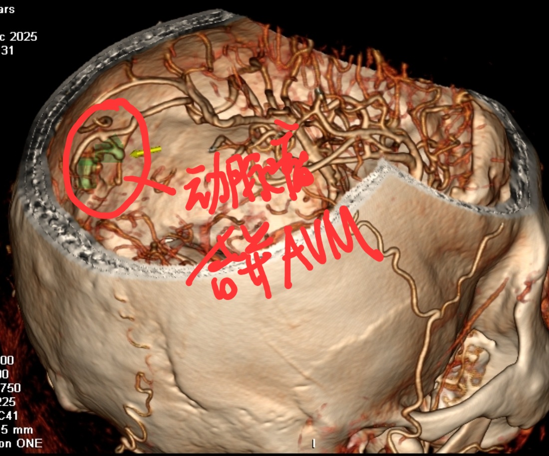头部CTA提示:左颞顶AVM合并大脑中远端动脉瘤
