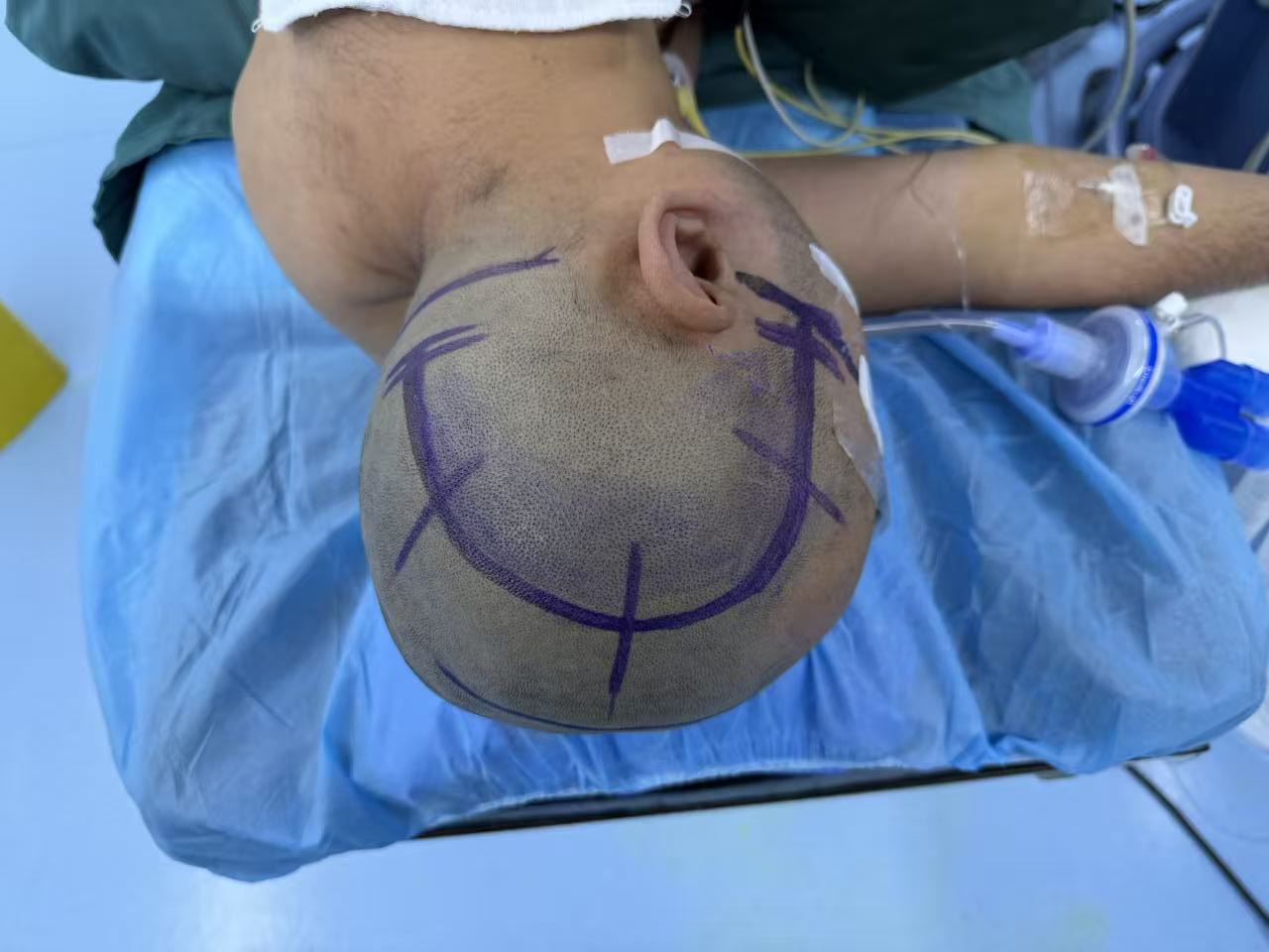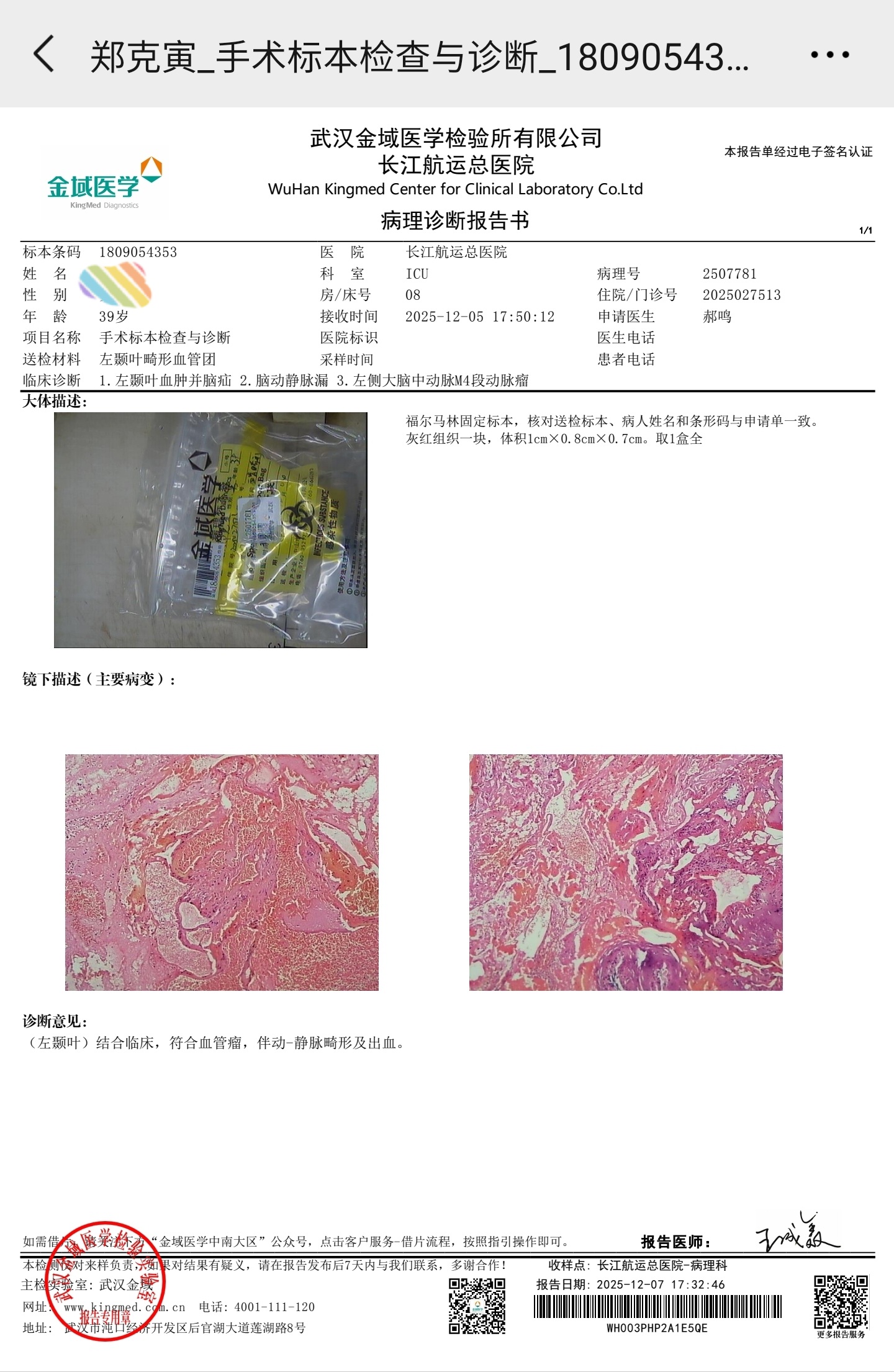 急诊行左颞顶大骨瓣开颅,血肿清除加去骨瓣减压,加AVM切除,动脉瘤夹闭术