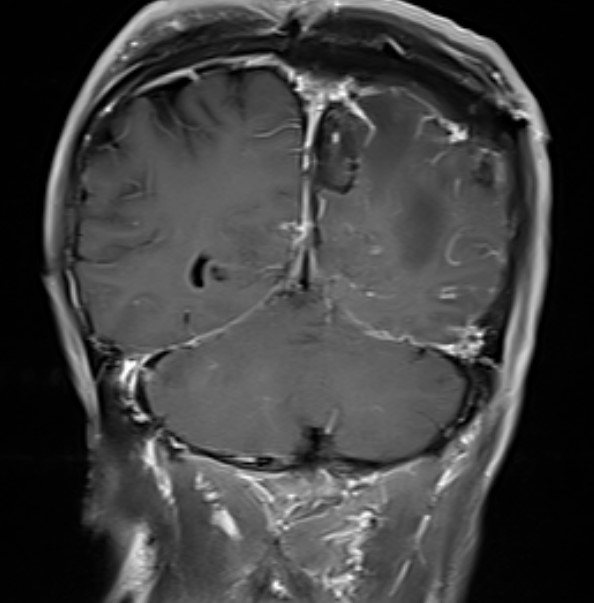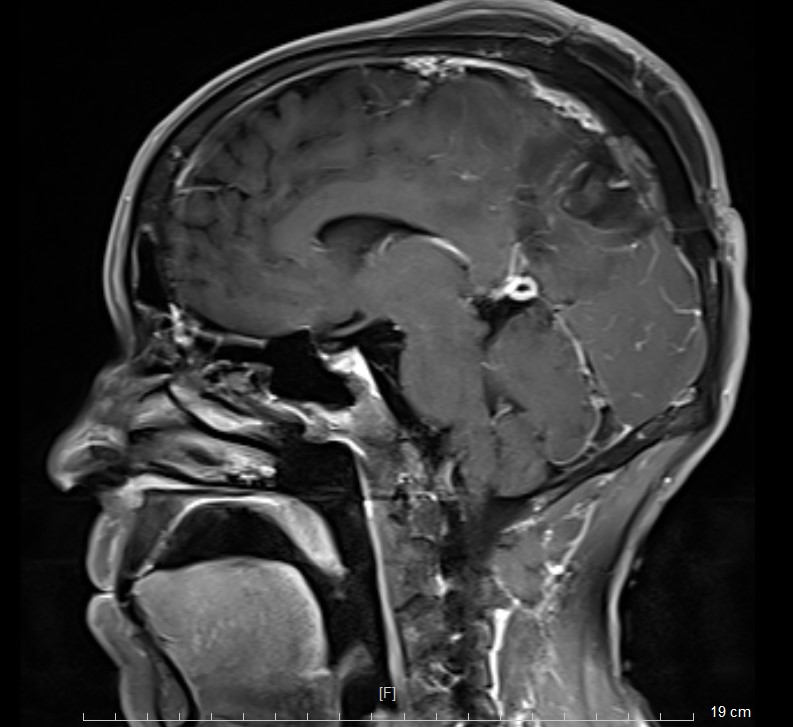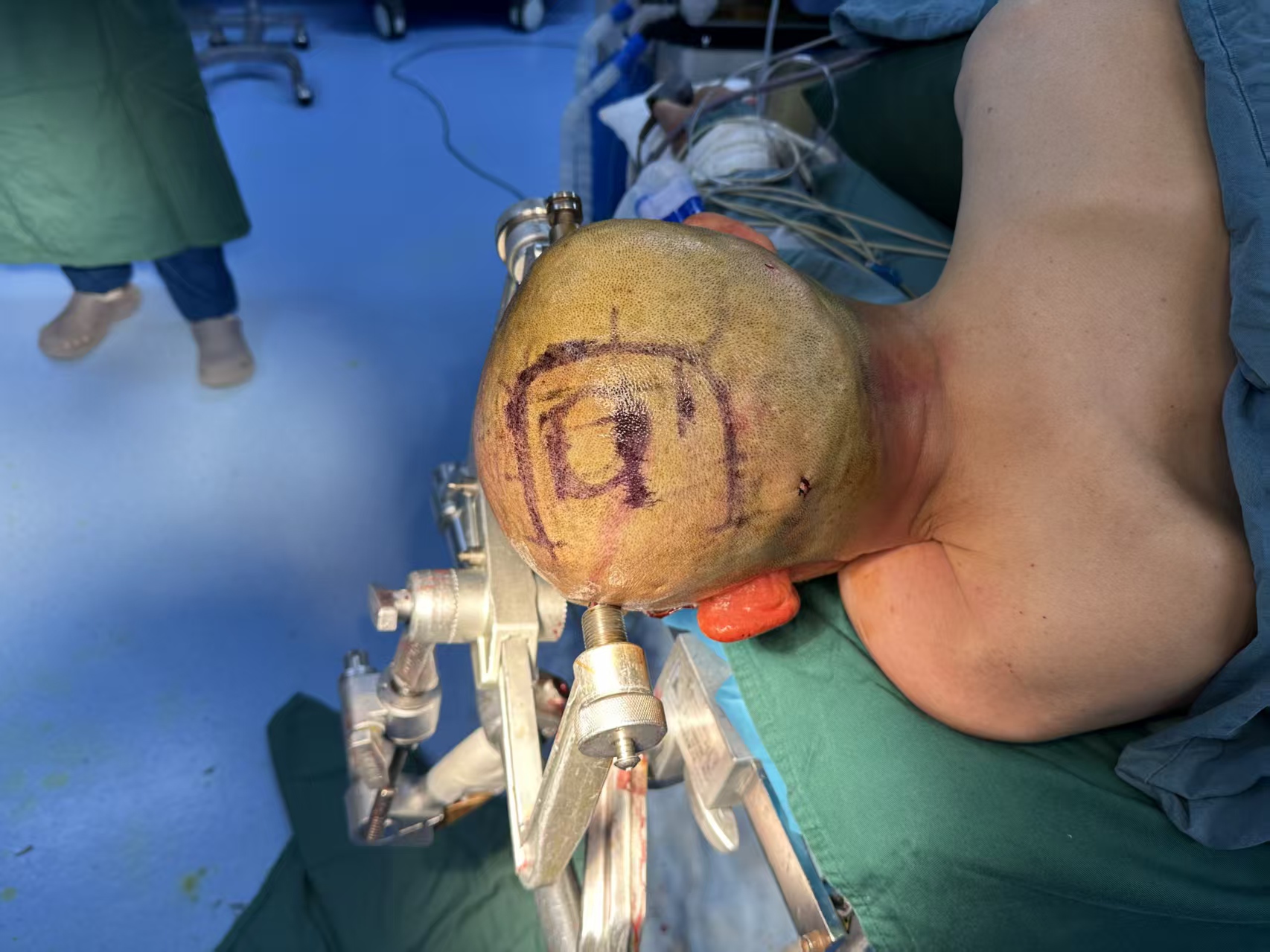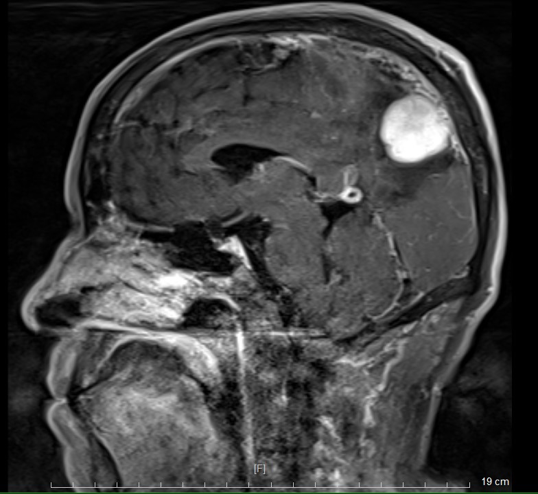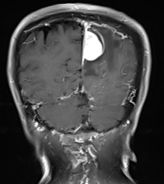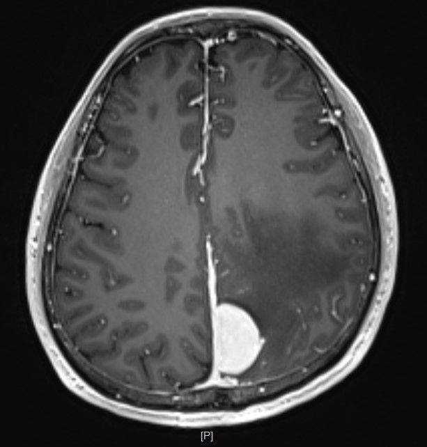 患者,男性,60岁。右侧肢体无力伴头痛一天入院 头部MR检查提示:左顶枕镰旁脑膜瘤 完善术前检查,导航定位,在全麻下,左侧俯卧位,行肿瘤切除术你的浏览器不支持video标签. 手术精要:1 术前腰穿置管降到颅压;2 摆体位时病灶侧朝下,利用重力作用提供手术通道;3 切除肿瘤时注意向矢状窦回流的静脉的保护,在引流静脉间隙操作切除肿瘤 术后MR复查提示肿瘤切除干净 术后病理提示诊断你的浏览器不支持video标签. 术后无任何神经功能障碍,一周顺利出院