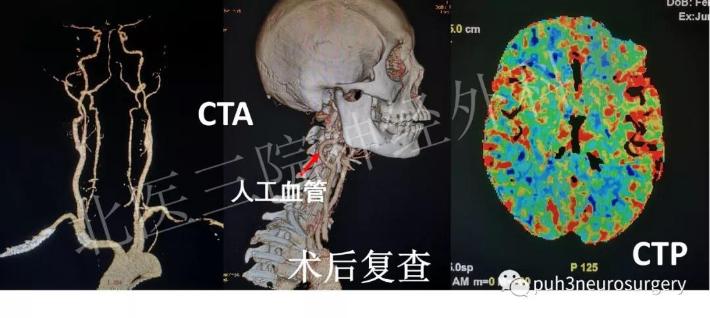 术后生命体征平稳,引流第二天拔除;术后前三天一过性饮水呛咳、吞咽略困难,考虑与术中神经骚扰有关,经对症处理后好转;无声嘶;无转颈和耸肩障碍;复查颈部动脉CTA,提示动脉瘤完整切除、人工血管血流重建满意;复查头颅CTP提示右侧大脑灌注明显改善。复查颅脑磁共振DWI未见脑梗发生。术后1周,李女士顺利出院。