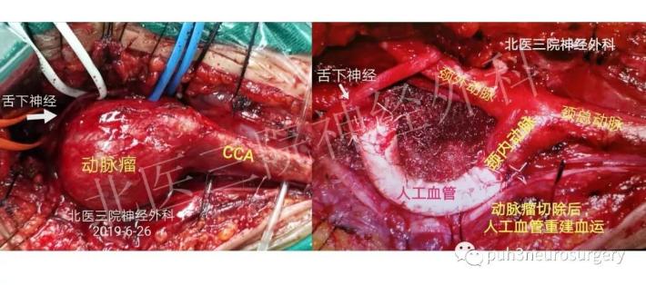 1.麻醉:经口气管插管全麻;2.体位:仰卧,右肩垫高,头左旋,颈略后仰;3.切口:胸锁乳突肌前缘直切口;4.显露:皮肤、皮下、颈阔肌、胸锁乳突肌前缘、颈动脉鞘——首先显露颈总动脉、硅酮吊带控制;向动脉瘤体流入道分离,于动脉瘤远心端分离流出道至颈内动脉远心端;分离颈外动脉;逐渐显露动脉瘤体及颈内动脉、颈外动脉、显露舌下神经并保护;5.阻断及血流重建:肝素化、提升血压,分别阻断颈内、颈外、颈总和甲状腺上动脉,剪开动脉瘤壁,放置转流管(提前穿入6mm肝素涂层带支撑环人工血管);动脉瘤壁破坏严重,无法直接缝合成形,剪除后修剪流出道和流入道,先端端吻合人工血管和流出道,撤除转流管后再端端吻合人工血管和流入道;回血、排气、撤除阻断(阻断时长25min)、恢复正常血流。7.彻底止血,放置引流,皮内缝合关闭伤口;8.全麻苏醒、拔除气管插管返回普通病房。手术总出血约50ml。9.手术全程在脑氧监测及TCD双监测下进行,无脑缺血表现。