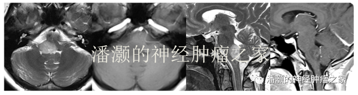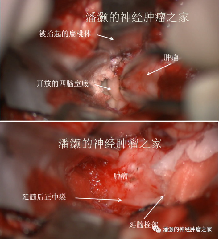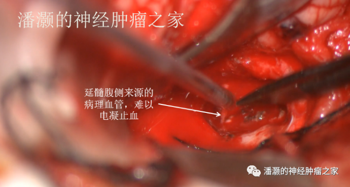 手术当中我们可以充分显露肿瘤,在延髓栓部以上操作,相对安全。但是该肿瘤特殊点在于质地韧,血供来源位于脑干腹侧,且众多病理性血管难以止血,因此在大部切除后我们及时终止,以避免在后续止血过程中损伤正常脑干组织结构。