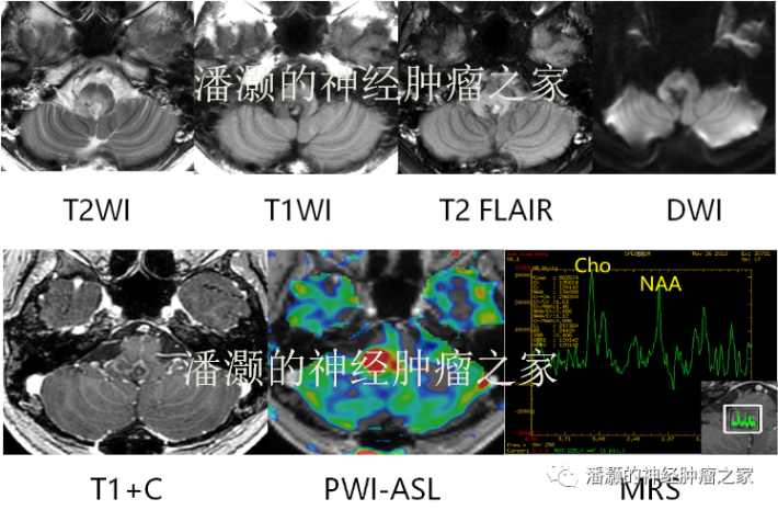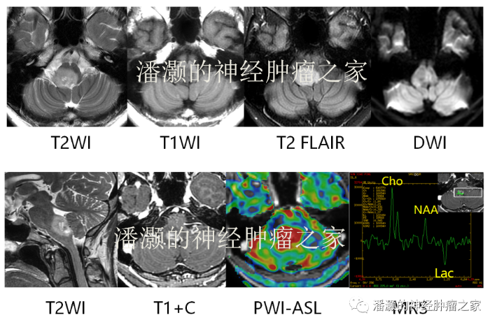 一个月之后复查的影像可见病变有所增大,DWI未见受限,ASL提示高灌注,中心强化明显,Cho/NAA>2,倒置Lac峰。综合来说,高灌注,强化不均质,Cho/NAA>2伴Lac峰,提示局部分化差!