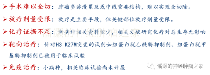 但是相信随着新的药物研发及数项针对H3K27M突变弥漫中线胶质瘤的临床试验的进行,可能会有新的治疗方案出现,以提高该类患者的生存期。