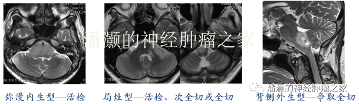 我们都知道,脑干胶质瘤按照发生部位及其与脑干的关系,可分为弥漫内生型、局灶型和背侧外生型。因为脑干这一重要部位的特殊性,不同的类型手术的处理方案不一。下图是我们针对不同类型脑干胶质瘤常采取的不同手术方案。