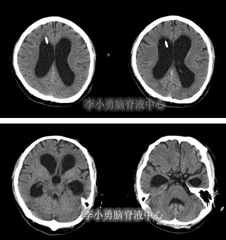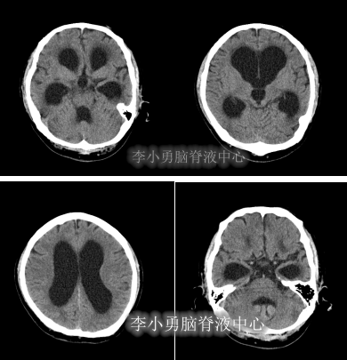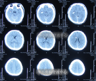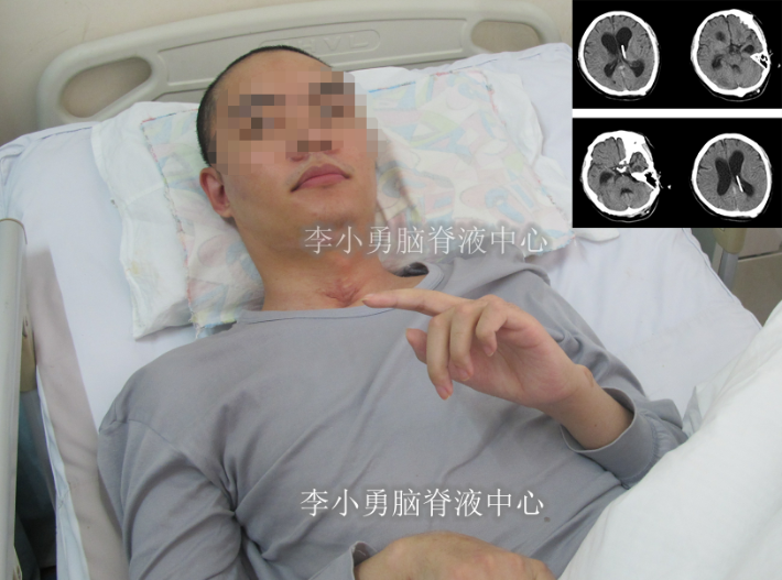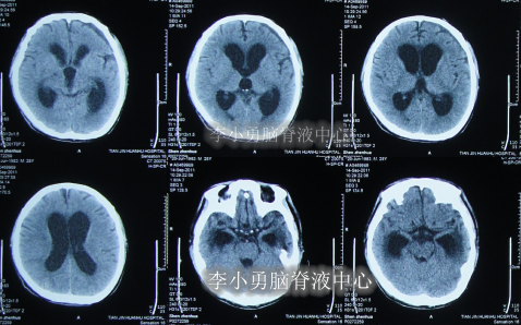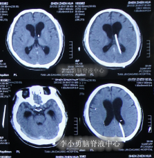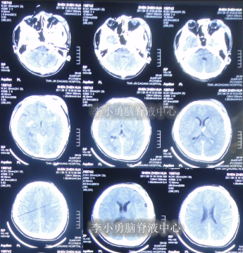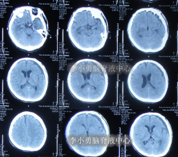 2012年11月7日(李小勇脑脊液科治疗57天)出院,出院时:由入院时意识模糊好转为意识清醒;饮食差好转为进食良好;四肢不能遵嘱活动、刺痛后四肢有活动好转为自主活动频繁,反应较术前灵敏,手指能够数数从1-10,但仍遗留大小便失禁,不能下床走路,不能言语,查头部CT示脑室分流术后状态,未见异常(图-16)。