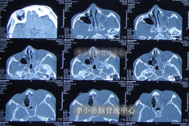 腰大池持续引流2天后即2011年7月1日,疑似有脑脊液鼻漏,查头部CT示未见明显异常(图-6)。
