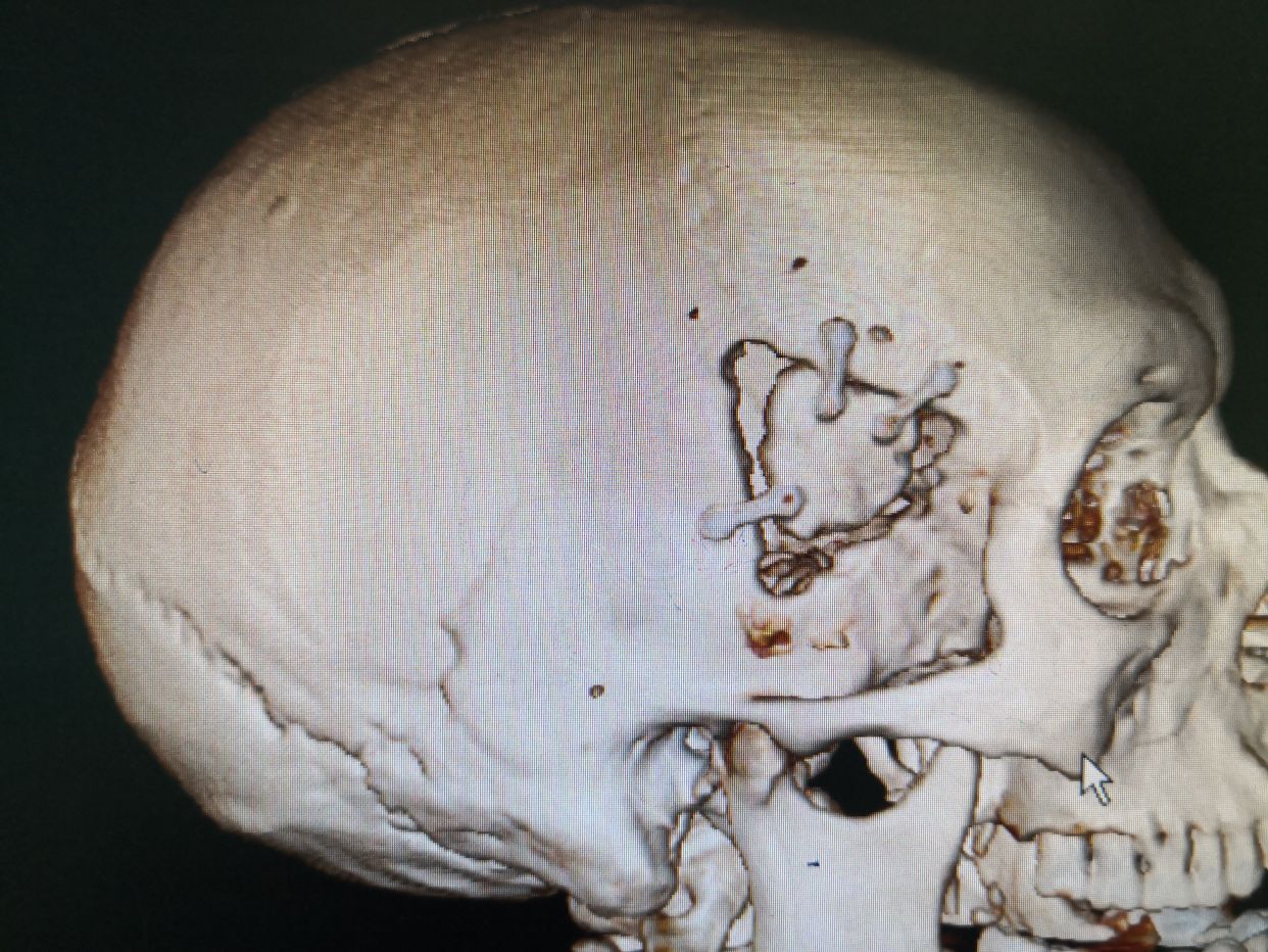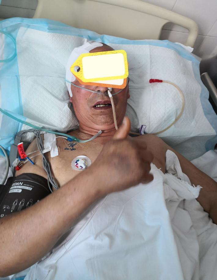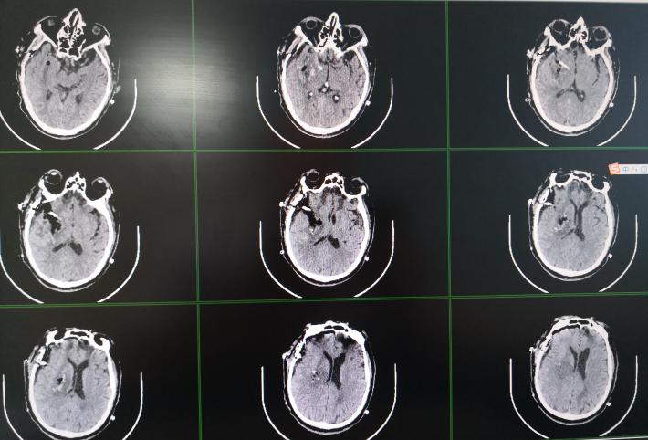 术后第五天,病人自行睁眼,能简单回答问题,右侧上下肢能遵嘱活动。左侧上下肢活动较术前改善。