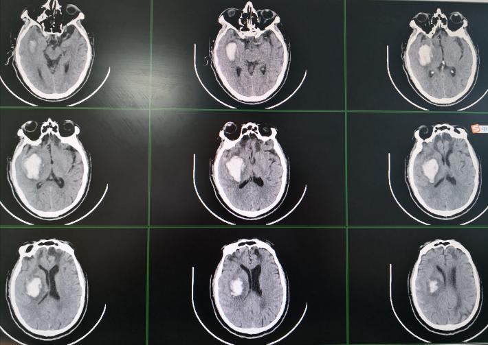 70岁男性,以“突发意识不清1天”从外院转入。1天前情绪激动时突然晕倒,失语,意识不清,左侧上、下肢体不能活动,在外院行头颅 CT:“右侧基底节脑出血”。既往无“高血压”病史,10余年前有“颅脑外伤”病史,平时左下肢跛行。腰椎骨折手术病史。查体:浅昏迷,GCS评分E3V1M4。刺激右侧上下肢能屈曲活动,左侧上下肢不能活动。双侧巴氏征阴性。