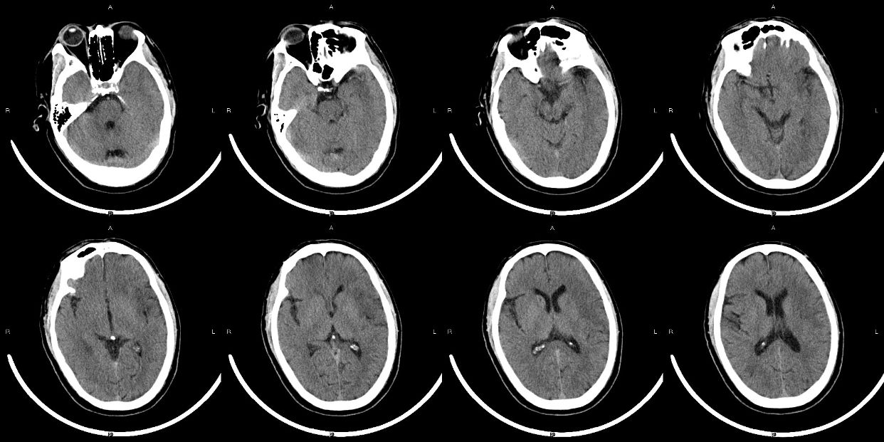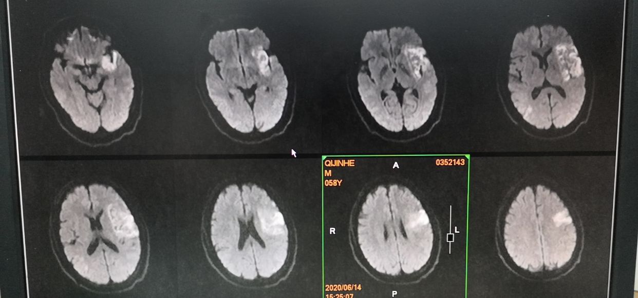 查体: 朦胧,烦躁, 失语,凝视,右侧肢体肌力1级,失语,左侧肢体肌力5级,右侧巴氏征阳性,NHISS 20。
