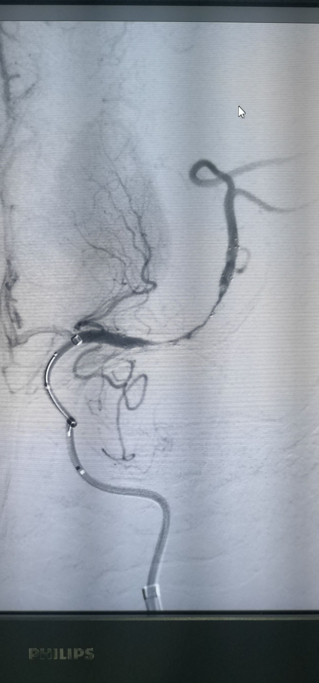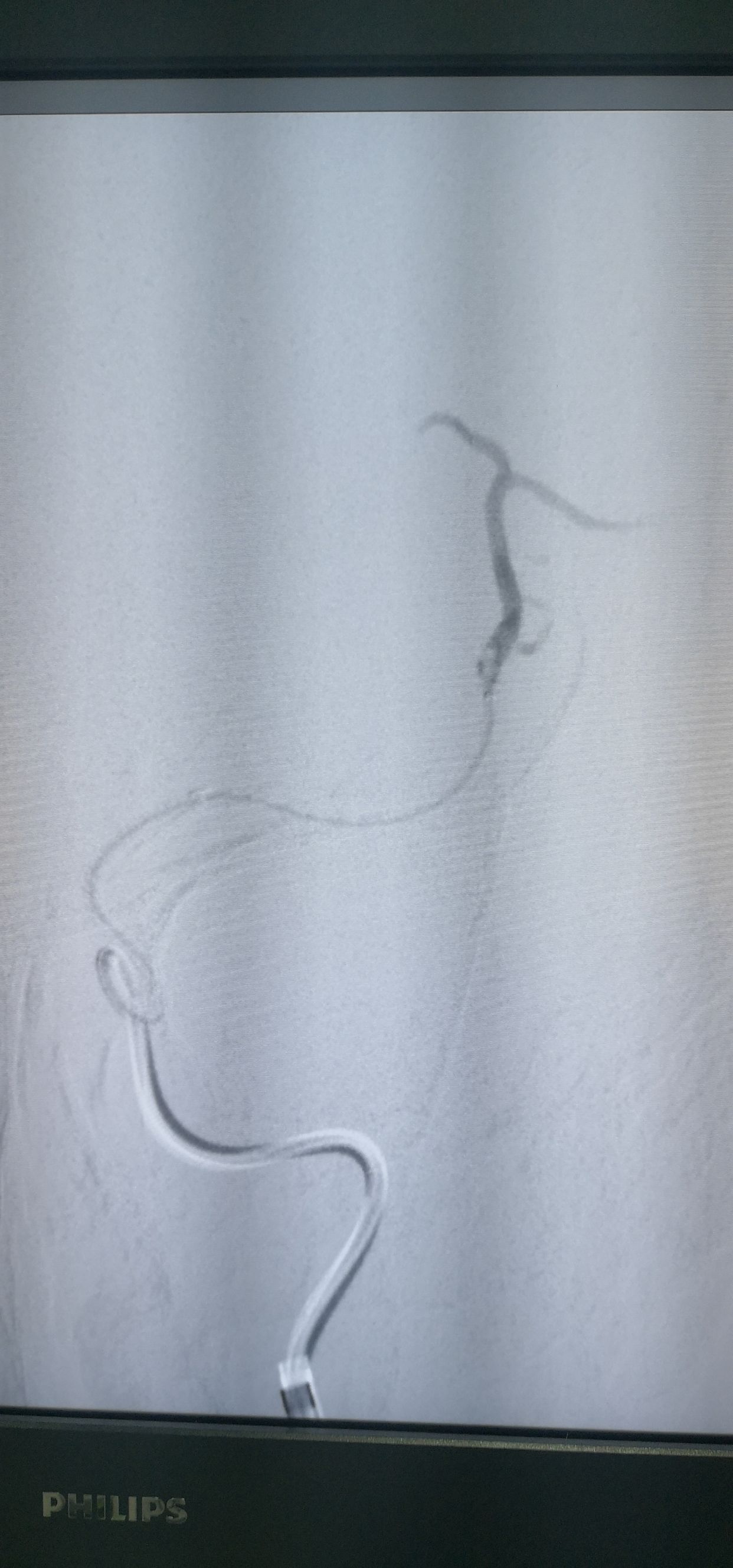 释放支架后造影,提示有下干充盈缺损