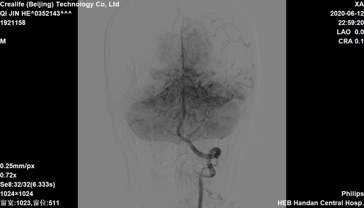 椎动脉造影,左侧软膜支有少量代偿