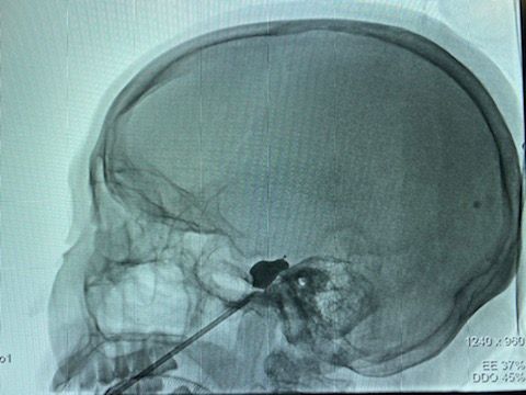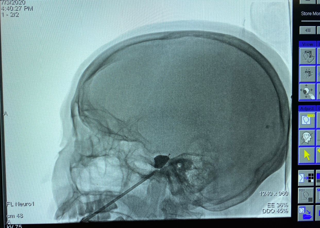 如果正常三叉神经痛患者,术中显示该球囊,术后效果疼痛缓解没问题,但该患者累及右侧头皮疼痛,所以,球囊导管需要再次调整。
