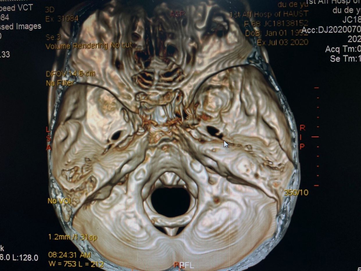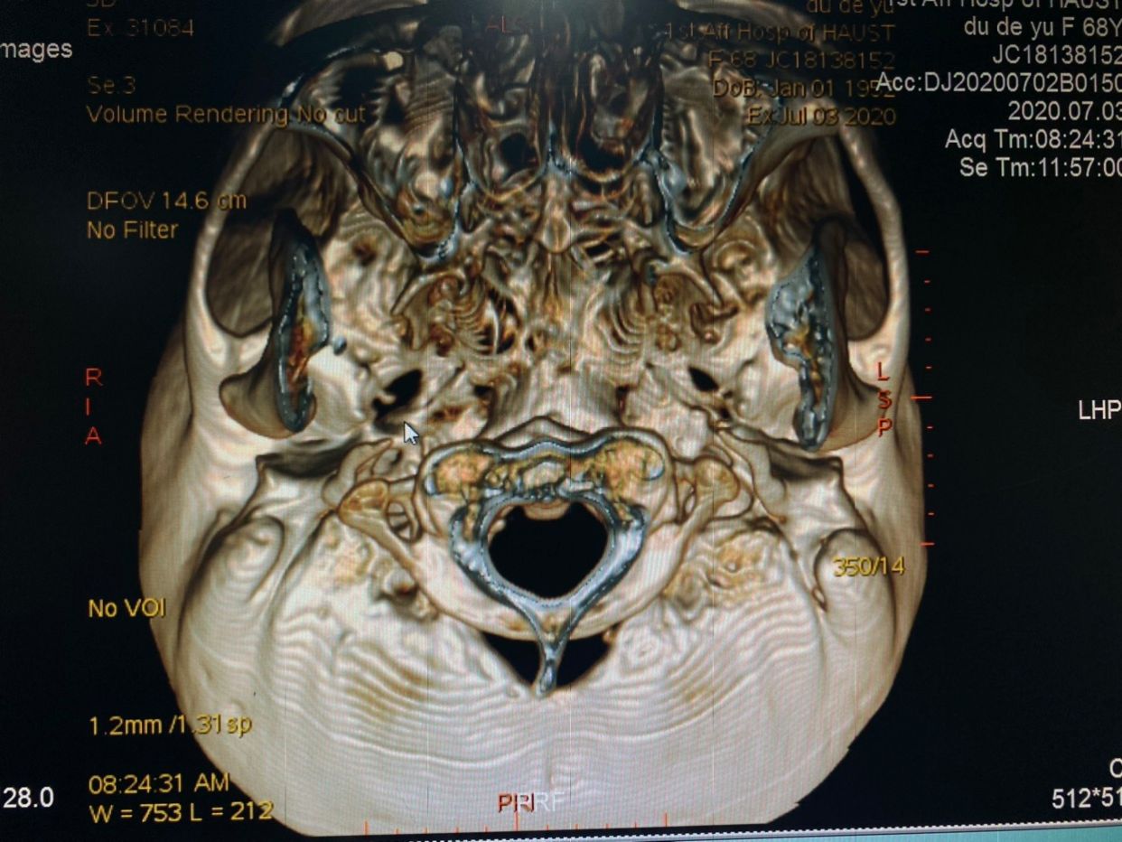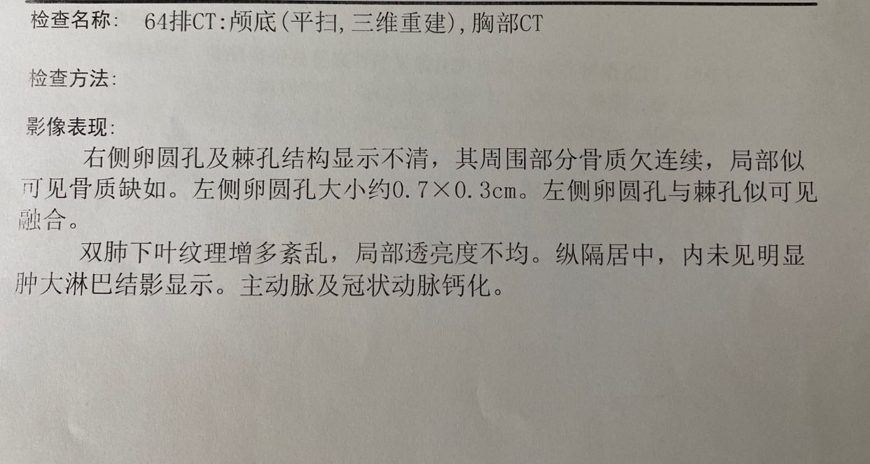 患者,女性,68岁,间断右侧颌面部疼痛40余年入院。查体:右侧V1-3支疼痛,累及右侧颞部头皮电击样疼痛。既往史:既往20年前行右侧三叉神经痛射频治疗两次,伽马刀治疗1次。术前行颅底CT检查,右侧卵圆孔破坏严重。