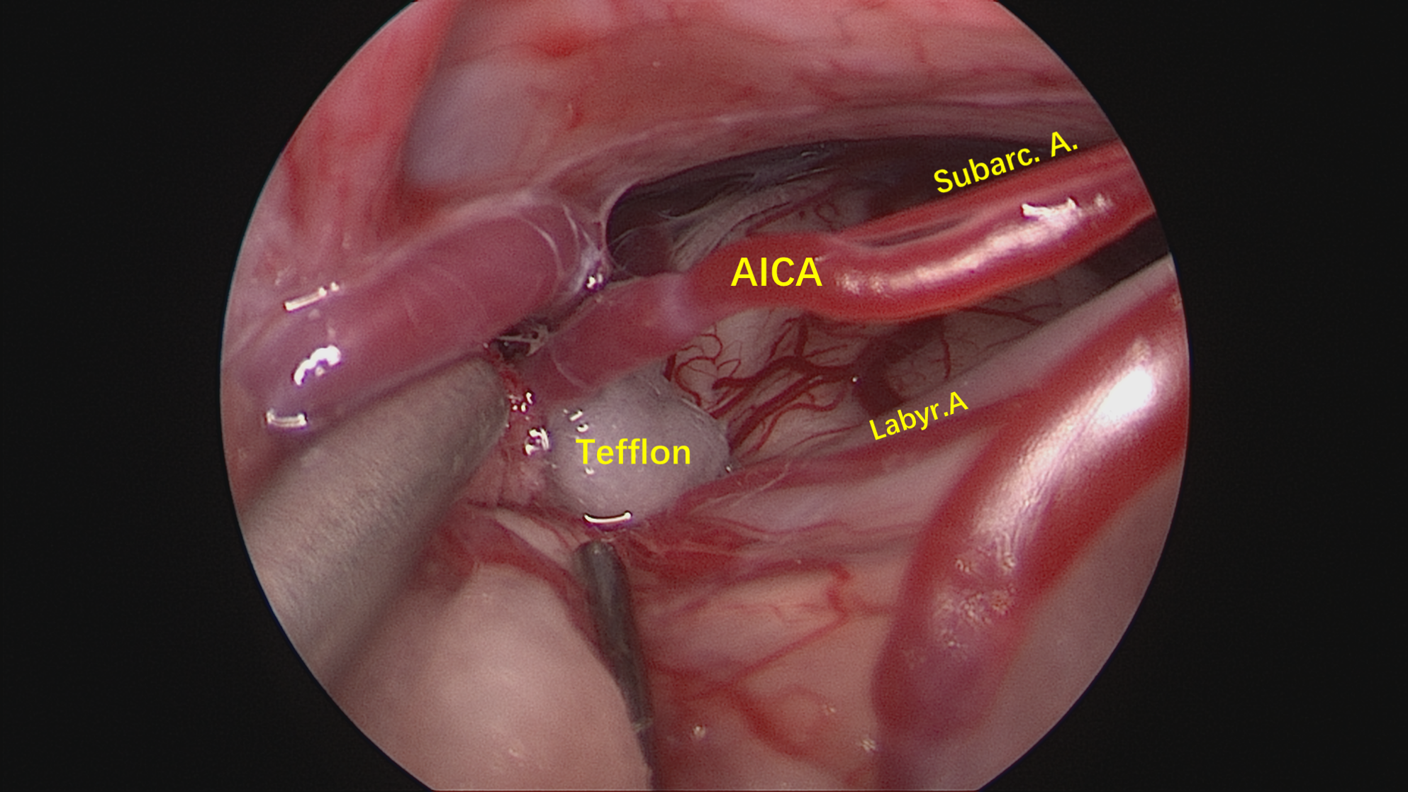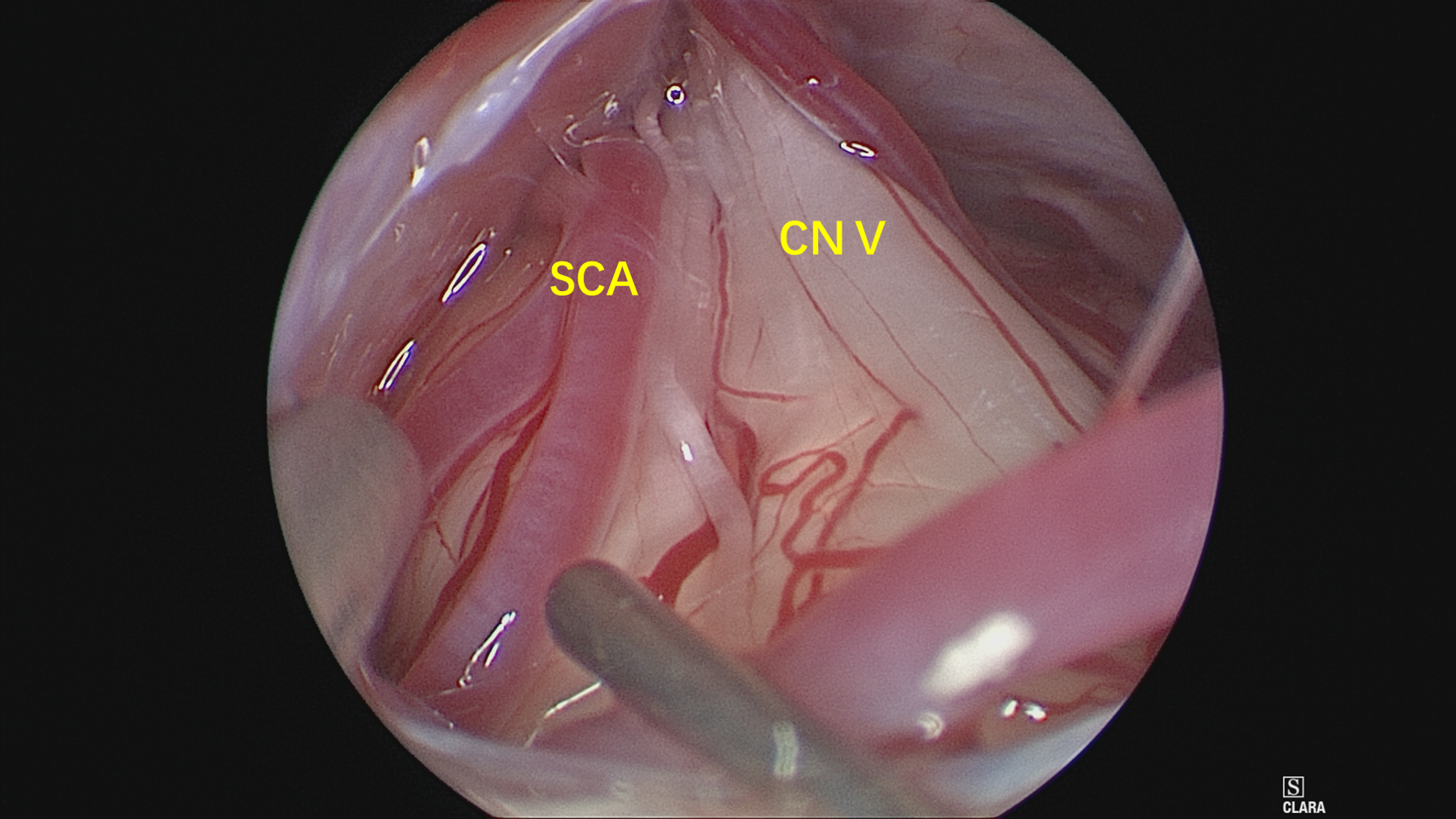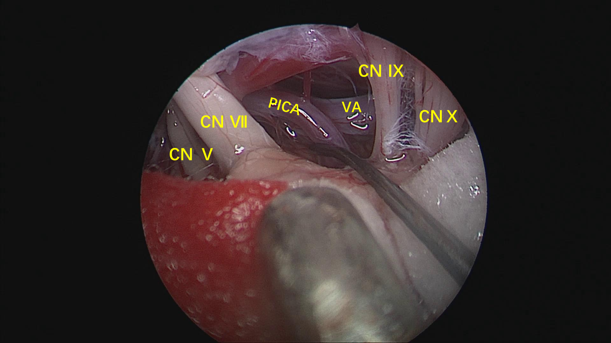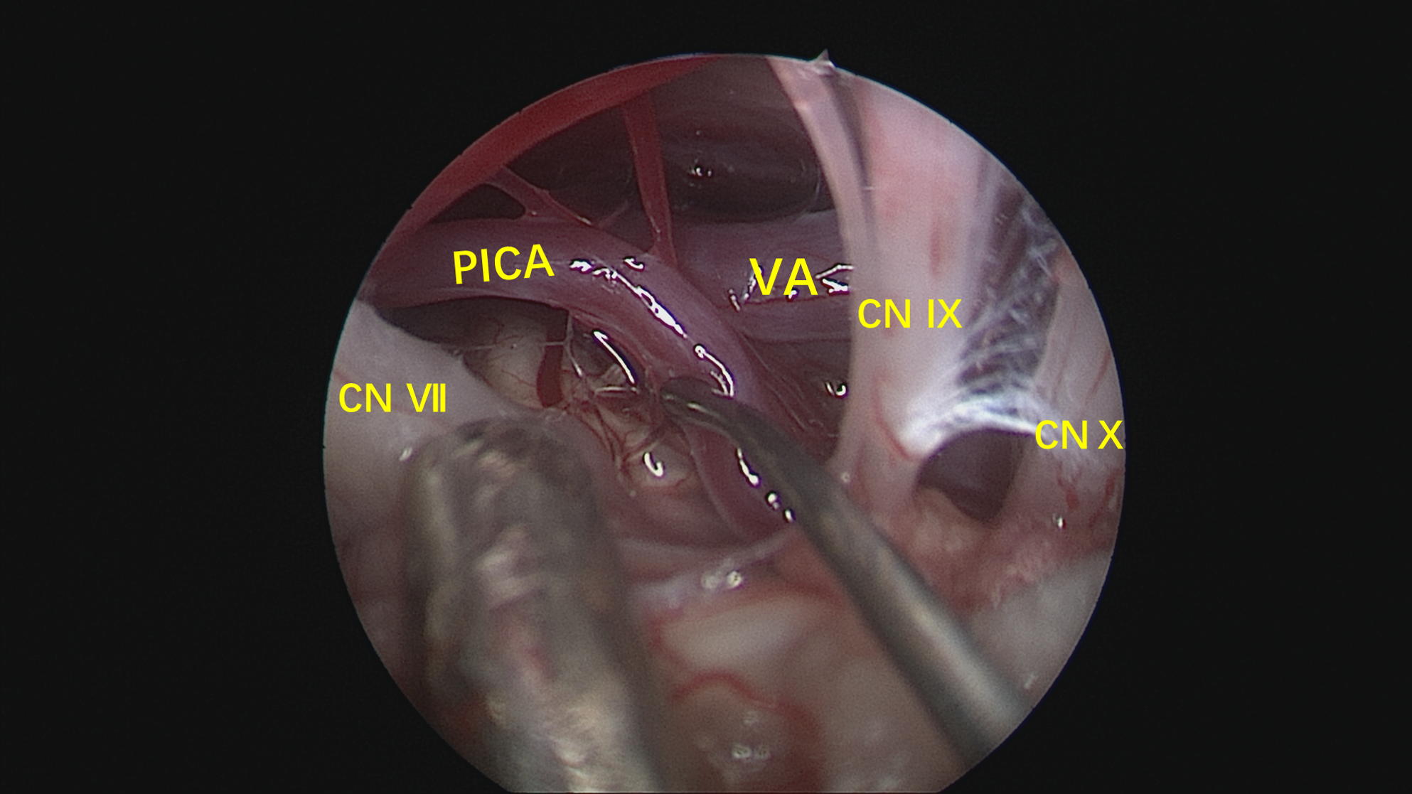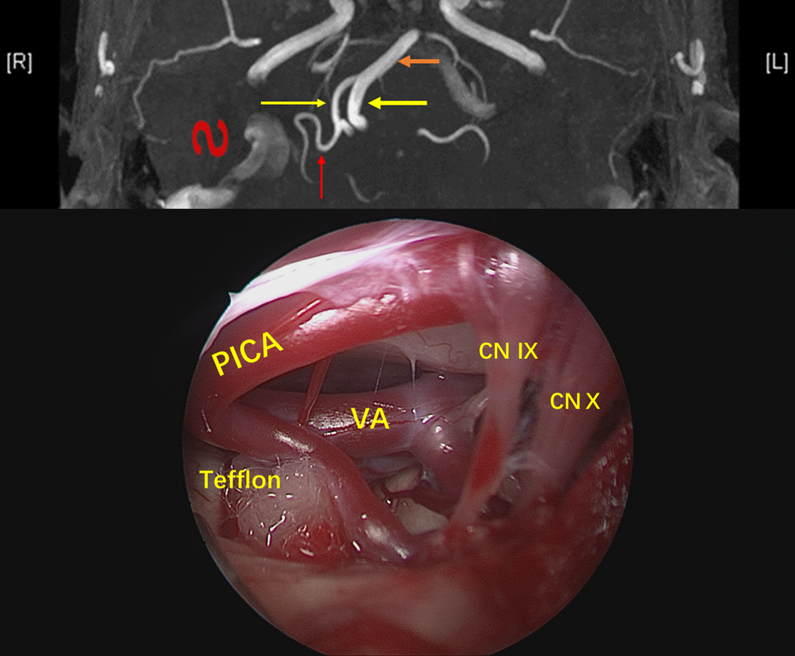 神经内镜抵近观察,与术前影像一致,PICA从VA发出后于下方呈袢,压迫面神经出脑干处。