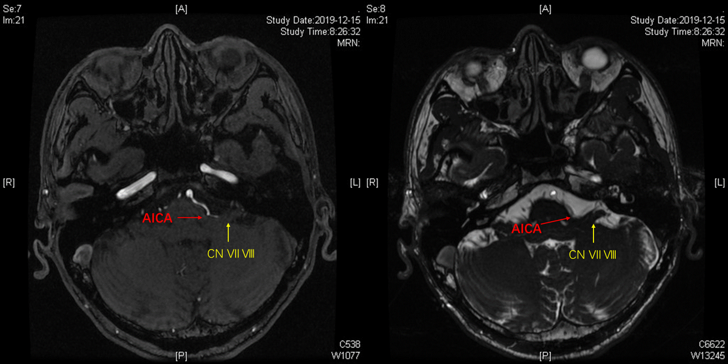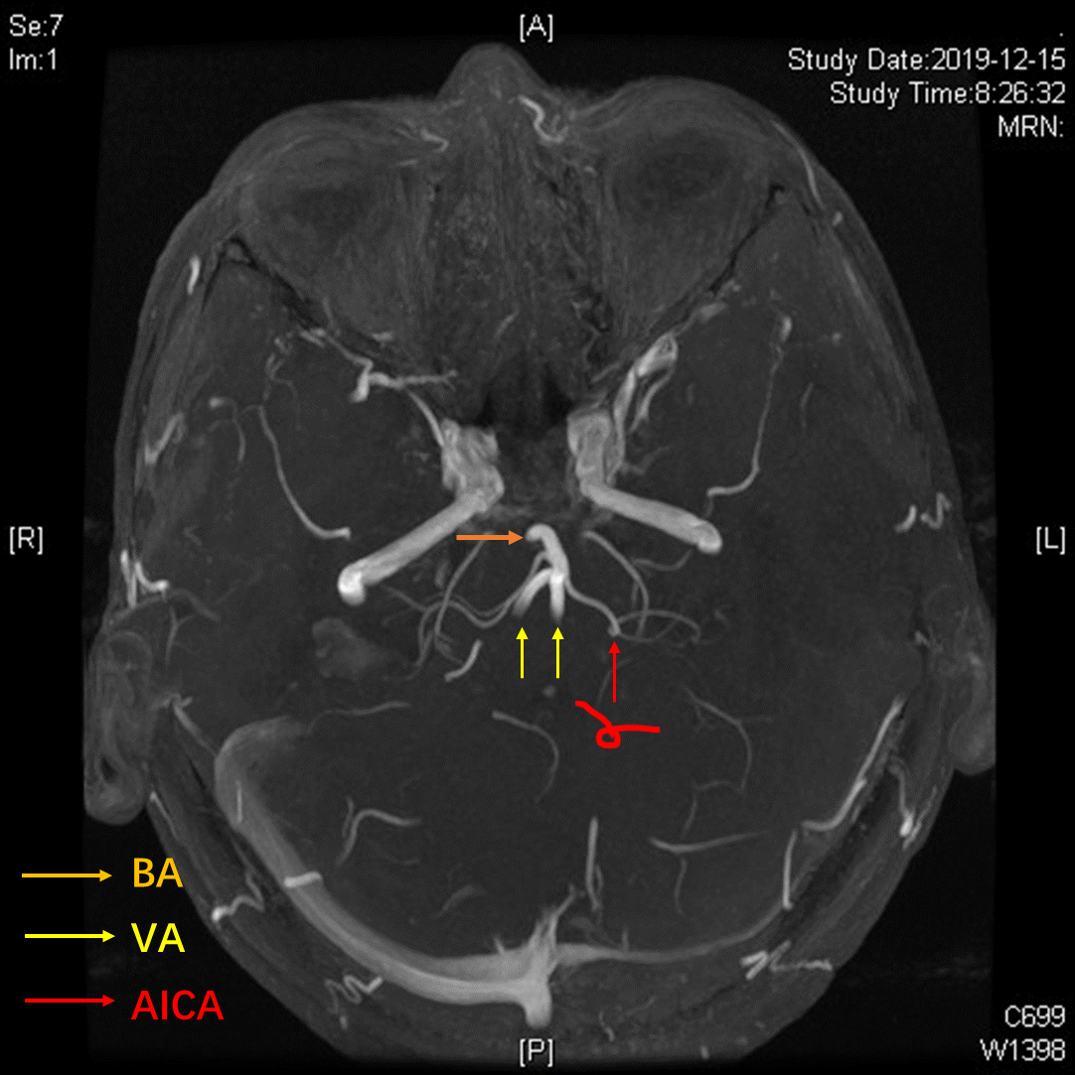 术前3D-TOF序列见左侧小脑前下动脉AICA从基底动脉发出,并弯曲成袢。