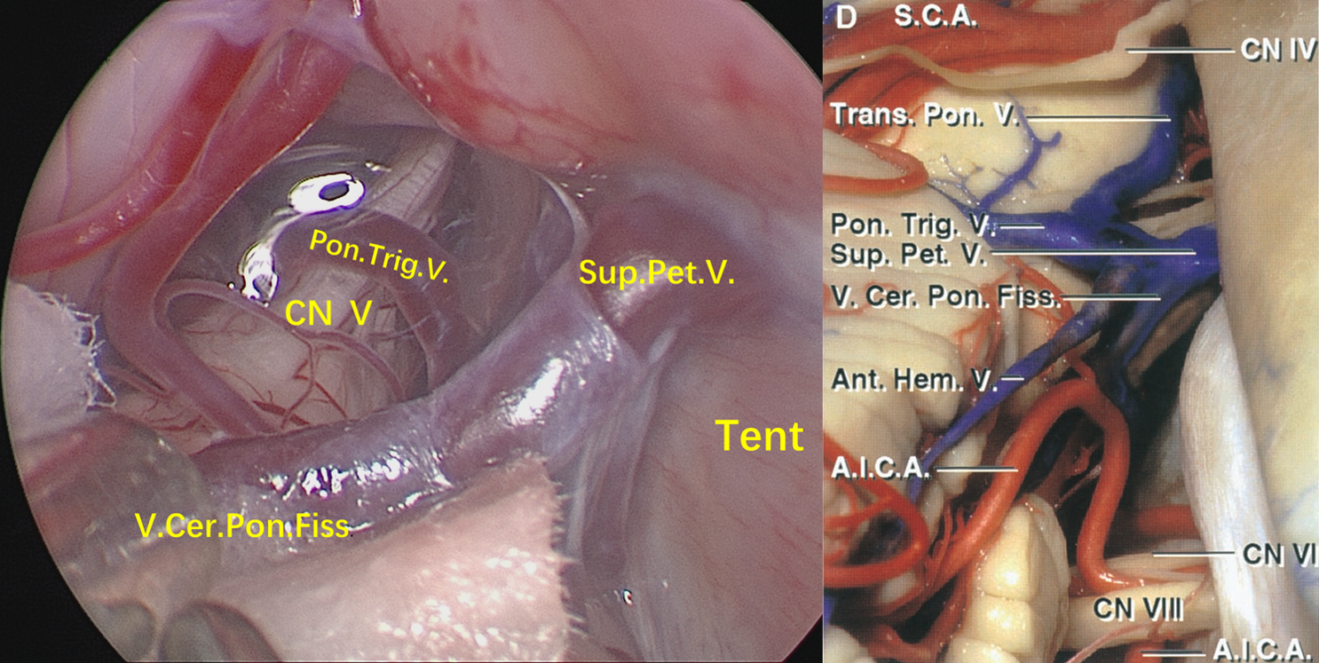 术中充分释放脑脊液,从面听神经与岩静脉之间的间隙观察三叉神经。