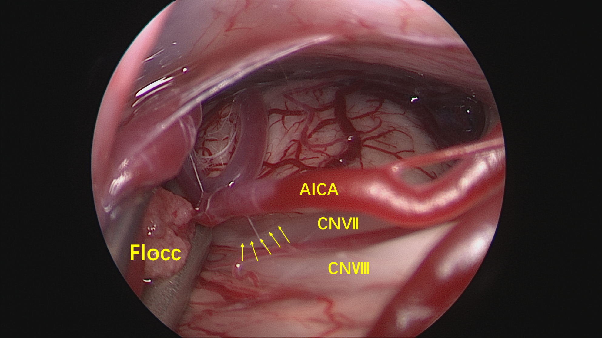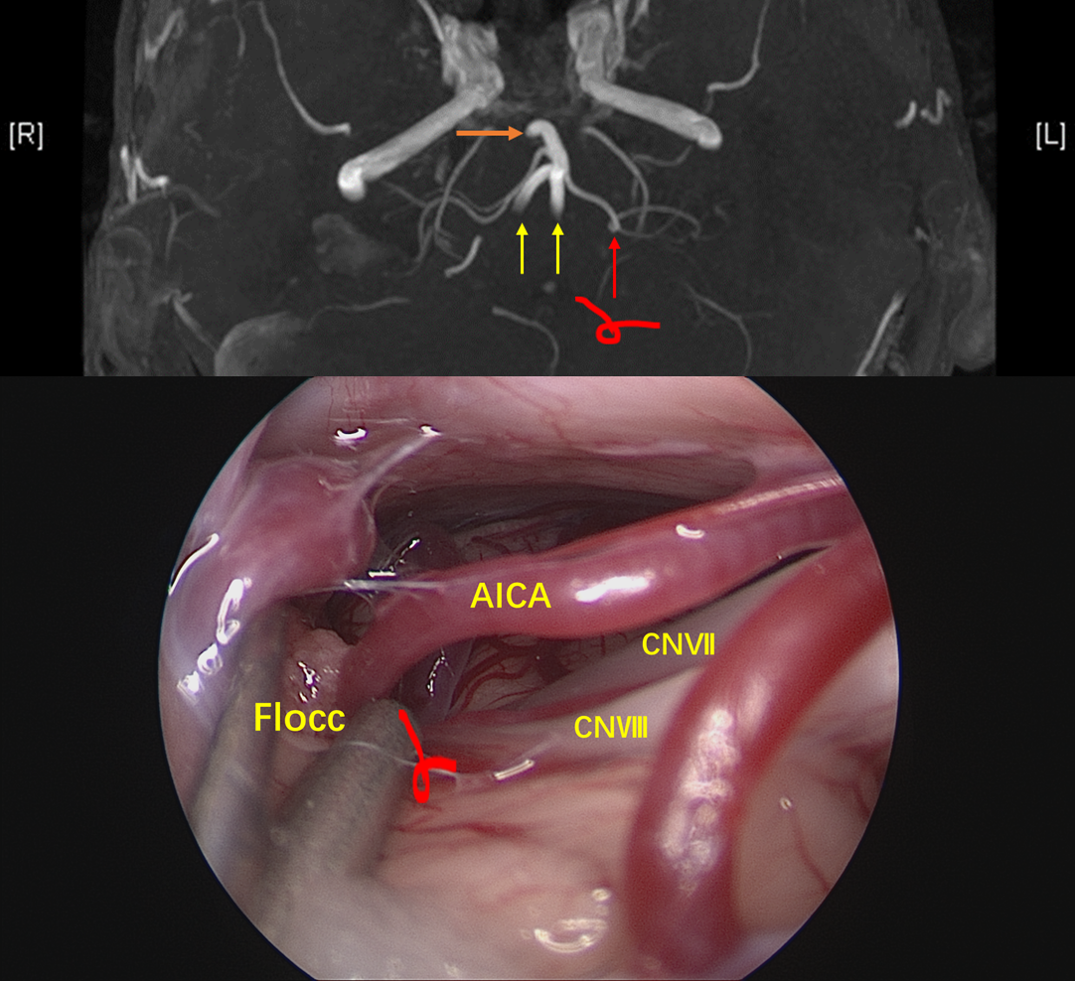 神经内镜经绒球下入路到桥小脑角区,可见AICA弯曲成袢压迫面神经出脑干处,与影像学所见一致。