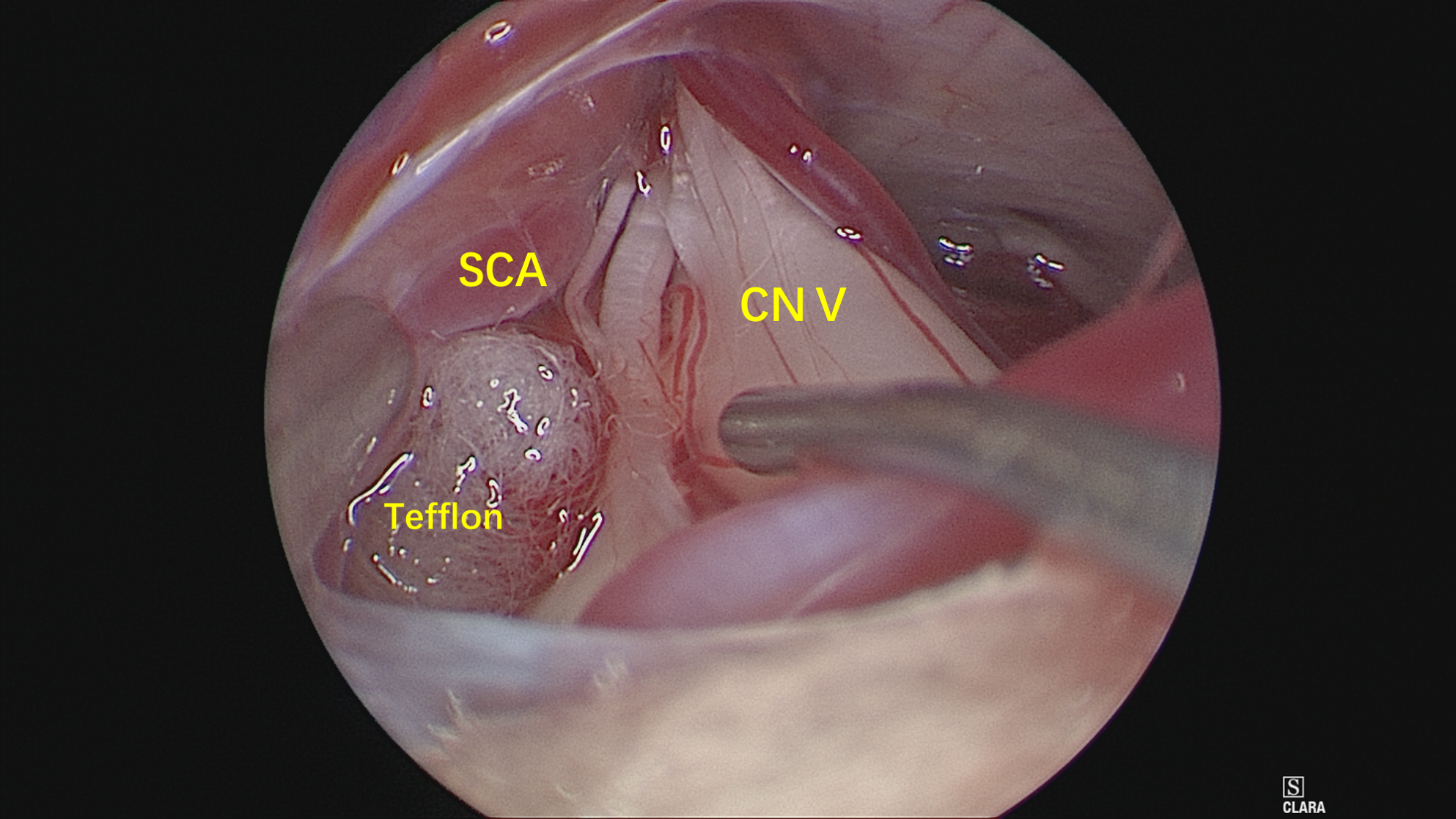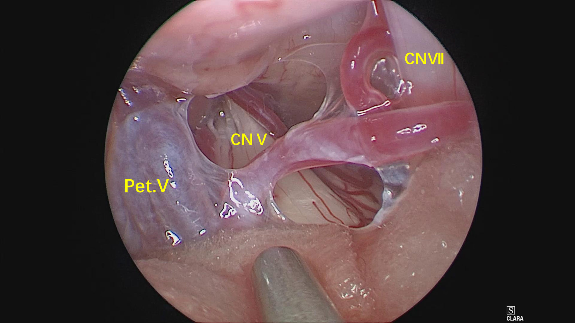 神经内镜抵近观察(岩静脉的阻挡迎刃而解,内镜的优势体现),岩骨、SCA与三叉神经紧贴,减压空间较小。